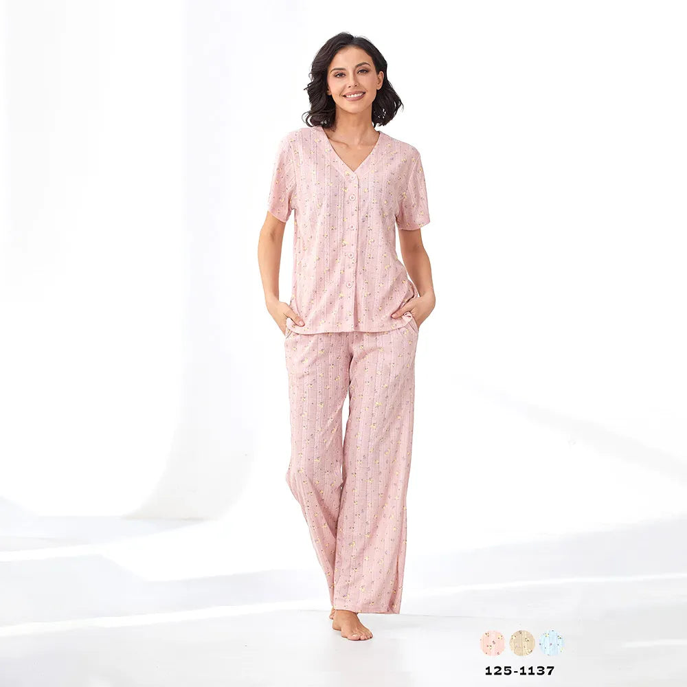 أضيفي هذا الطقم الرائع إلى ملابسك المنزلية، مكون من بلوزة وبنطلون بيجاما، ومزين بطبعات جميلة