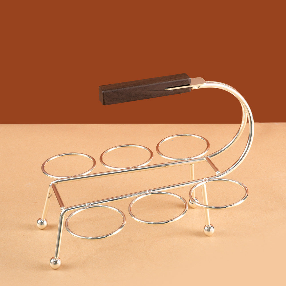 حامل الفناجين بتصميم أنيق يجمع بين المتانة والجمال، مصنوع من إطار معدني قوي مع مقبض خشبي أنيق لسهولة الحمل. يحتوي على أربعة أماكن دائرية لحفظ الفناجين بشكل منظم، مما يجعله مثاليًا للتقديم والتخزين بأسلوب راقٍ.