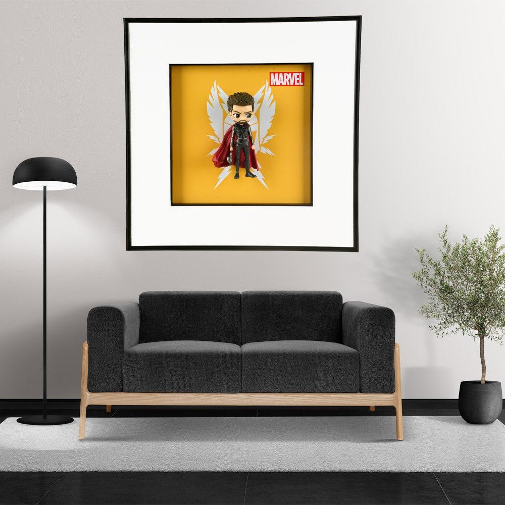 اجعل جدران منزلك تنبض بقوة أبطال مارفل الخارقين مع هذا الإطار الفني الرائع الذي يجسد شخصية "ثور" بأسلوب كرتوني ثلاثي الأبعاد، مرتديًا عباءته الحمراء الشهيرة وأجنحة خلفية تضفي إحساسًا بالقوة الأسطورية.
