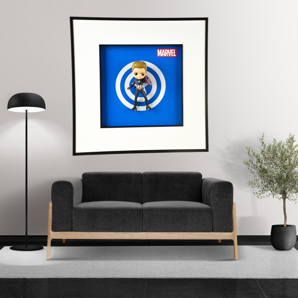 زيّن جدار منزلك أو مكتبك بهذا الإطار الفني المميز بقياس 80 سم ارتفاع × 60 سم طول، والذي يعرض شخصية "كابتن أمريكا" بأسلوب كرتوني ثلاثي الأبعاد وخلفية زرقاء بنمط دائري جذاب مستوحى من درعه الشهير. الإطار مصمم بعناية بإطار أسود أنيق مع مساحة بيضاء داخلية تبرز العمل الفني بشكل لافت.