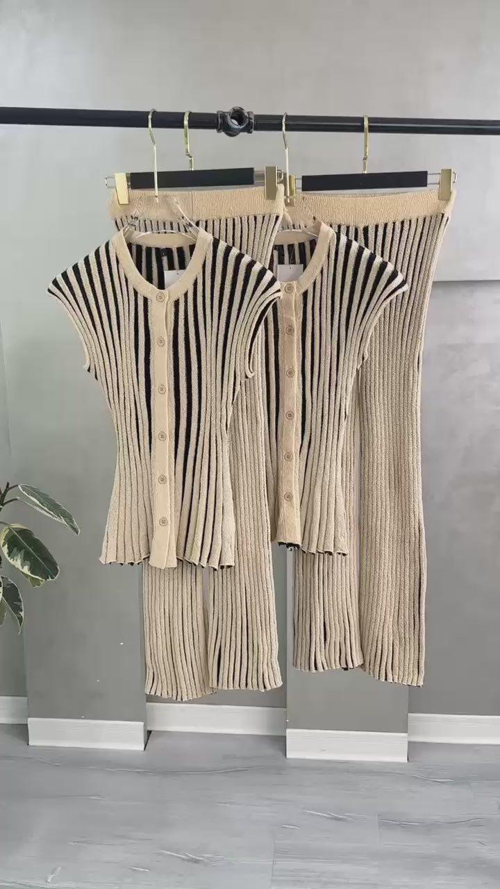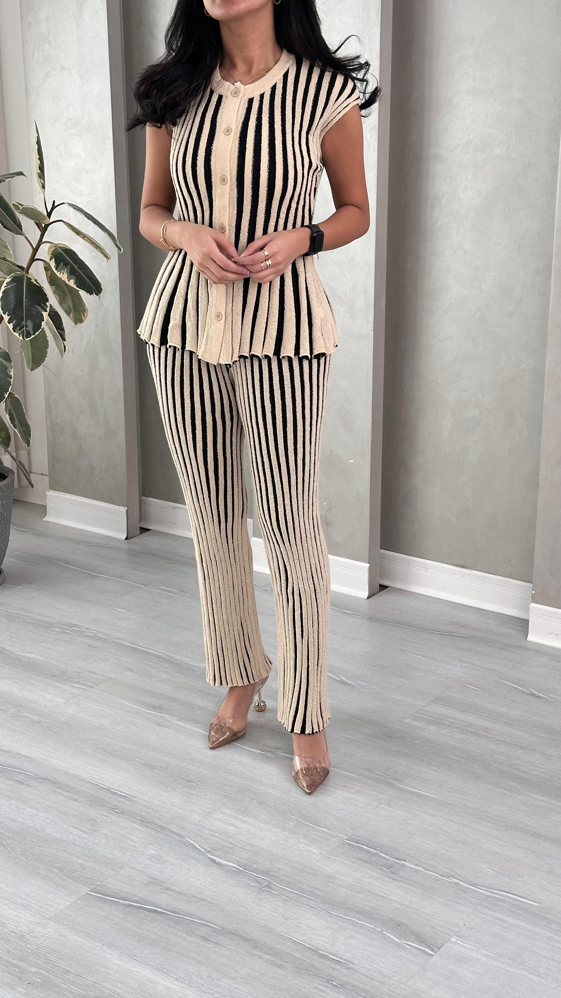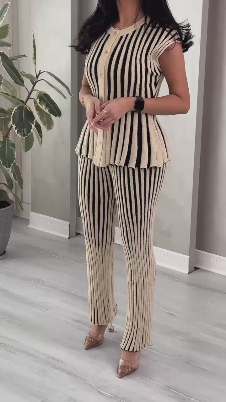 طقم صيفي أنيق يجمع بين اللمسة العصرية والمقاس العملي والمريح. تصميم جذاب بنقش الخطوط الذي يضفي بعداً طولياً ويمنحكِ مظهراً أكثر رشاقة. قطعة أساسية متكاملة تضمن لكِ إطلالة مصقولة وجذابة في المناسبات الصباحية أو المسائية.