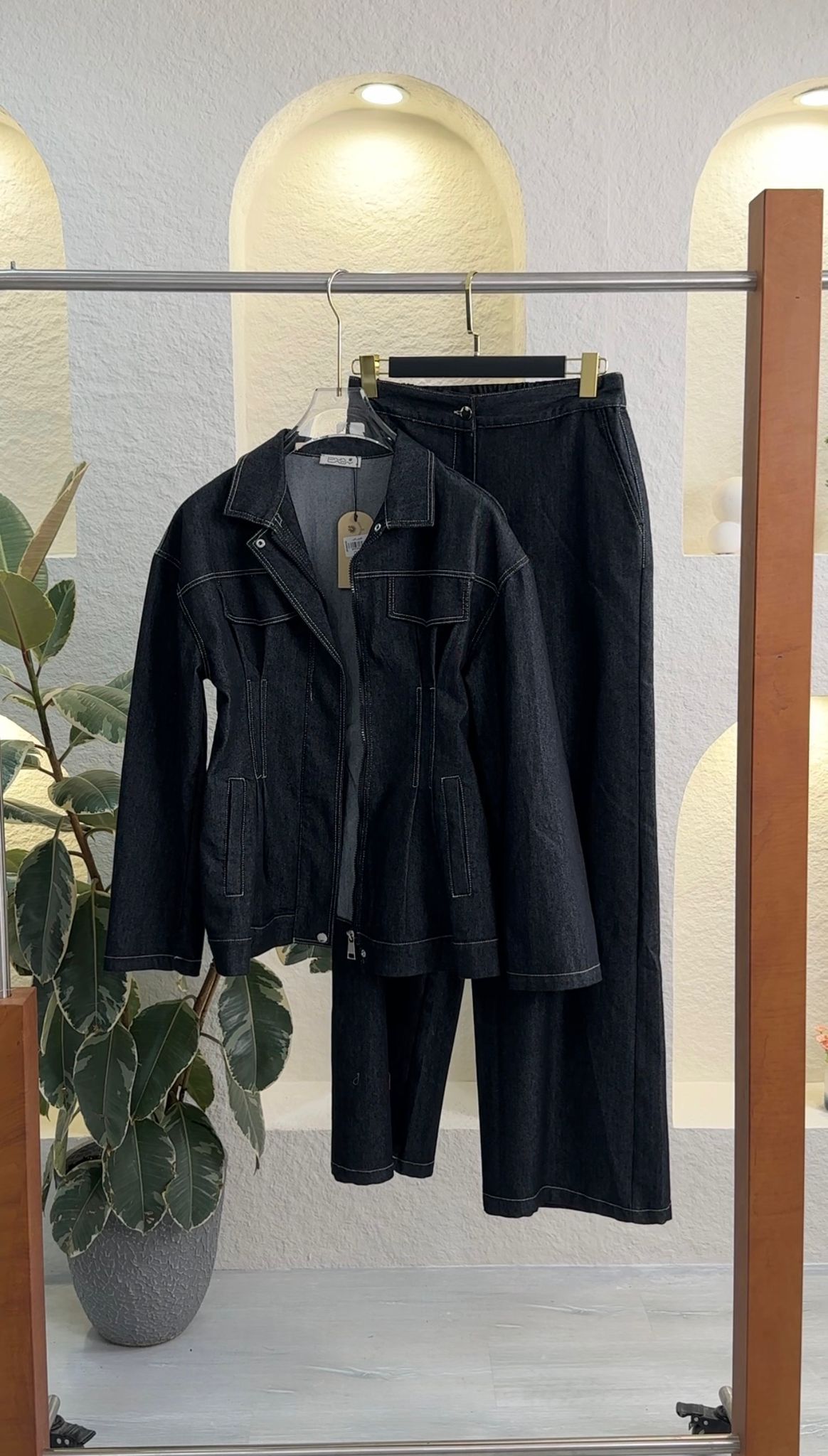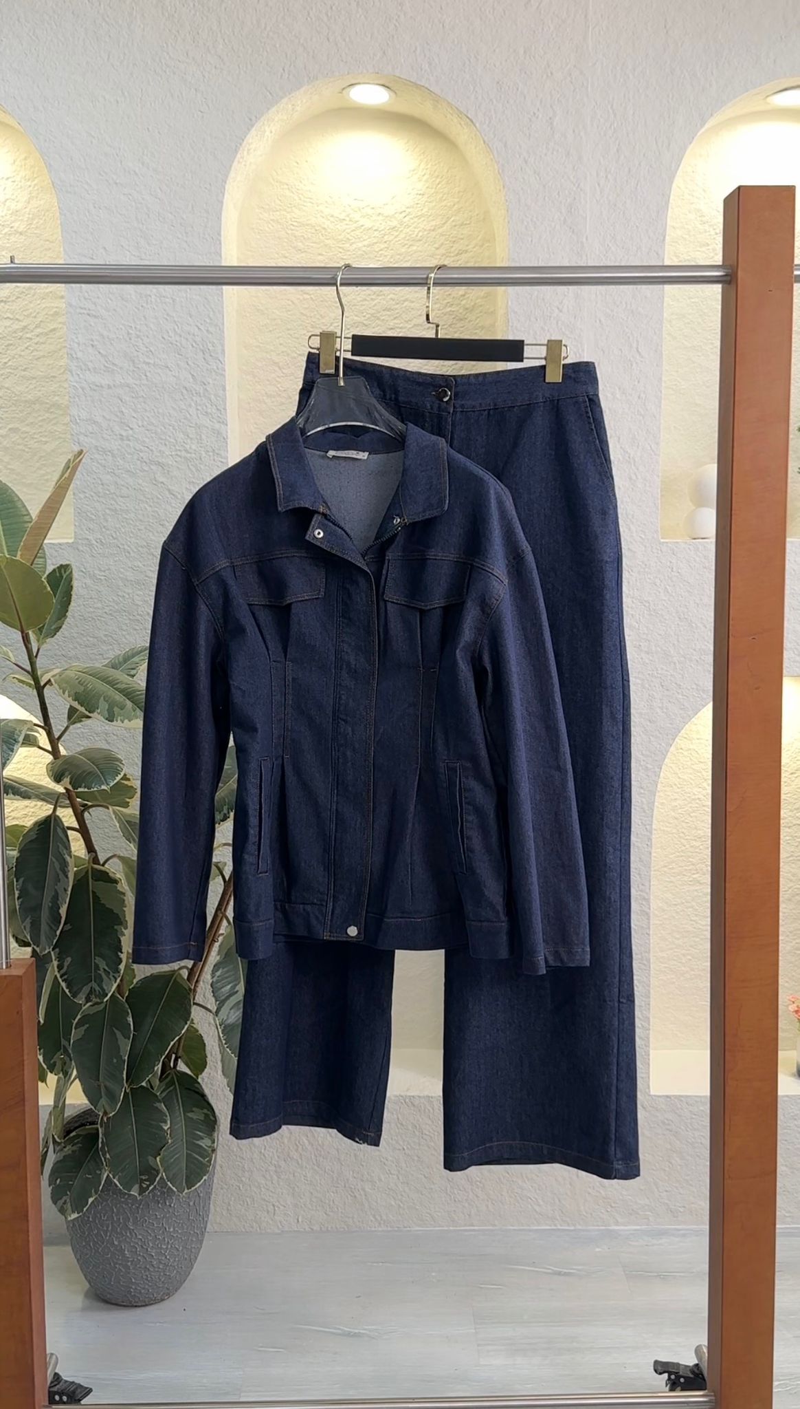 طقم جينز عصري من قطعتين، يتكون من جاكيت بتصميم مهيكل بسحاب أمامي وبنطال واسع الساق بخصر عالٍ. مصمم بخطوط أنيقة وخياطة دقيقة لإطلالة يومية أنيقة وراقية. يضمن القماش الناعم والمتين الراحة مع الحفاظ على شكل أنيق - مثالي للنزهات غير الرسمية أو لإطلالة عصرية أنيقة.