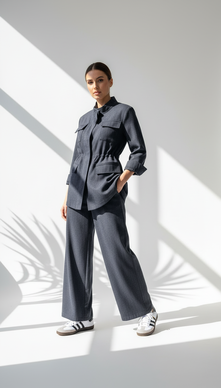 الستايل: طقم عصري مكون من قطعتين (جاكيت قصير وبنطال واسع الساقين).