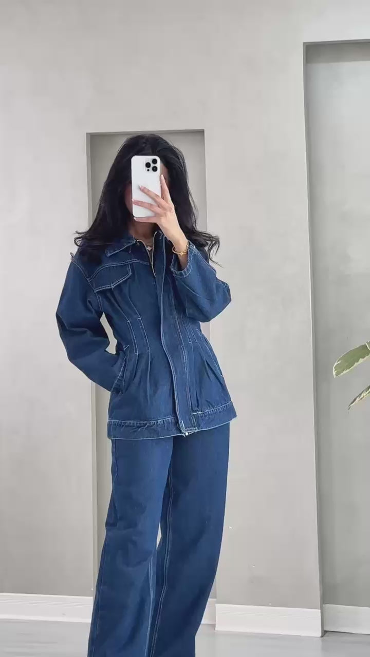 - **جاكيت بسحاب أمامي**: تصميمه مستقيم، يحتوي على جيبين بغطاء على الصدر وجيوب جانبية عملية.