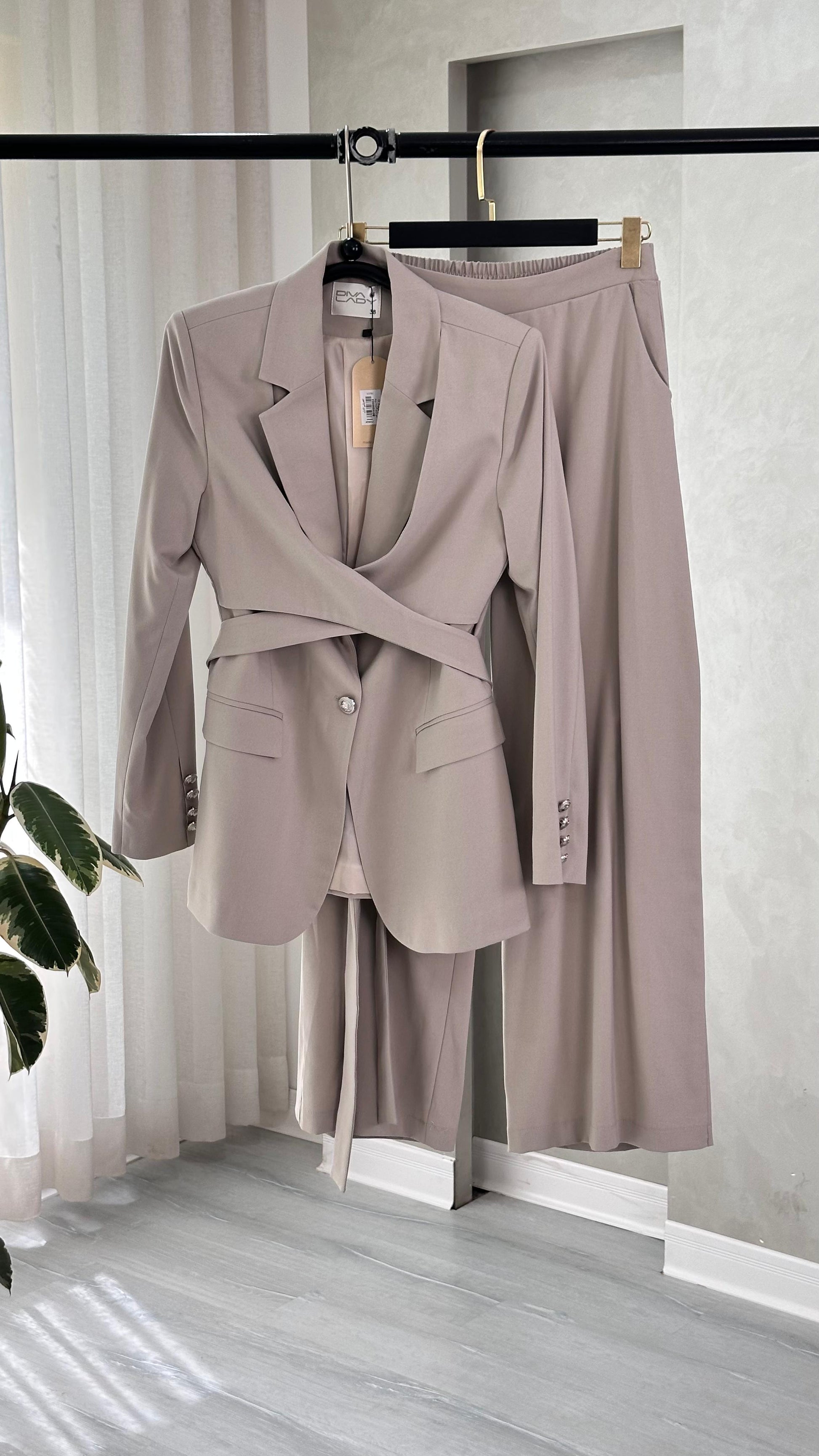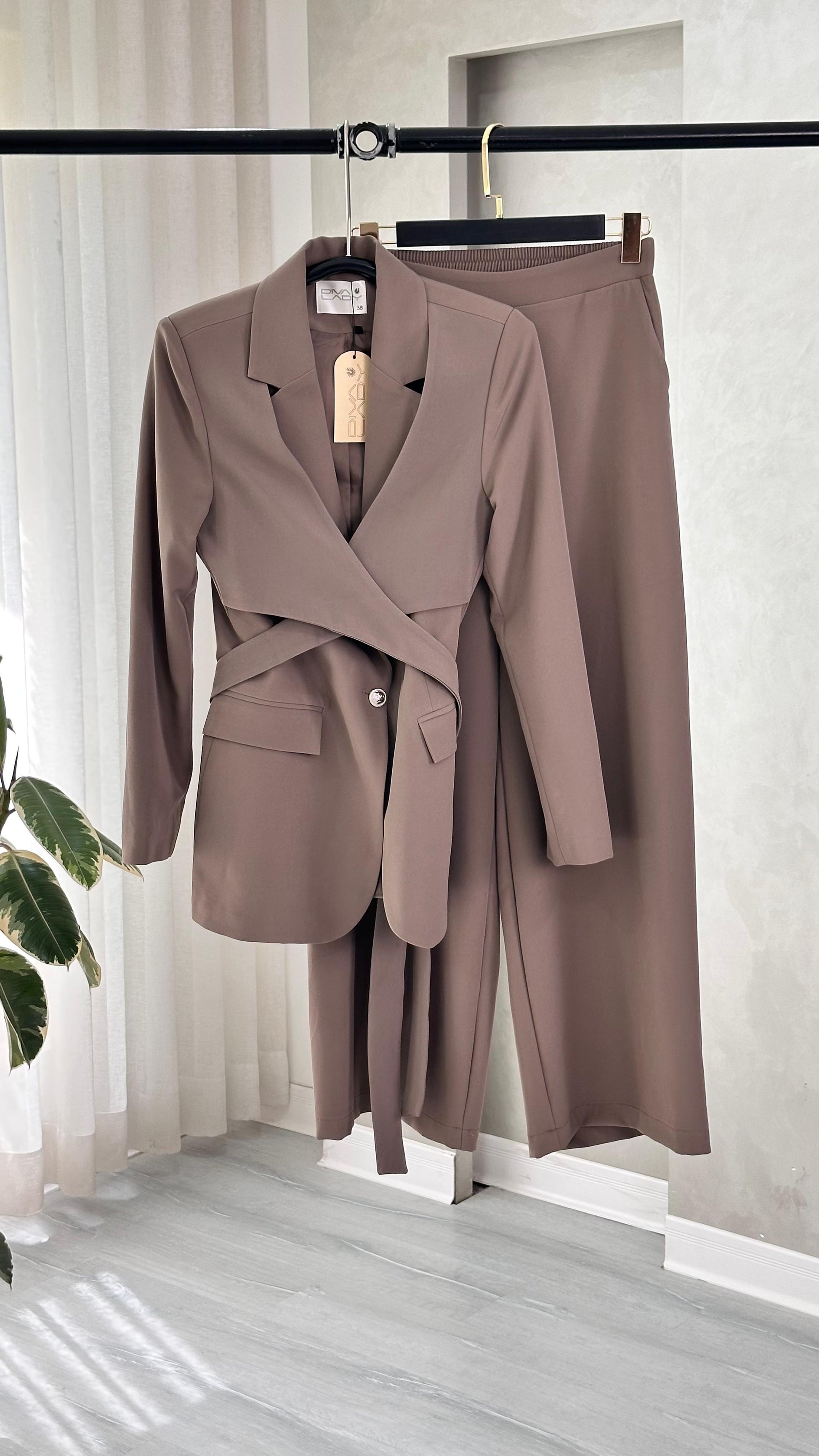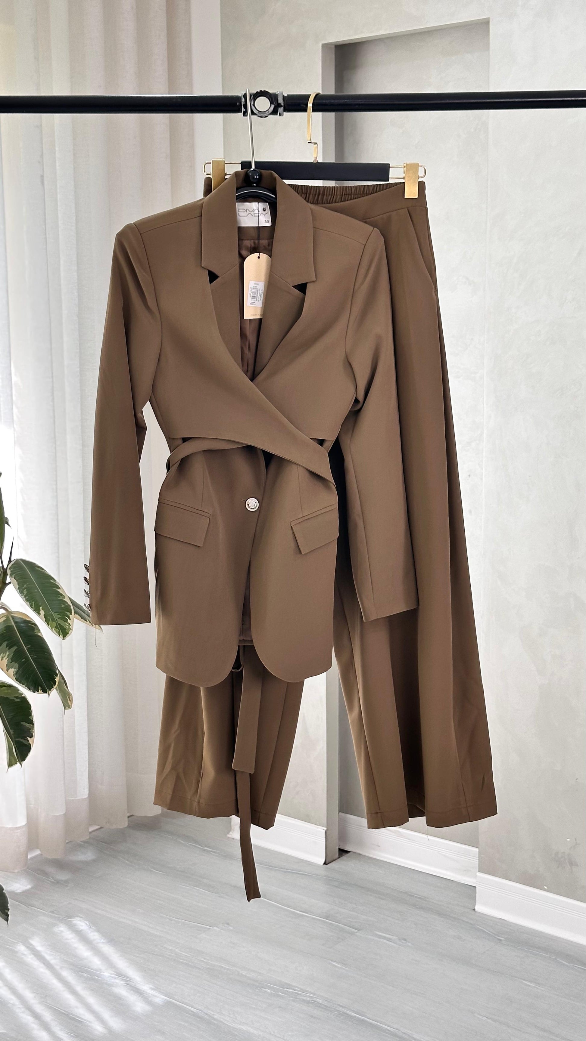 الجاكيت: بقصة رسمية بياقة مسننة، وبتصميم ملفوف (Wrap-style) يغلق بحزام عريض أنيق يحدد الخصر بشكل أنثوي ومميز.
