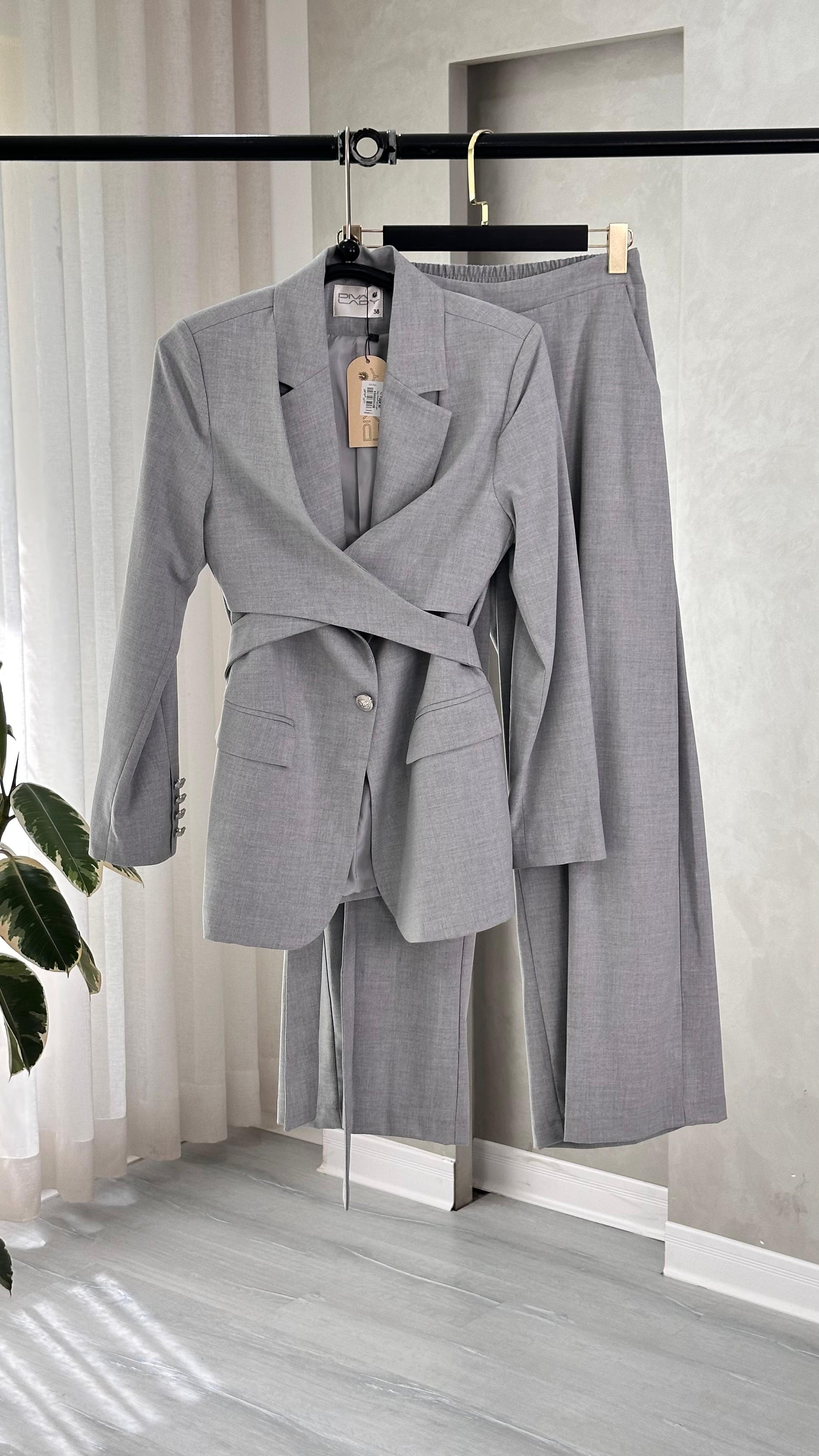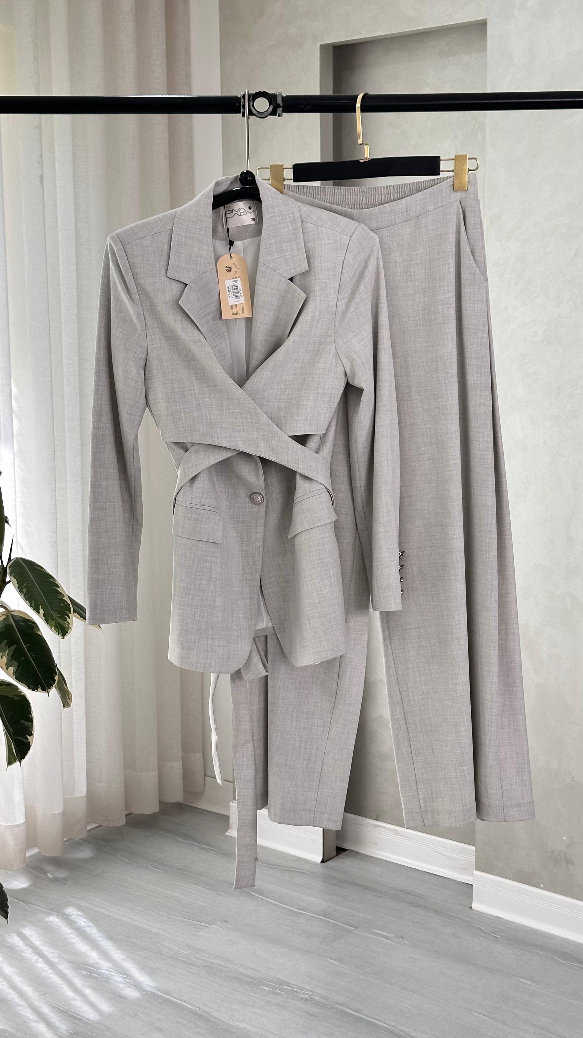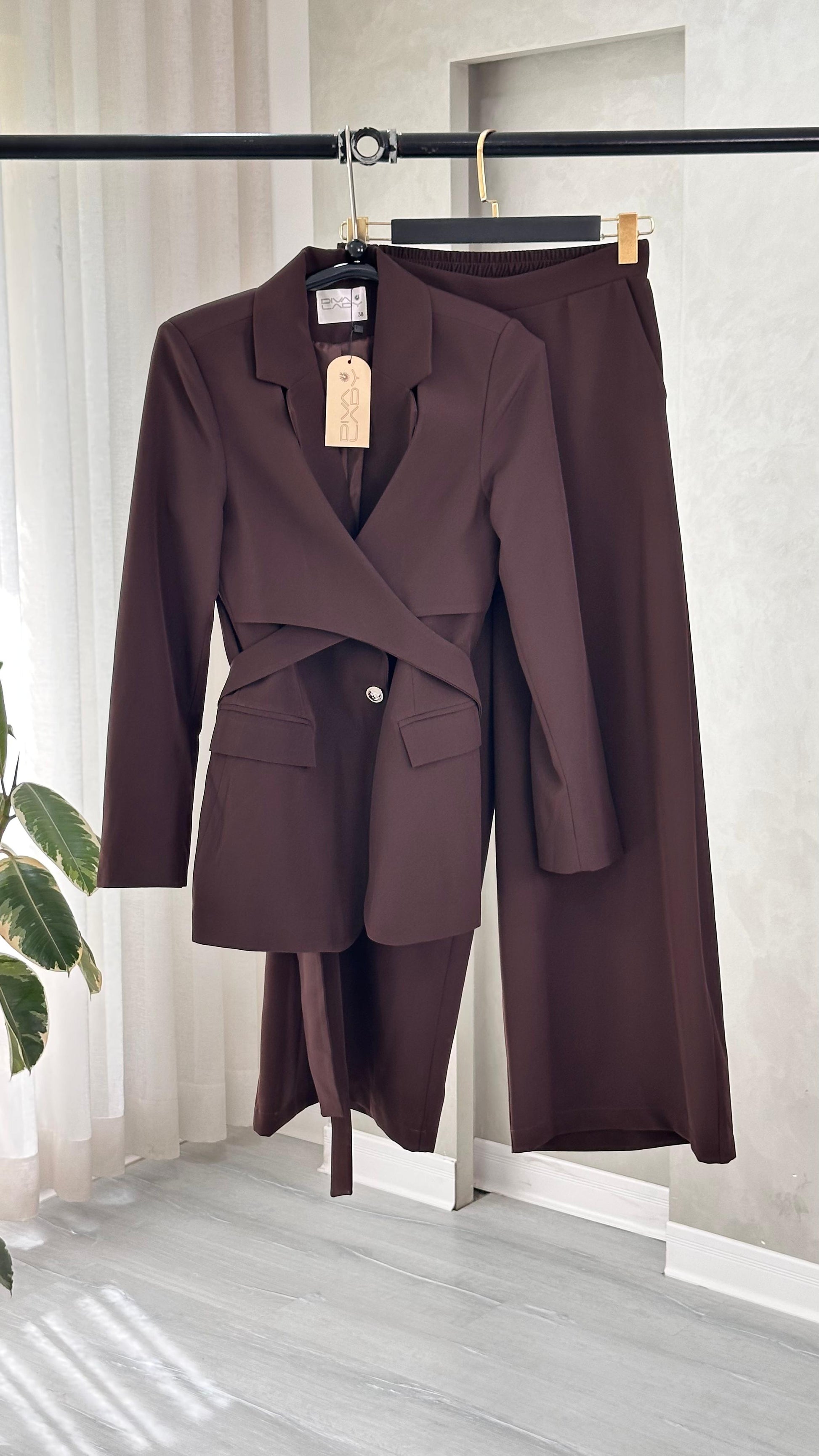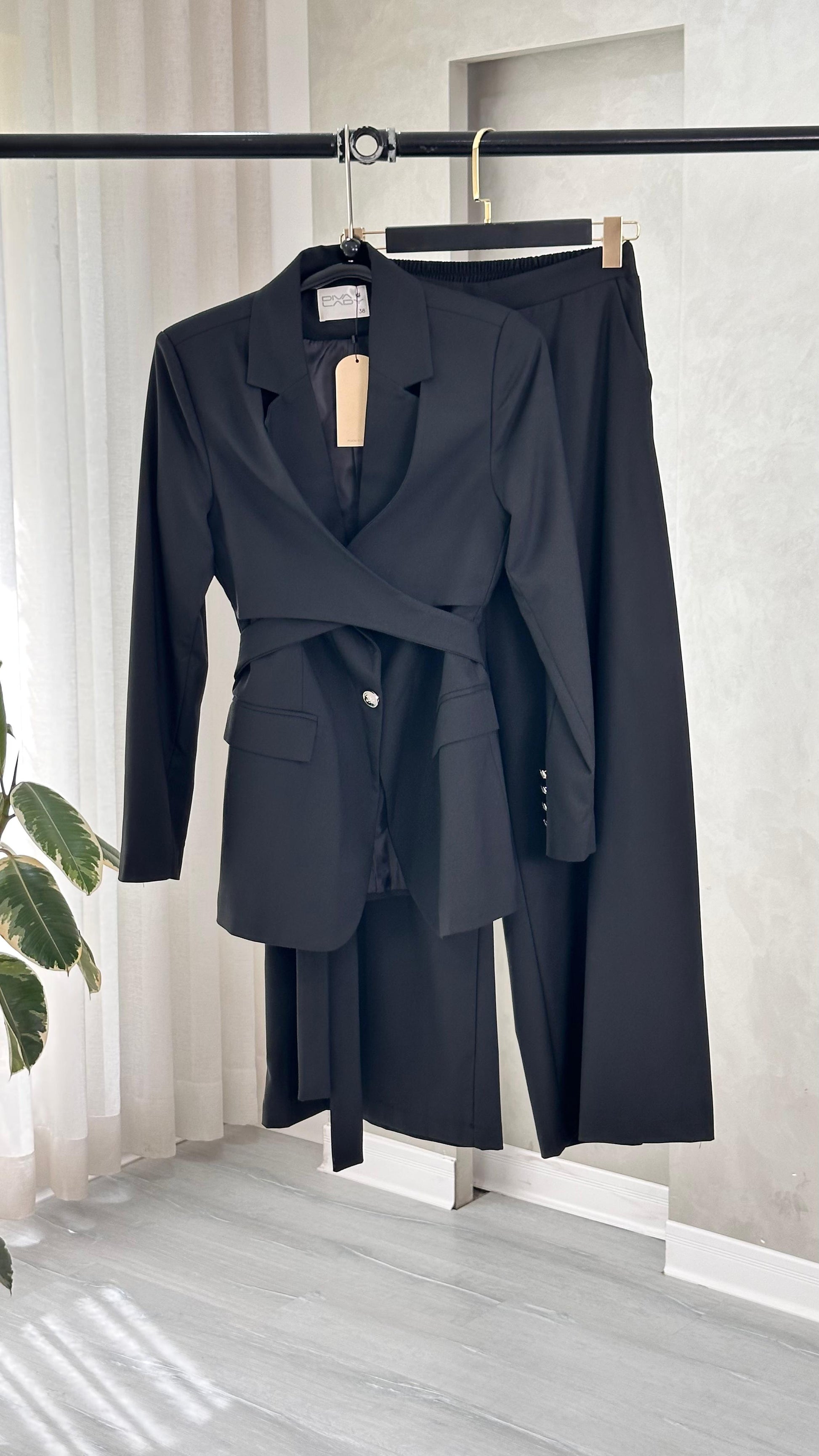 الجاكيت: بقصة رسمية بياقة مسننة، وبتصميم ملفوف (Wrap-style) يغلق بحزام عريض أنيق يحدد الخصر بشكل أنثوي ومميز.