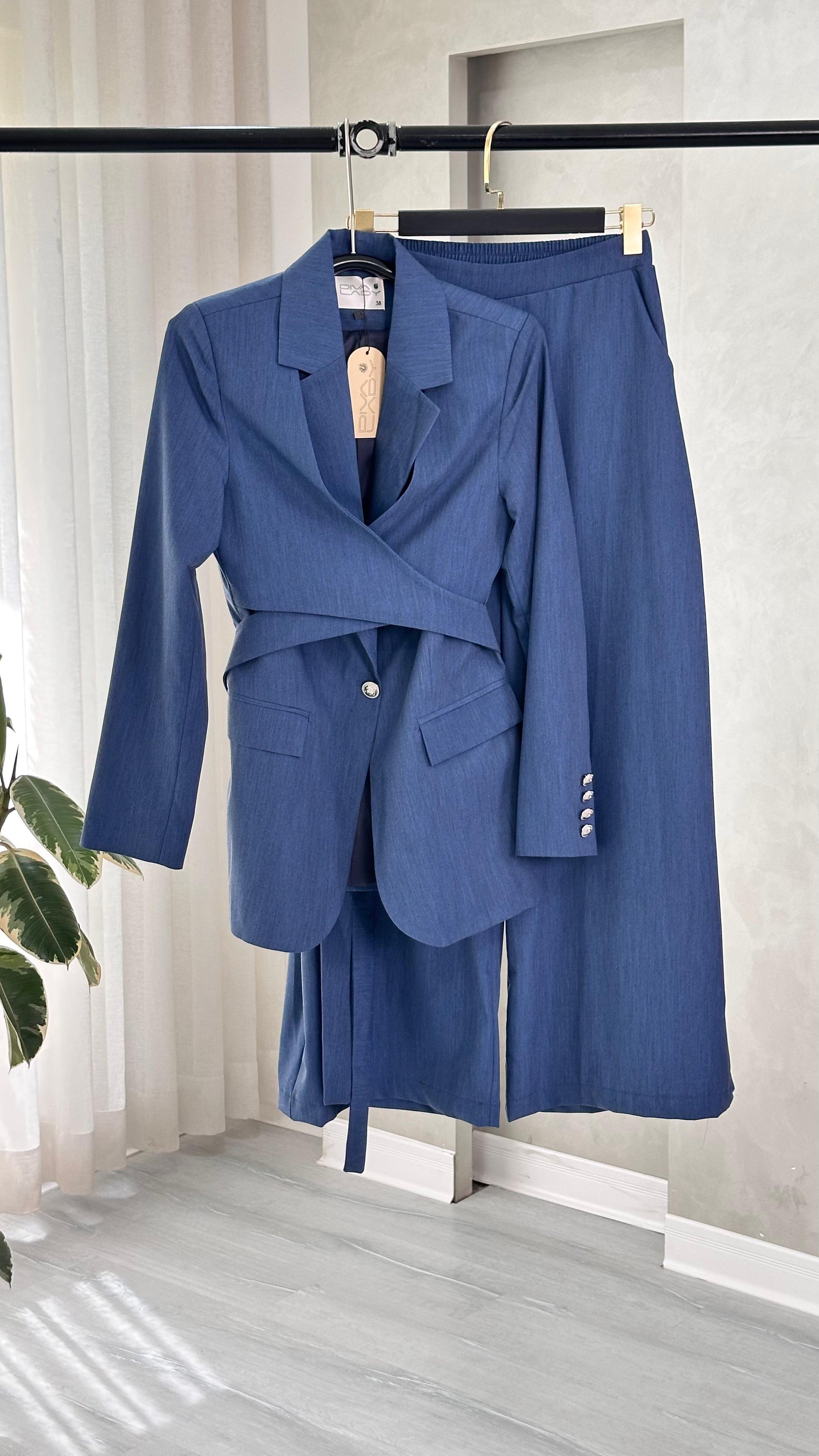 البنطال: بقصة واسعة ومريحة تنساب بمرونة عالية، مما يضفي لمسة عصرية ويضمن سهولة الحركة. هذه البدلة إضافة ضرورية لخزانتك تعكس اختياراتك الراقية والفريدة في ملابس العمل والإطلالات الرسمية.