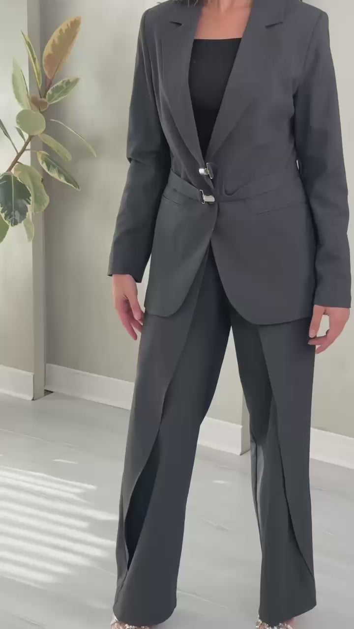 الطقم يجمع بين القوة والفخامة، مثالي لإطلالة عملية لكن راقية وملفتة.
