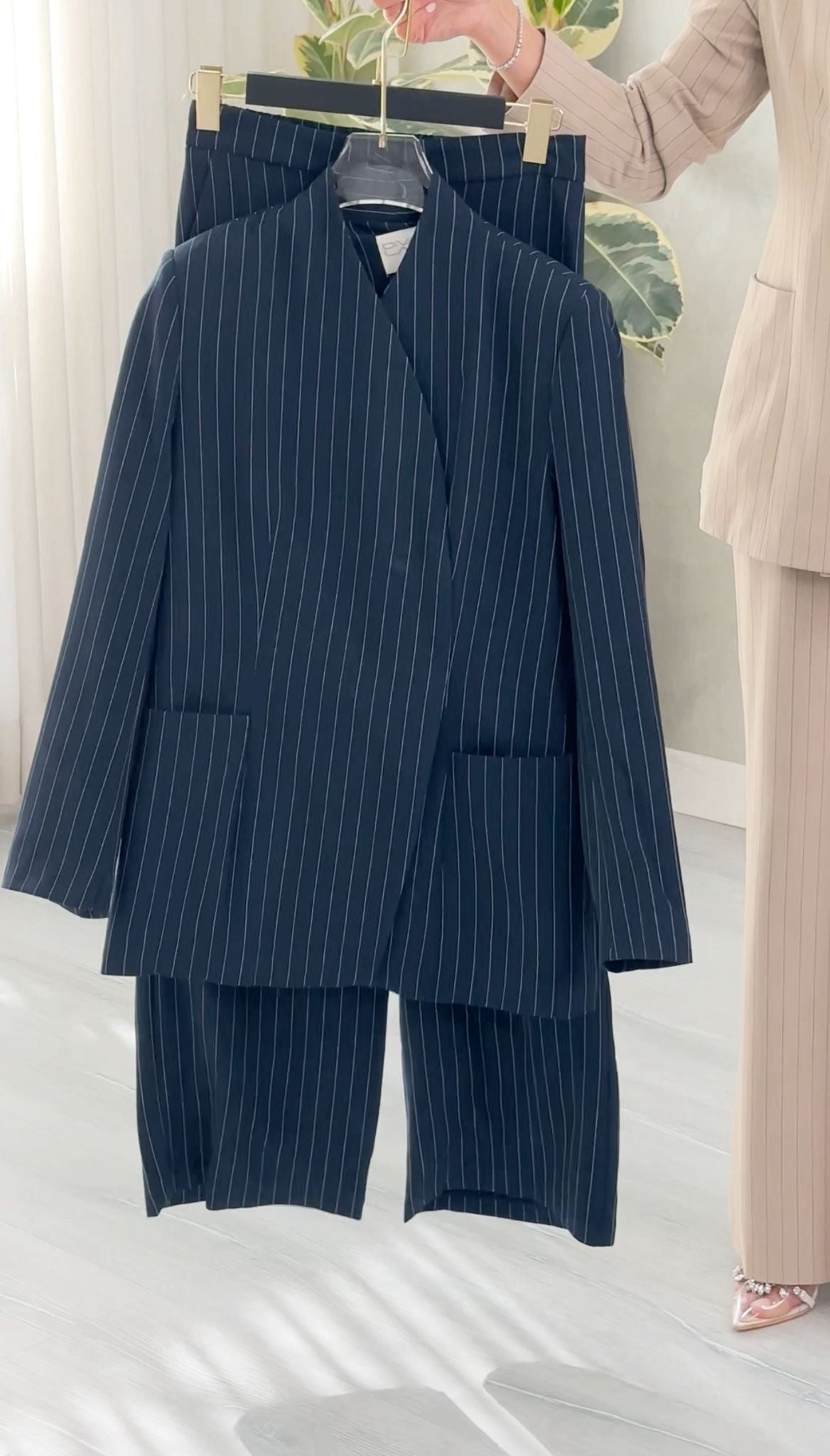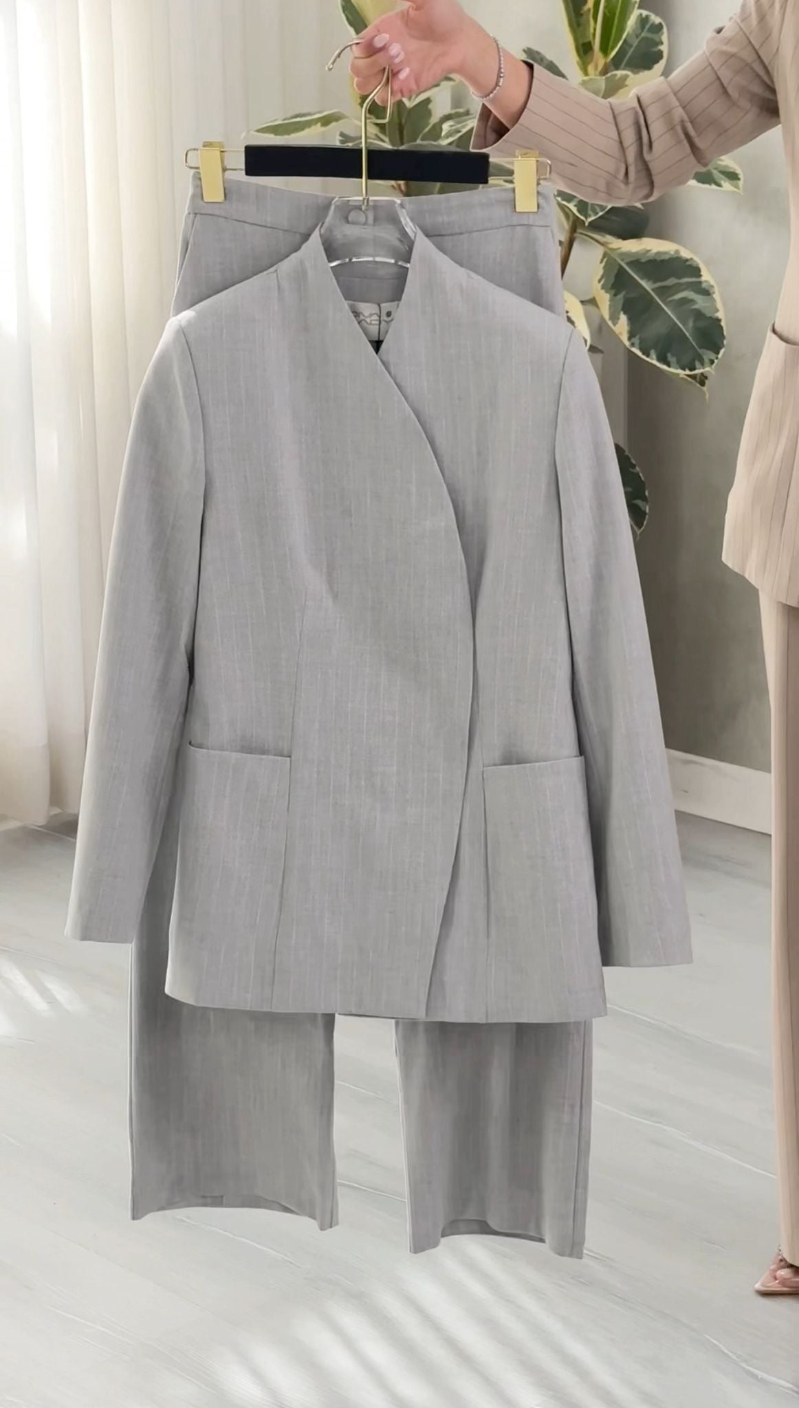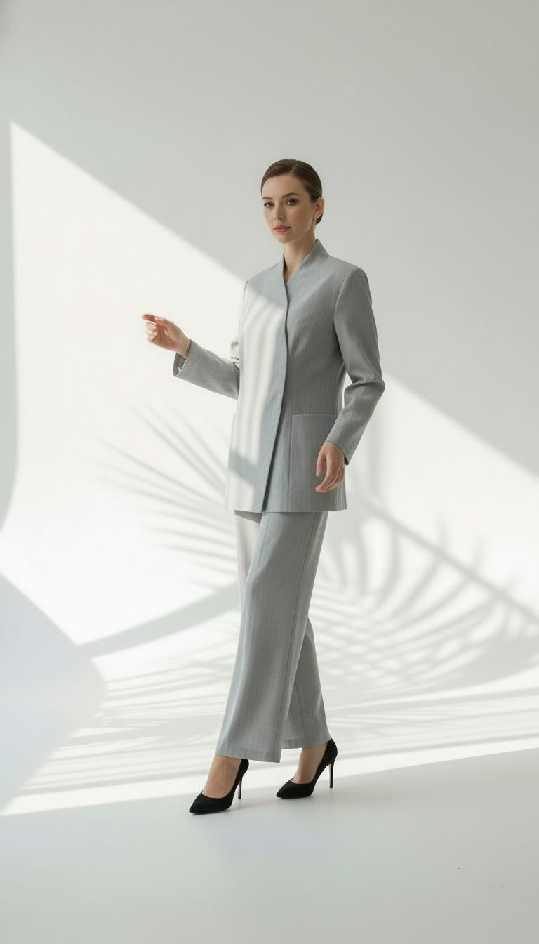 الطقم يعطي إيحاءً بالبساطة والعملية مع لمسة رسمية راقية، مناسب للعمل، الاجتماعات، أو الإطلالات الراقية الهادئة.
