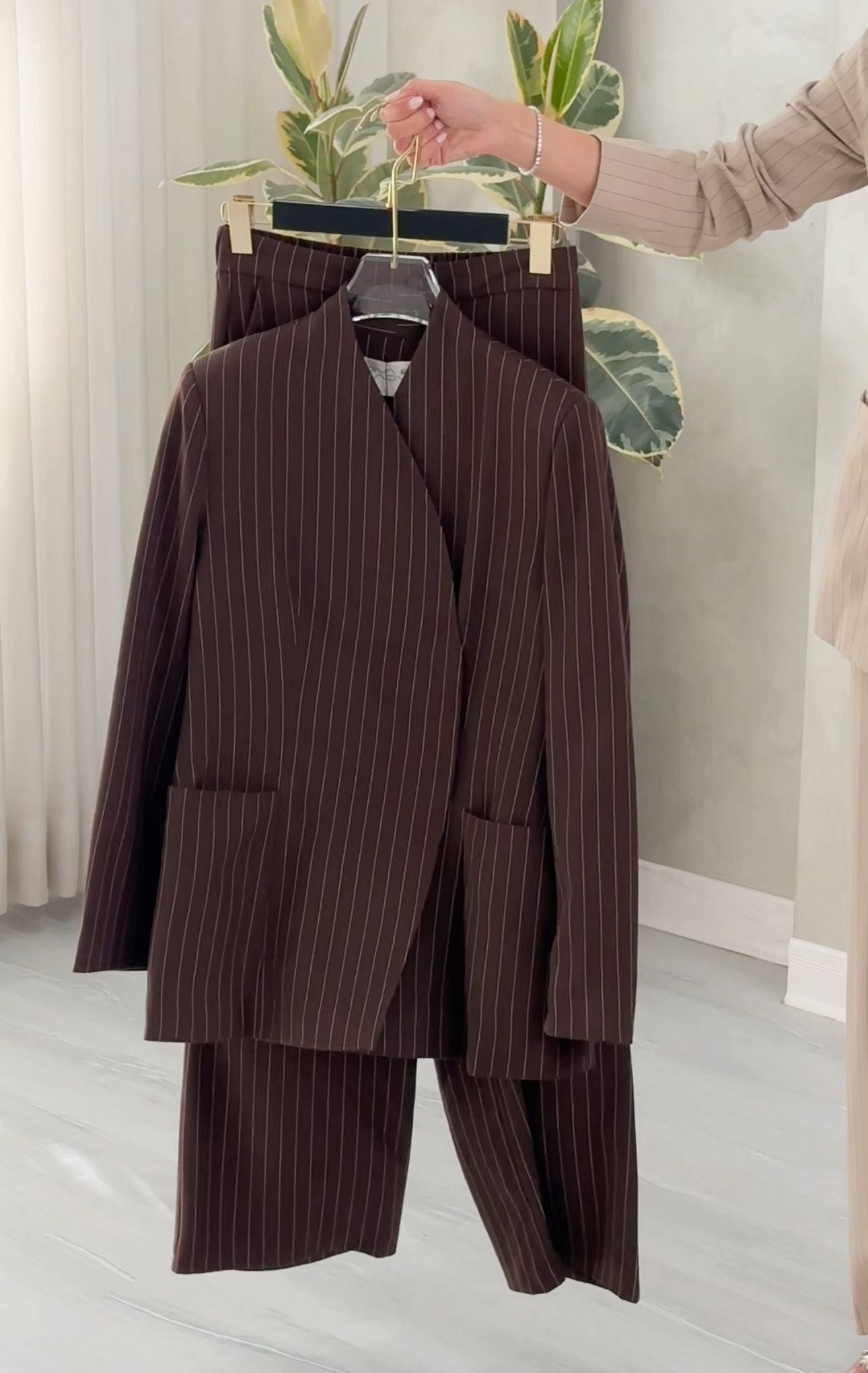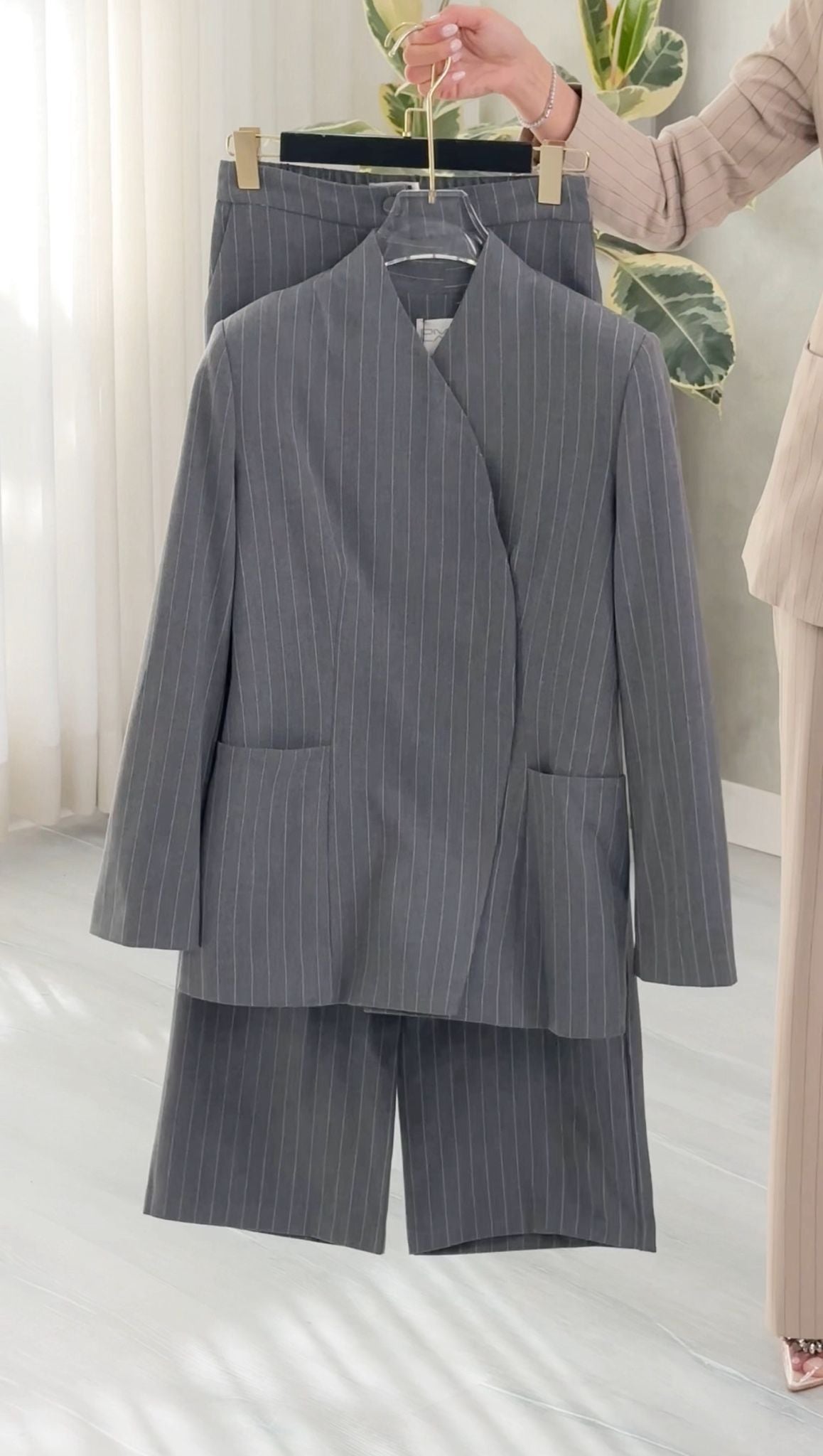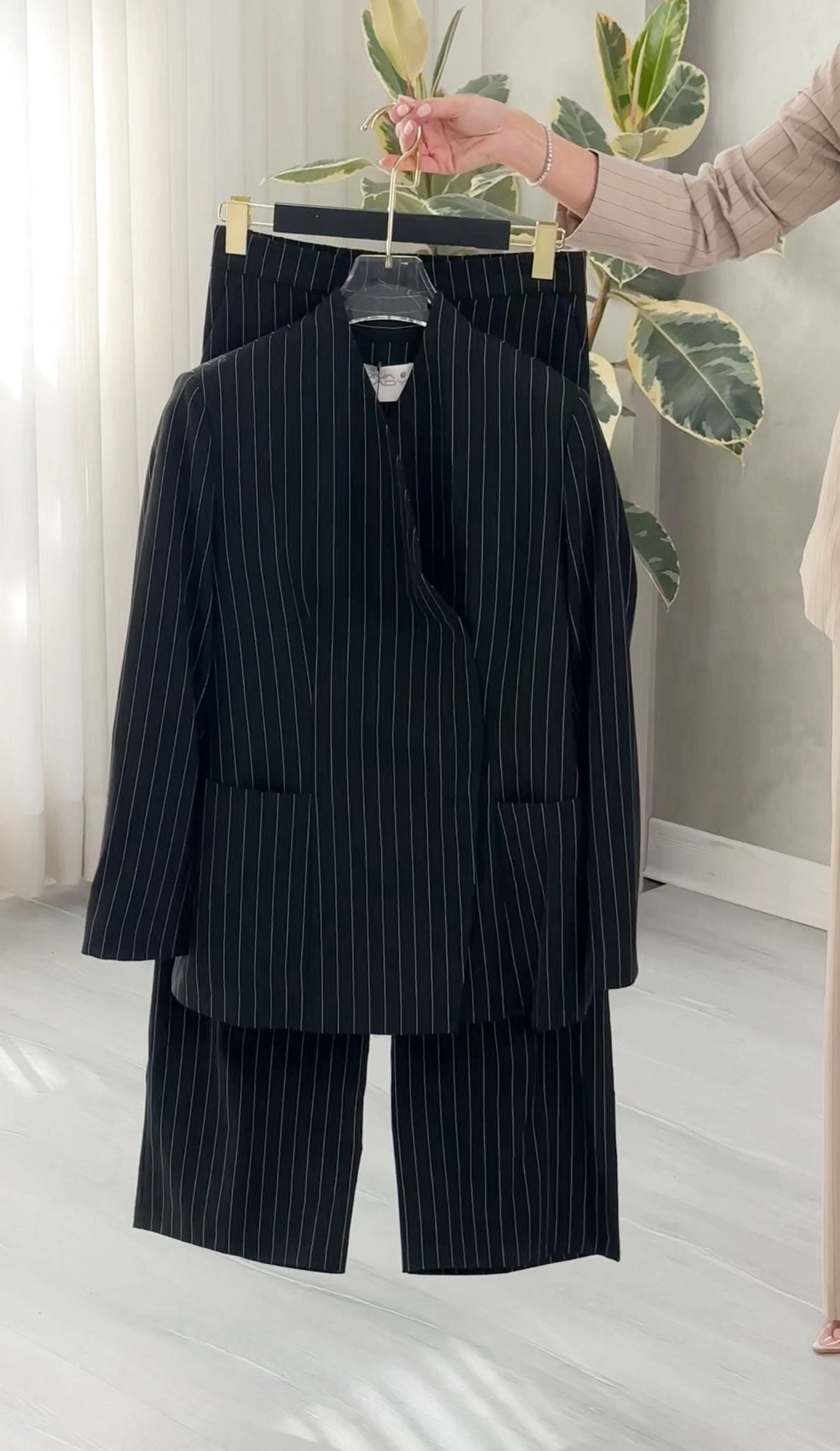 الطقم يعطي إيحاءً بالبساطة والعملية مع لمسة رسمية راقية، مناسب للعمل، الاجتماعات، أو الإطلالات الراقية الهادئة.
