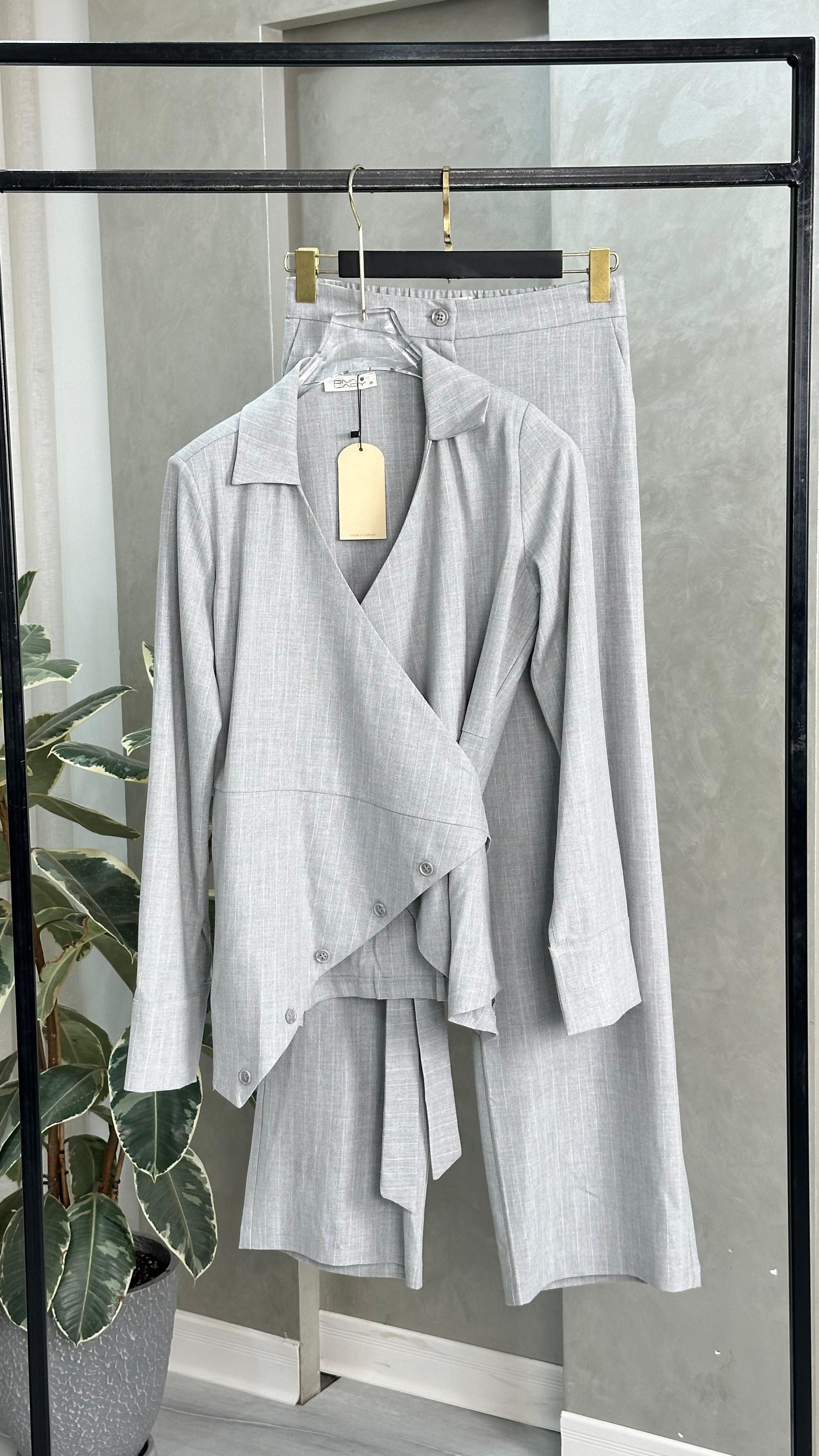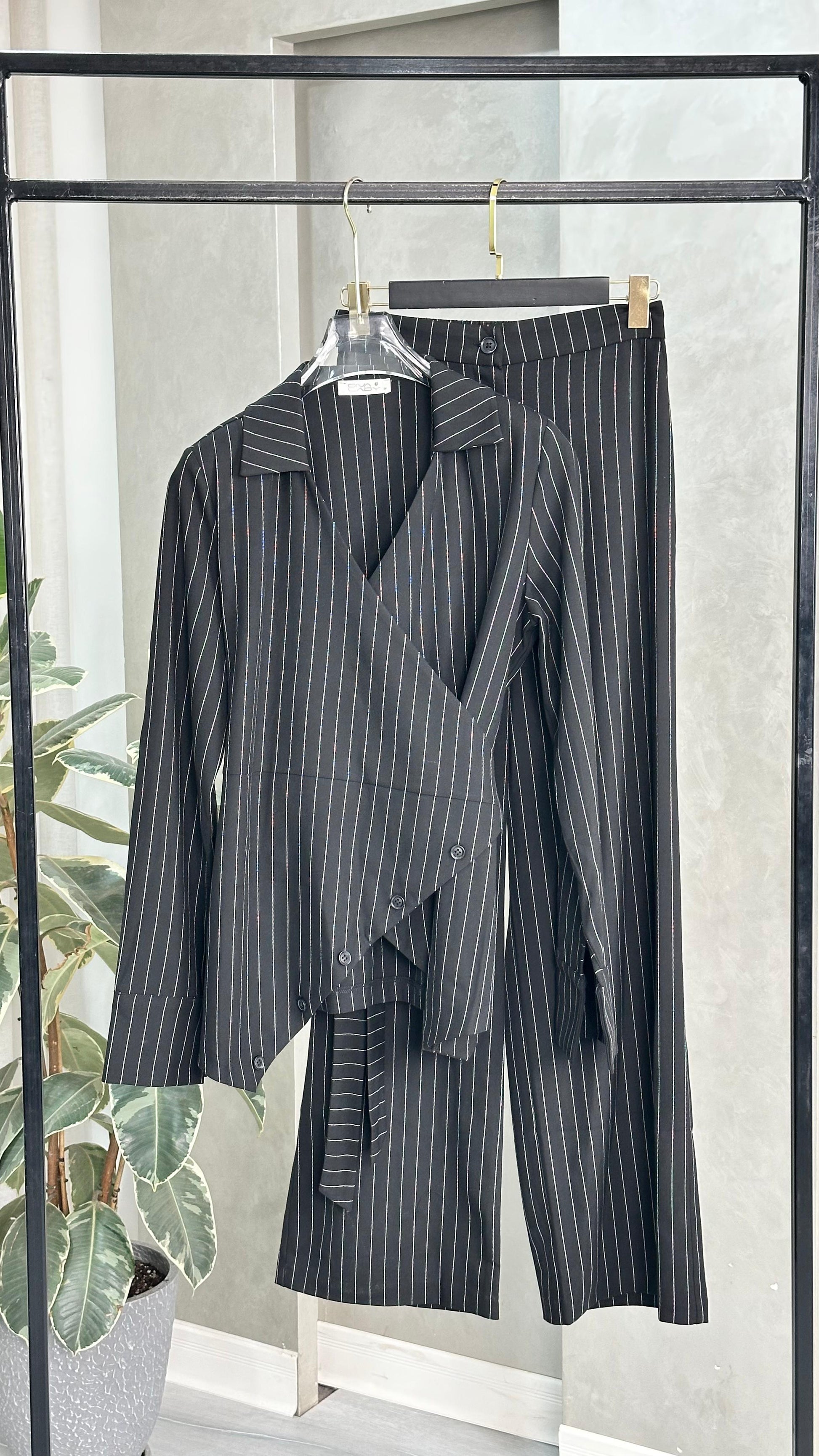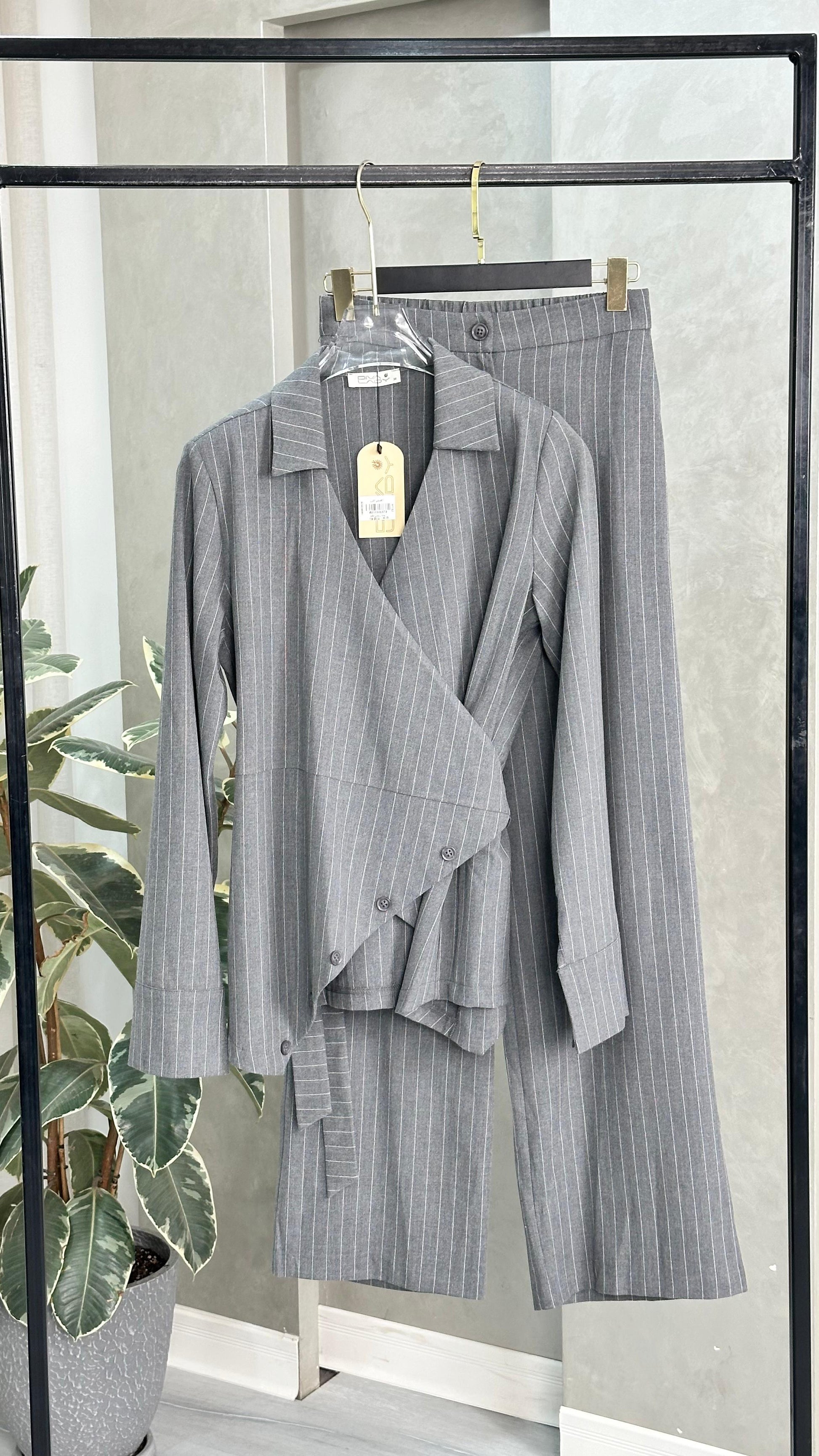 • القماش يحمل خطوطًا طولية دقيقة تضيف مظهرًا راقيًا وتمدّد بصري للقوام.