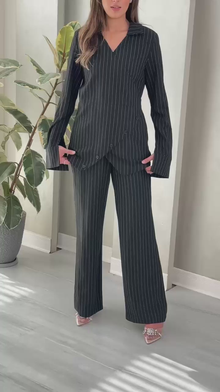 • نفس النمط القماشي المائل إلى الرسمي بخطوط طولية.
