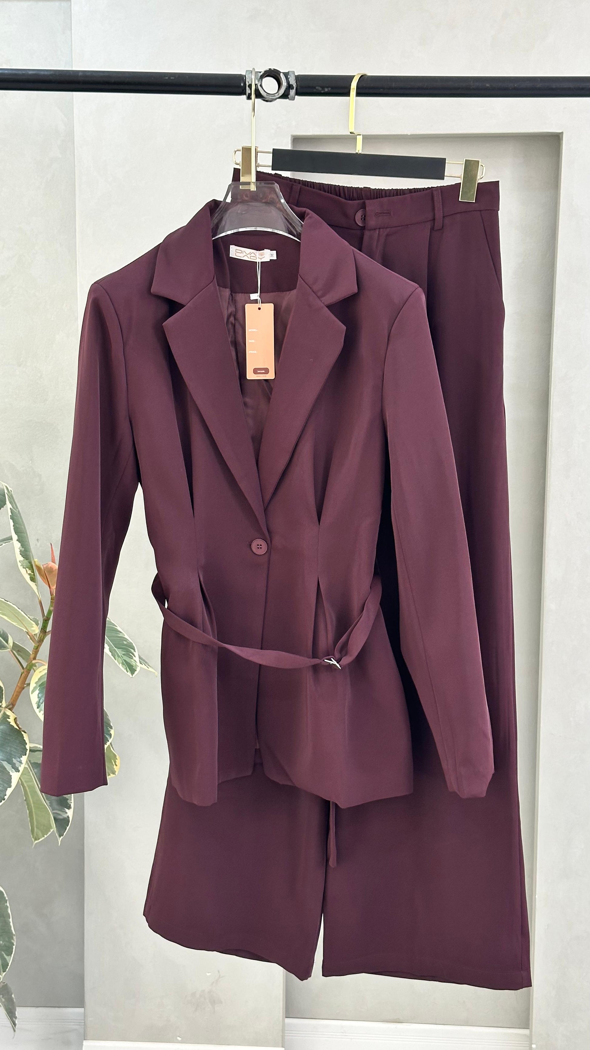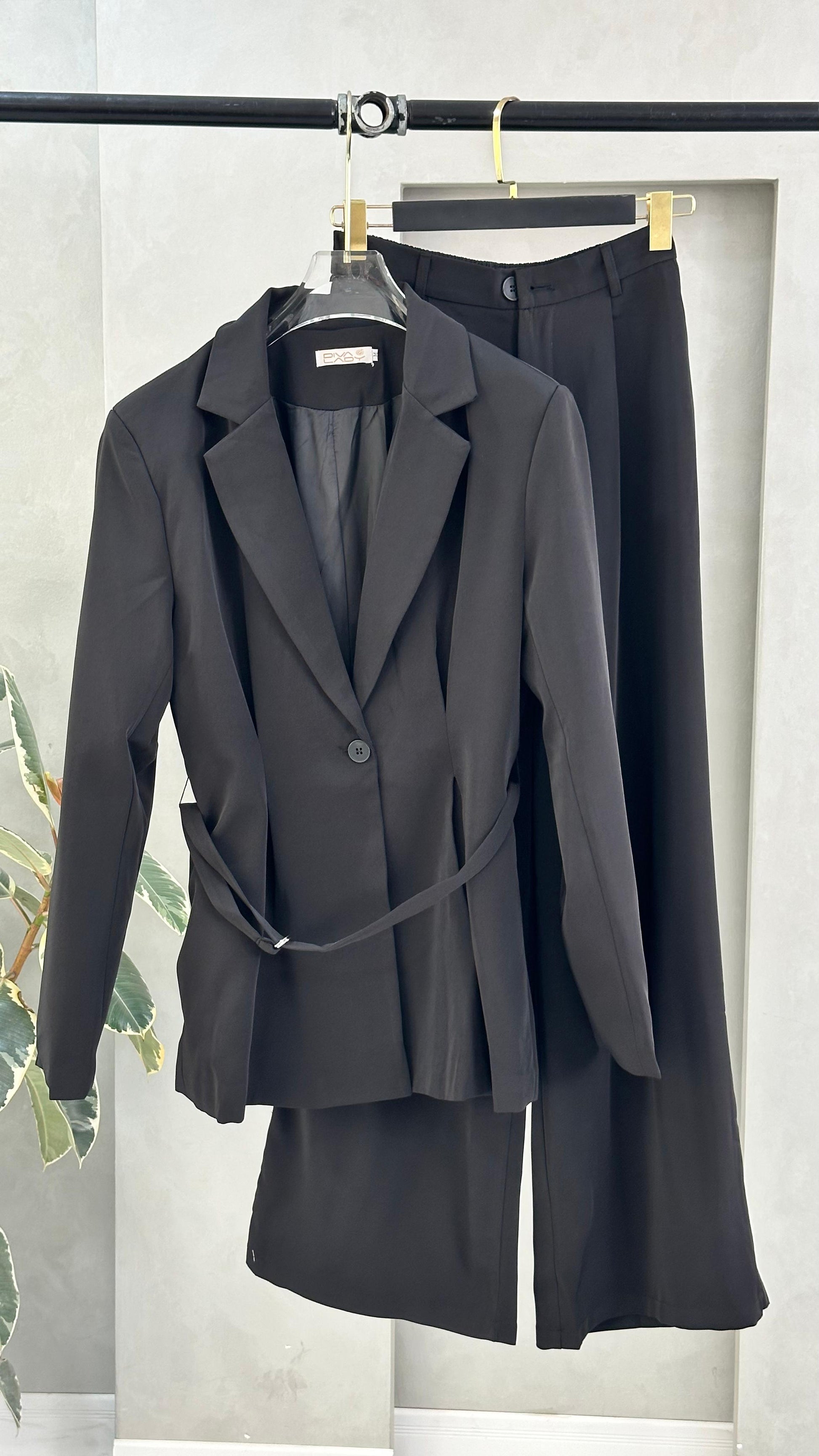 - **الجزء العلوي**: سترة رسمية بأكمام طويلة، مزودة بحزام عند الخصر يحدد القَصّة ويمنحها مظهرًا أنيقًا. تحتوي على ياقة كلاسيكية وتُغلق من الأمام، مما يعطيها طابعًا رسميًا ومرتبًا.
