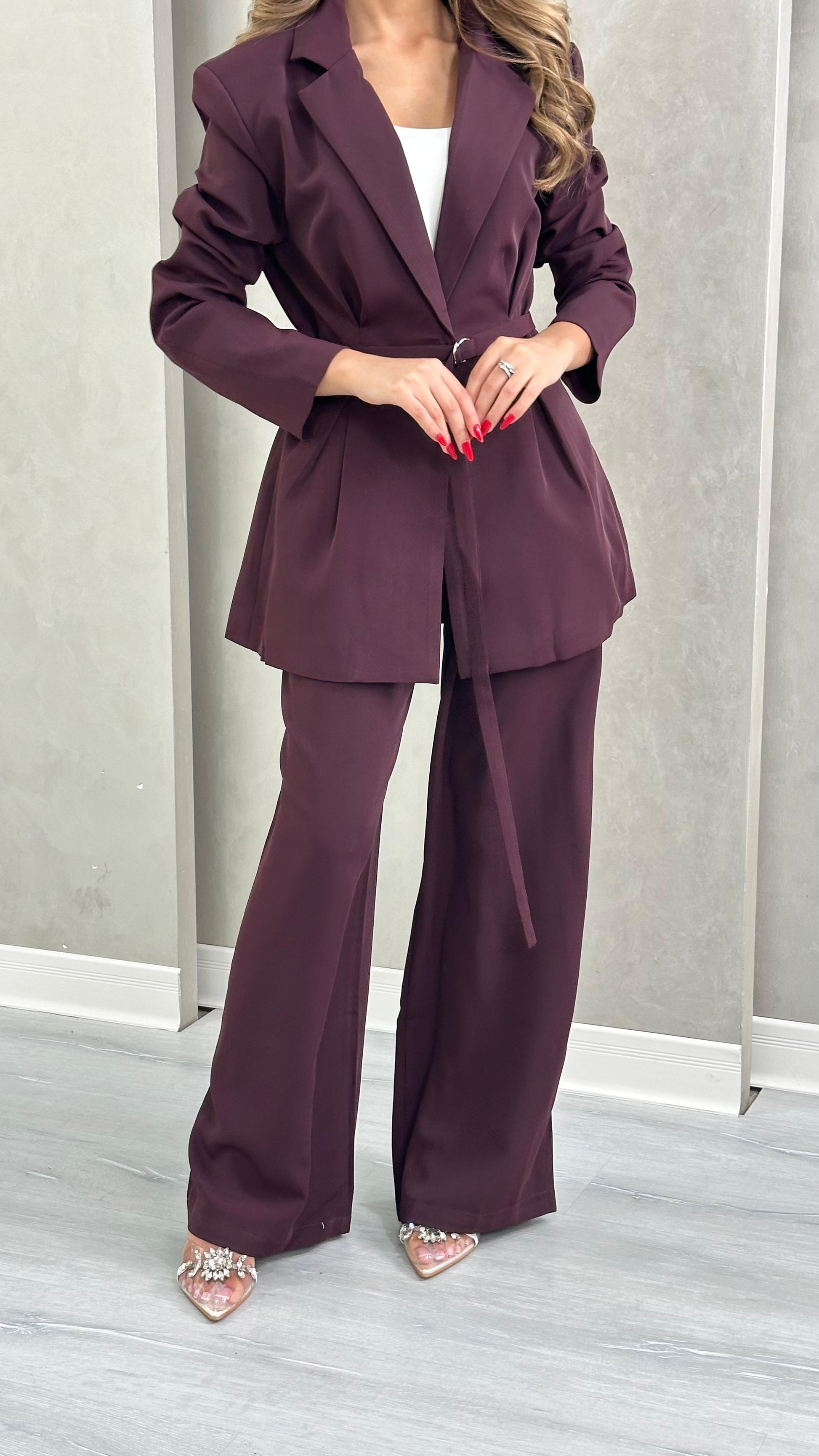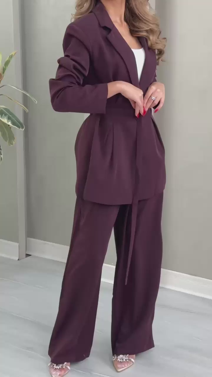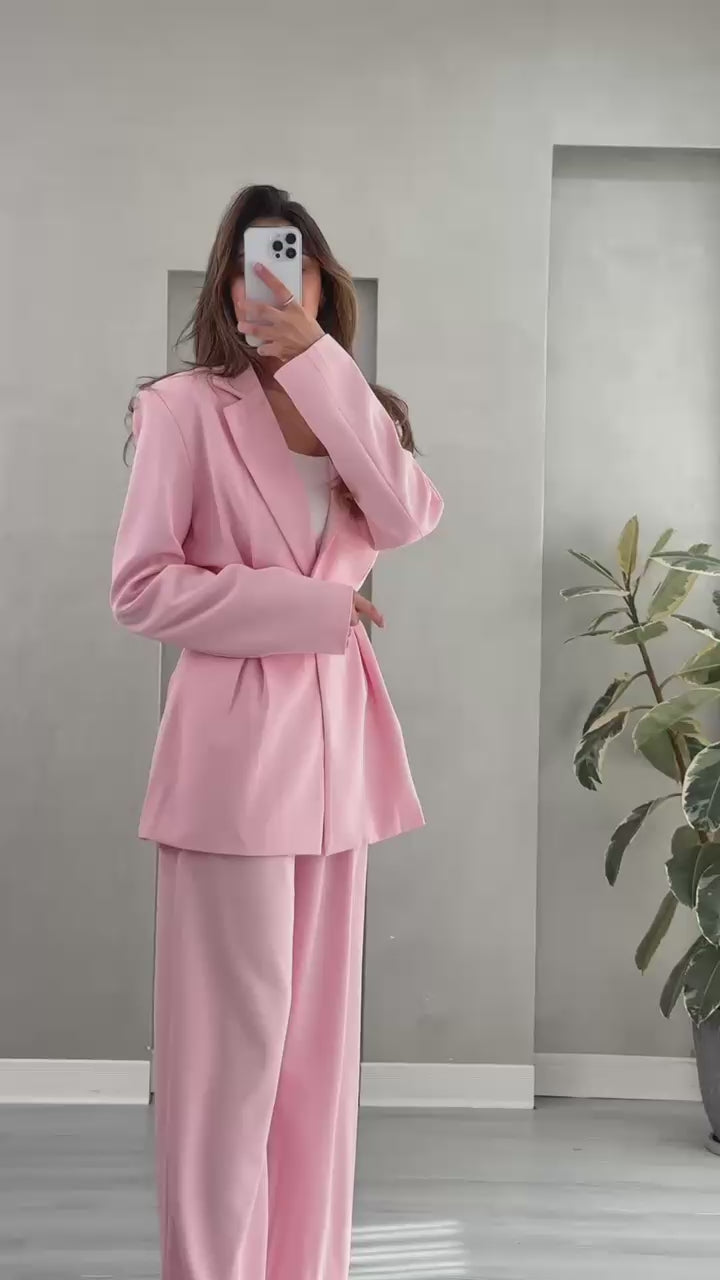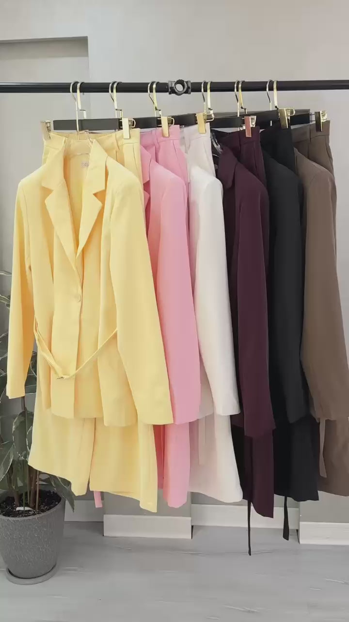 - **الجزء السفلي**: بنطال واسع الأرجل، يمتد حتى الأرض، ويكمل الطقم بشكل متناسق مع السترة، مما يعكس أسلوبًا أنيقًا ومريحًا في الوقت نفسه.
