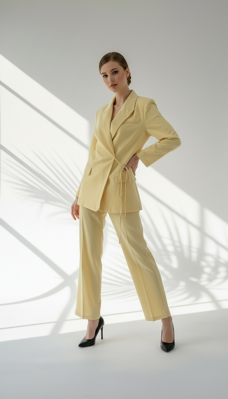 - **الجزء العلوي**: سترة رسمية واسعة، ذات أكمام طويلة وياقة كلاسيكية، وتُغلق من الأمام بحزام يلتف حول الخصر ليحدد القَصّة ويمنحها مظهرًا أنيقًا.