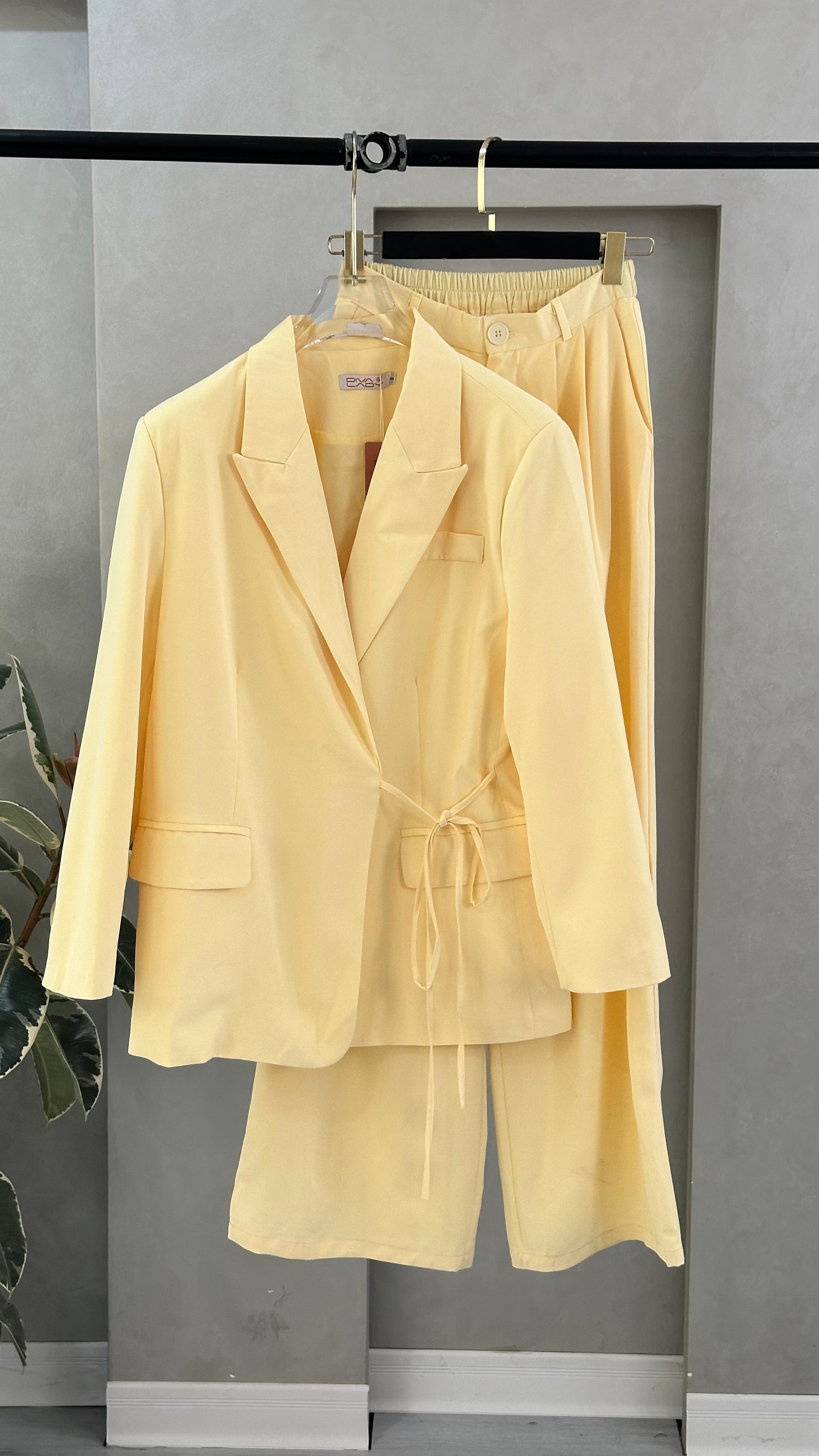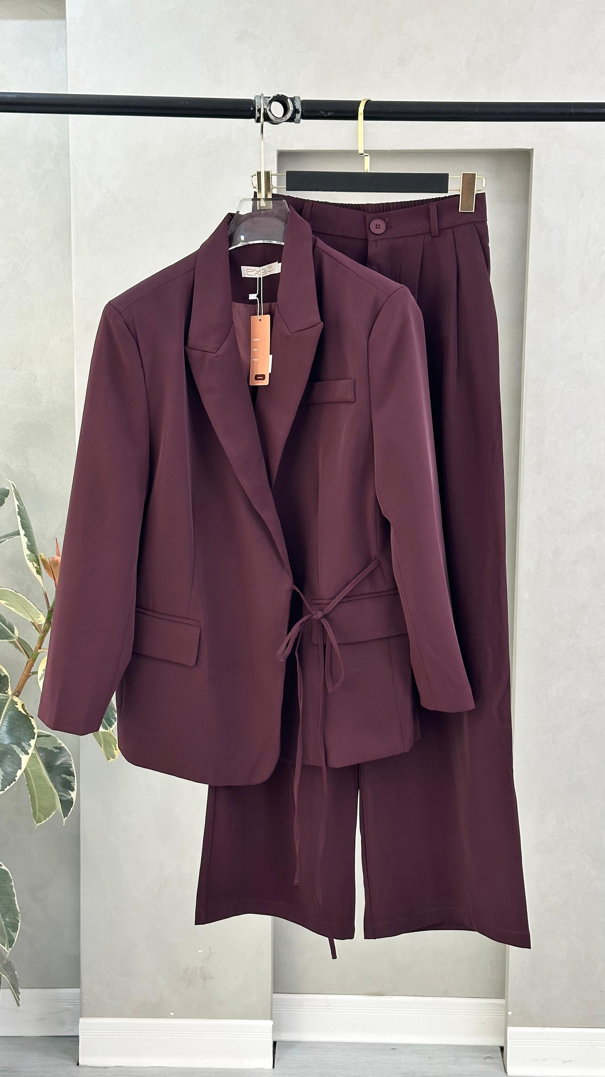 - **الجزء السفلي**: بنطال واسع الأرجل، يمتد حتى الأرض، ويكمل الطقم بشكل متناسق مع السترة، مما يعكس أسلوبًا رسميًا ومريحًا في الوقت نفسه.