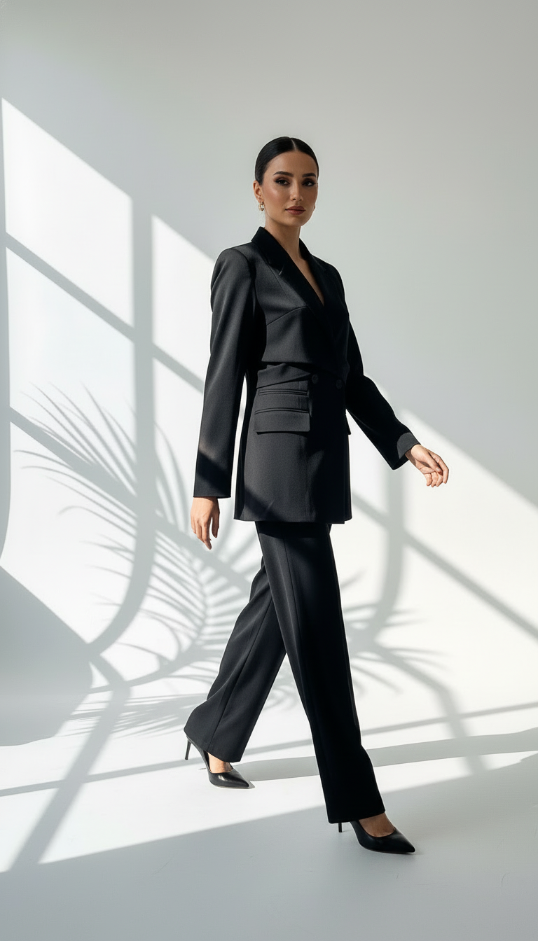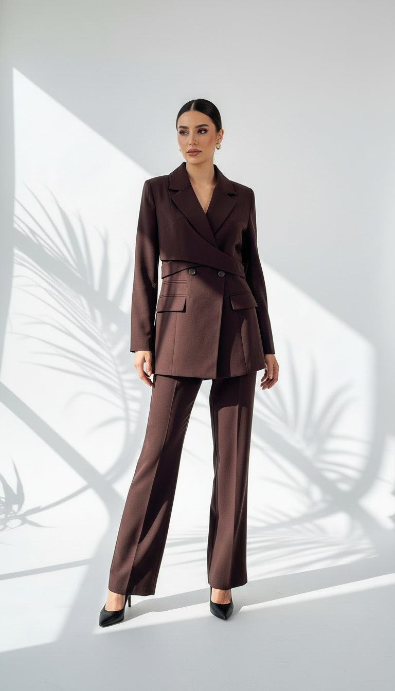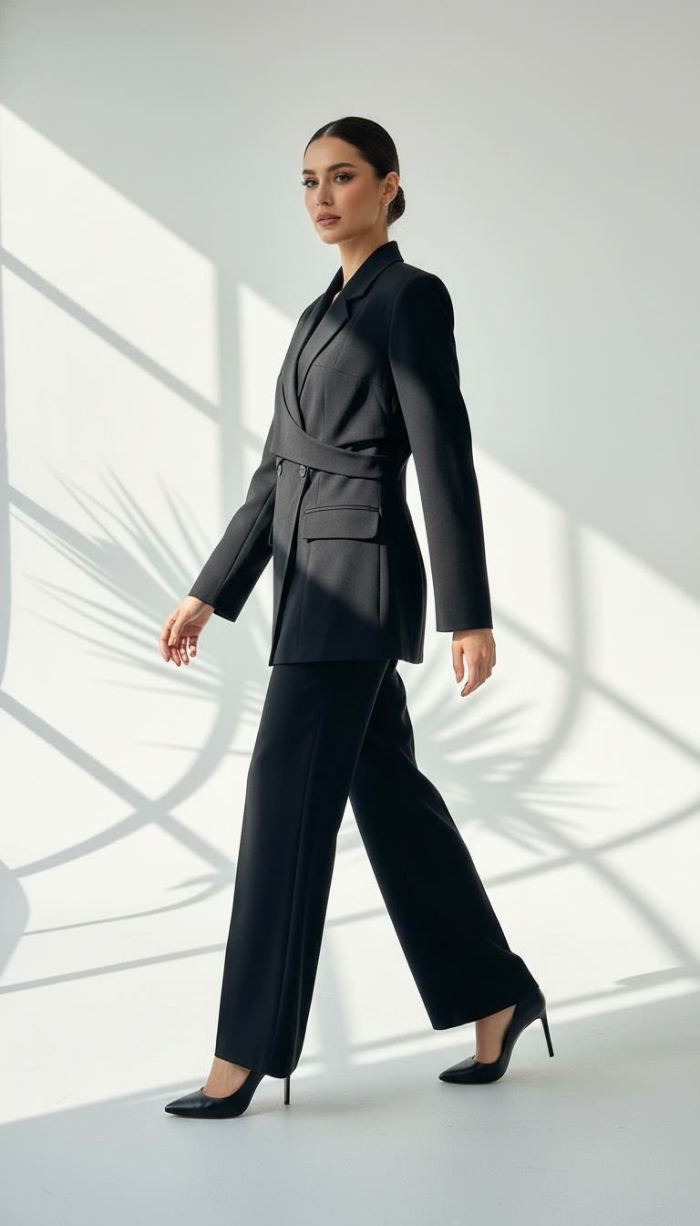 قطعة أيقونية للمرأة العصرية التي تبحث عن الأناقة التي تعكس القوة والاحترافية. تصميم يمزج بين اللمسة الكلاسيكية والقصات الحديثة الجريئة. هذا الطقم يضمن لكِ إطلالة متكاملة وواثقة، مثالي لجميع اجتماعاتك ومناسباتك الهامة.