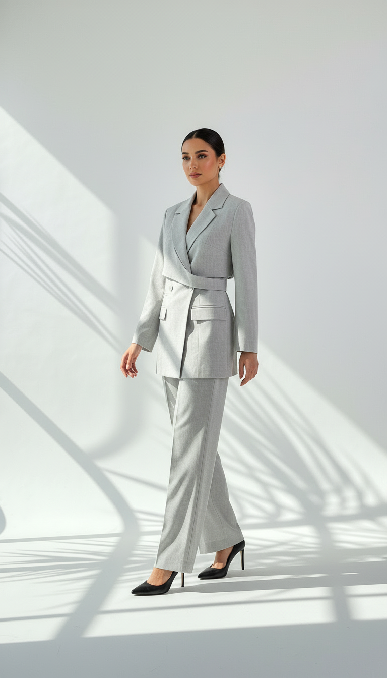 بليزر بتصميم مبتكر: يتميز البليزر بياقة رسمية وتفصيلة أمامية غير تقليدية تمنح مظهراً عصرياً ومميزاً، مع أزرار (أو كباسات) لتثبيت الإغلاق.