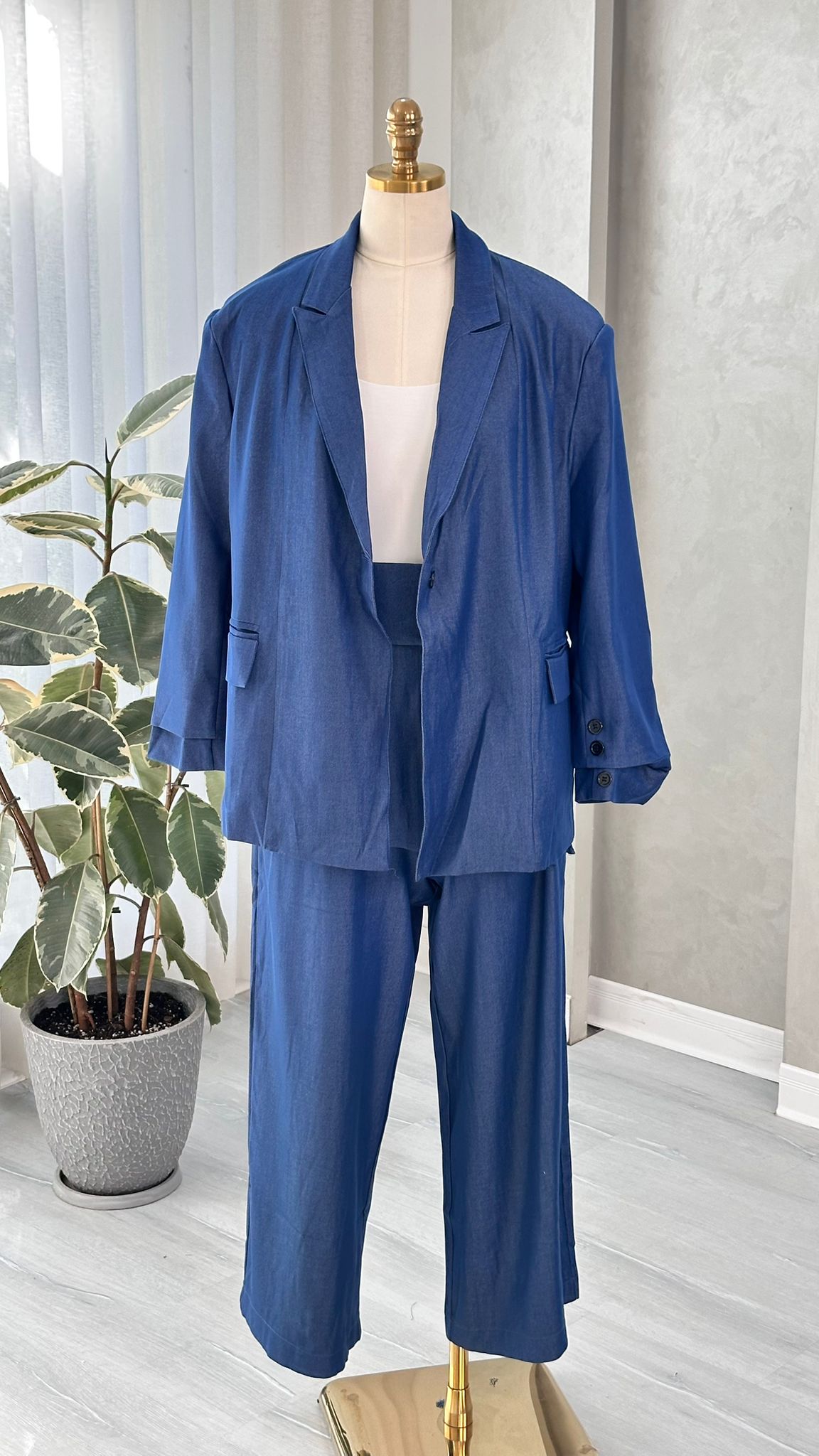 - **بنطال واسع الأرجل**: يمتد بانسيابية من الخصر حتى الأرض، بقصة مستقيمة ومريحة، دون تفاصيل بارزة مثل الجيوب أو الطيات، مما يعزز التناسق والبساطة في التصميم.