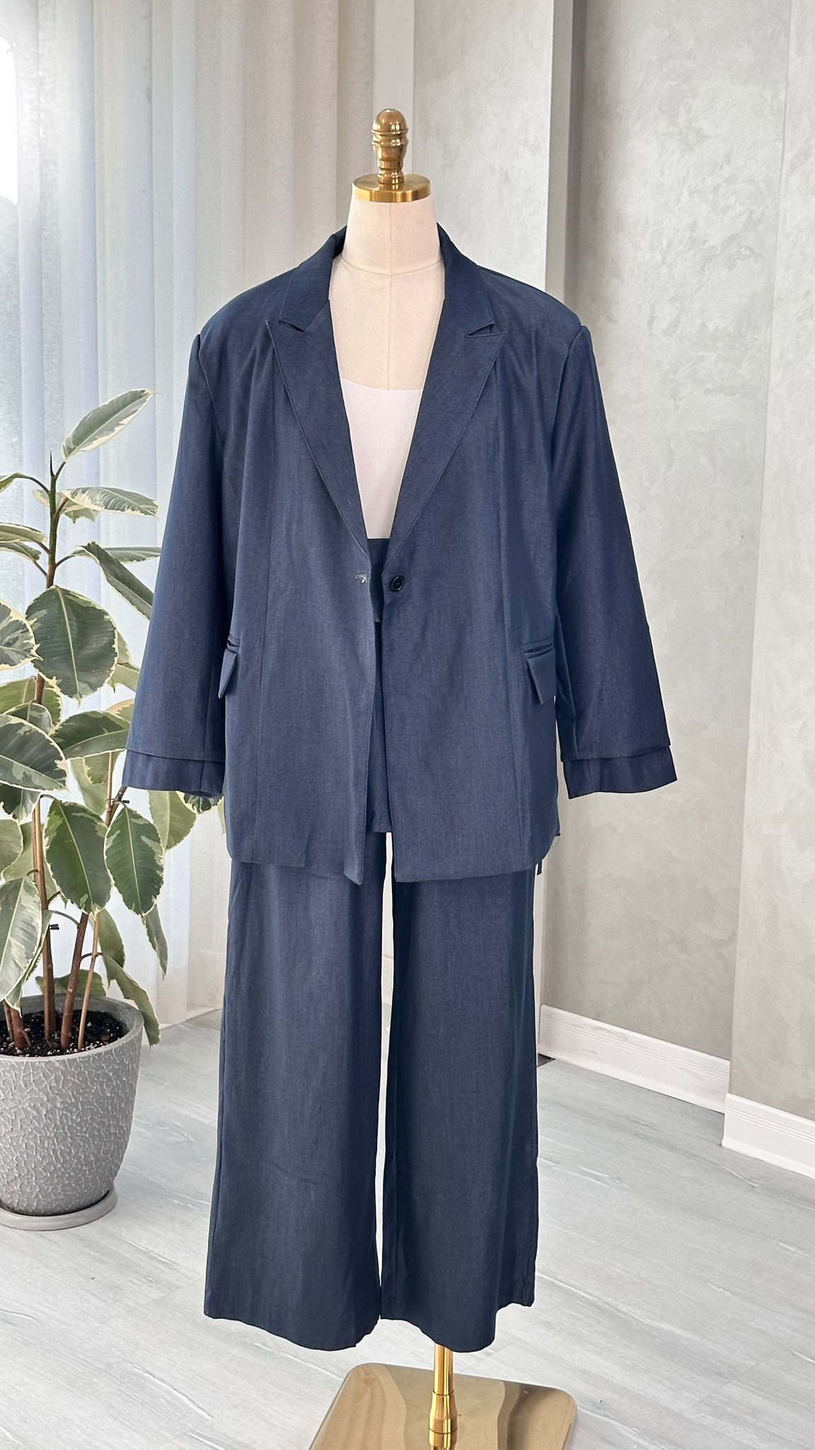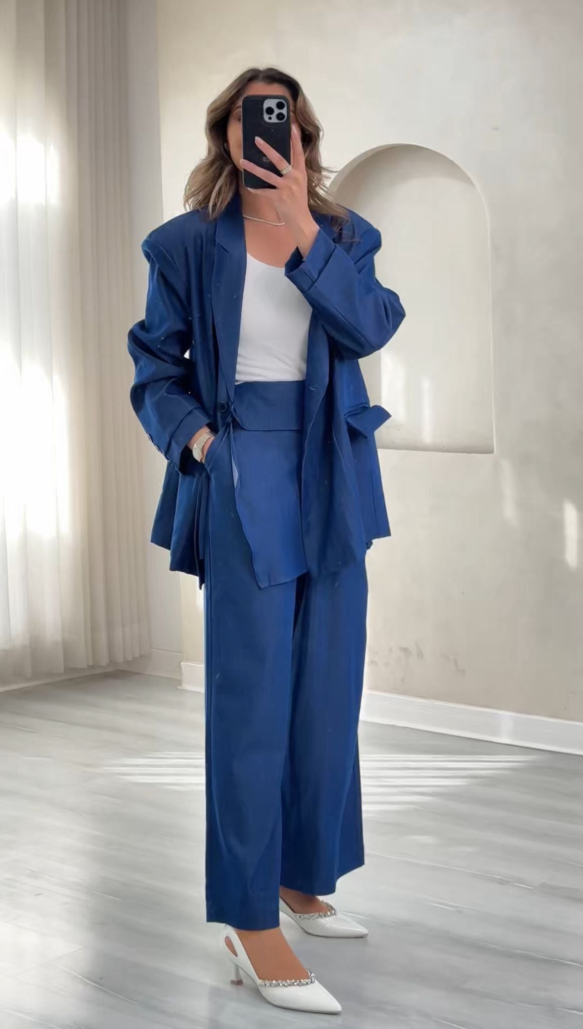 - **بليزر واسع**: يتميز بقصة فضفاضة وطول متوسط، بياقة كلاسيكية وأكمام طويلة. التصميم بسيط وخالٍ من الزخارف، مما يمنحه طابعًا رسميًا أنيقًا يناسب الإطلالات العملية أو الفاخرة.