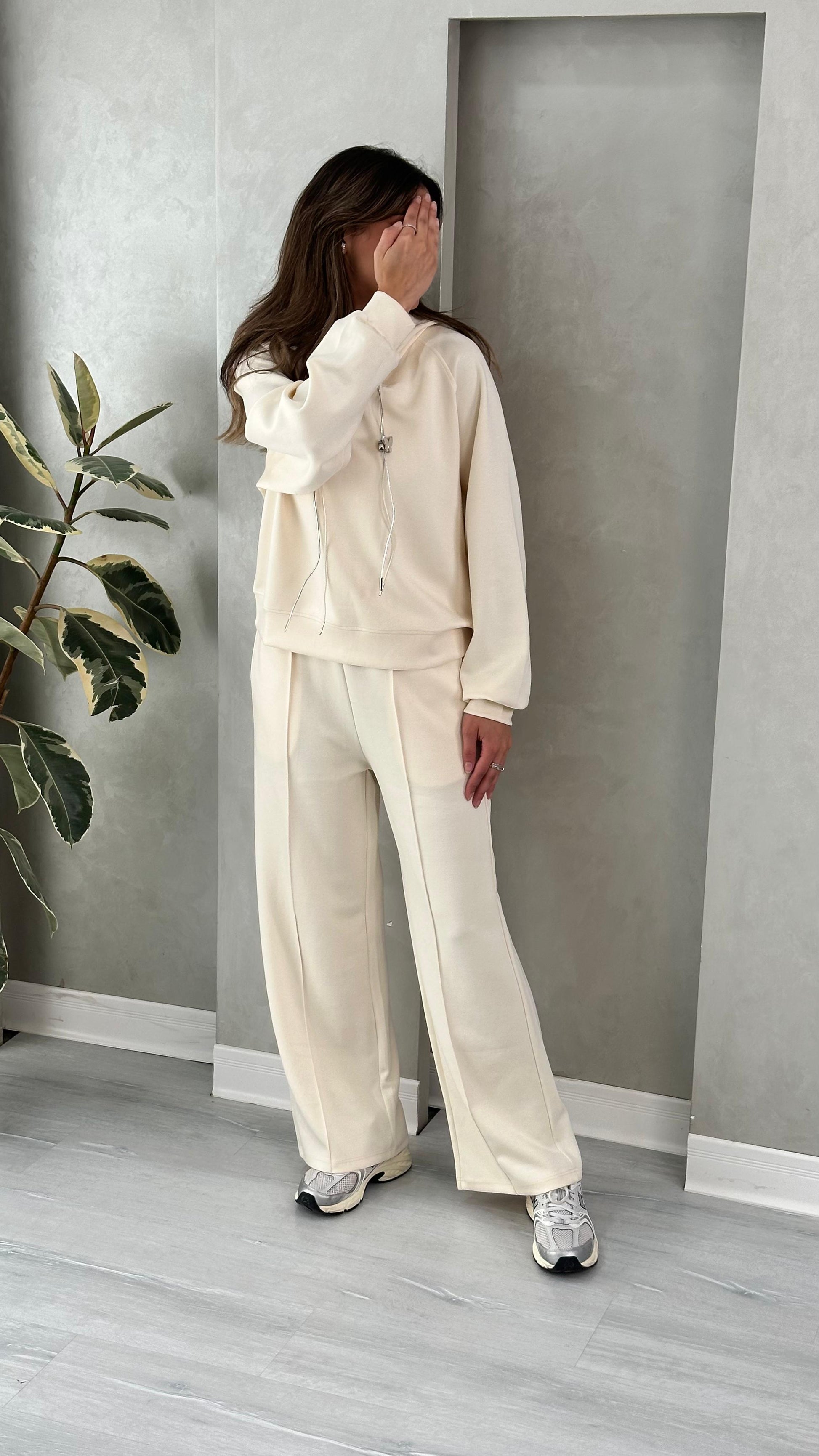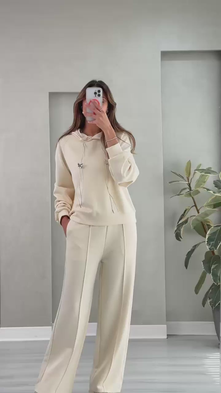- **الجزء السفلي**: بنطال واسع الأرجل، يمتد حتى الأرض، مصنوع من نفس نوع القماش المستخدم في السترة، مما يعطي طابعًا موحدًا ومريحًا.