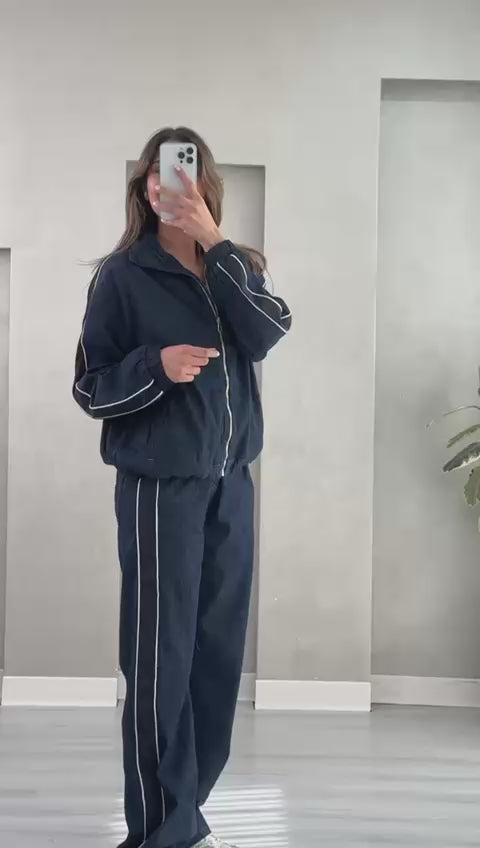 طقم رياضي مصنوع من قماش يشبه الدنيم، ويضم جاكيت بأكمام طويلة وسحاب أمامي للإغلاق. يتميز الجاكيت بخطوط بارزة تمتد على طول الأكمام، تضيف لمسة تصميمية واضحة. البنطال واسع الساقين، ويحتوي أيضًا على خطوط ممتدة على الجانبين، مما يخلق توازنًا بصريًا مع الجزء العلوي.