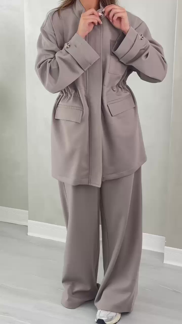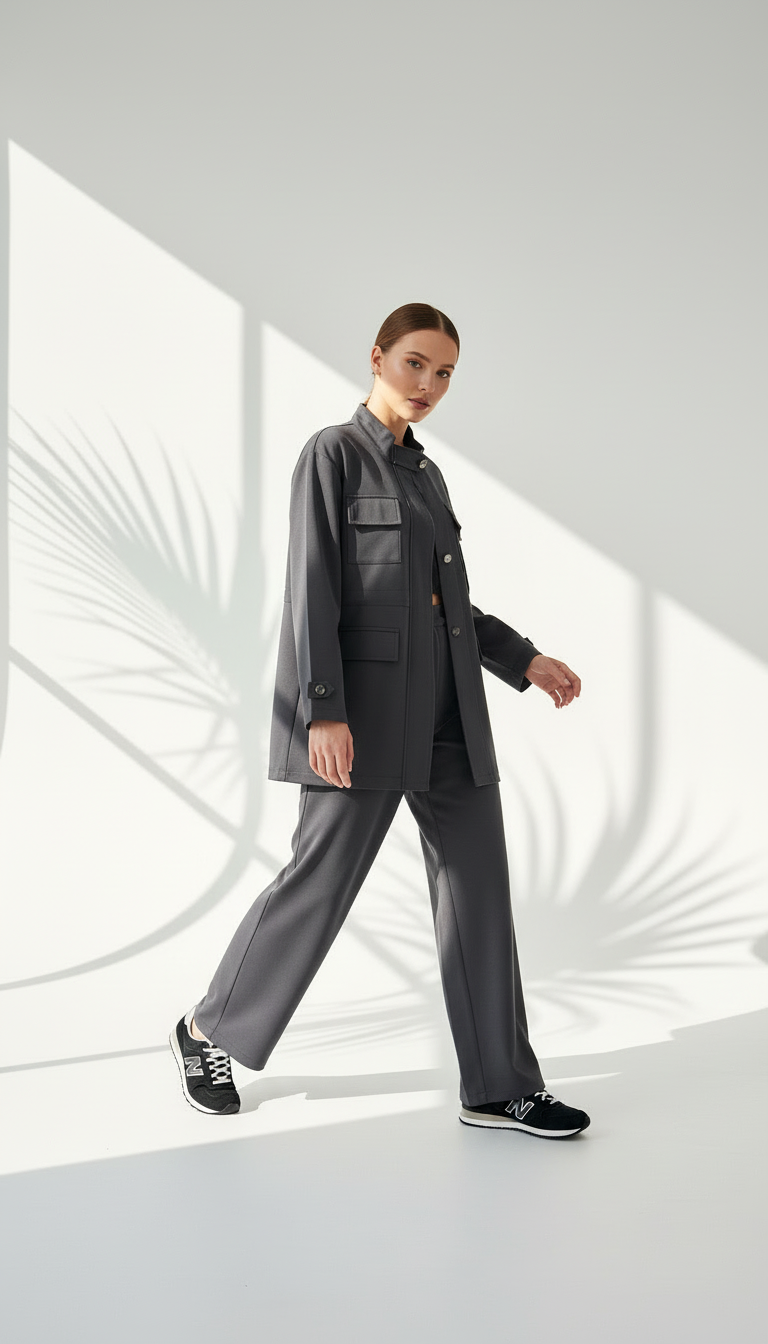 جاكيت بأكمام طويلة، مزوّد بجيوب أمامية كبيرة، ويغلق بأزرار من الأمام. الياقة مرتفعة، ما يمنح التصميم طابعًا عمليًا وعصريًا. البنطال واسع الساقين، بقصة مريحة تنسدل بانسيابية نحو الأرض، مما يعزز الإحساس بالراحة والحرية في الحركة.