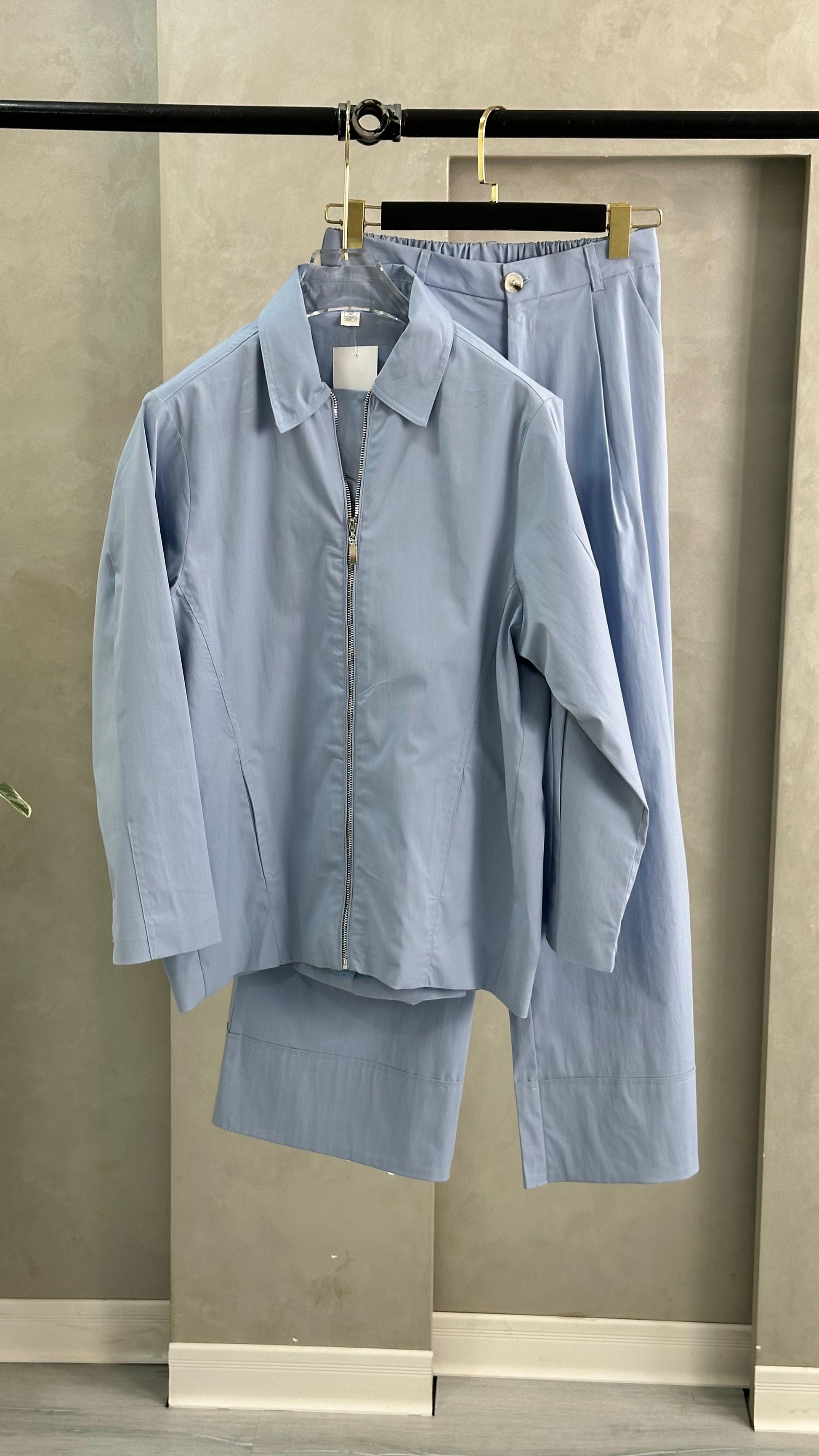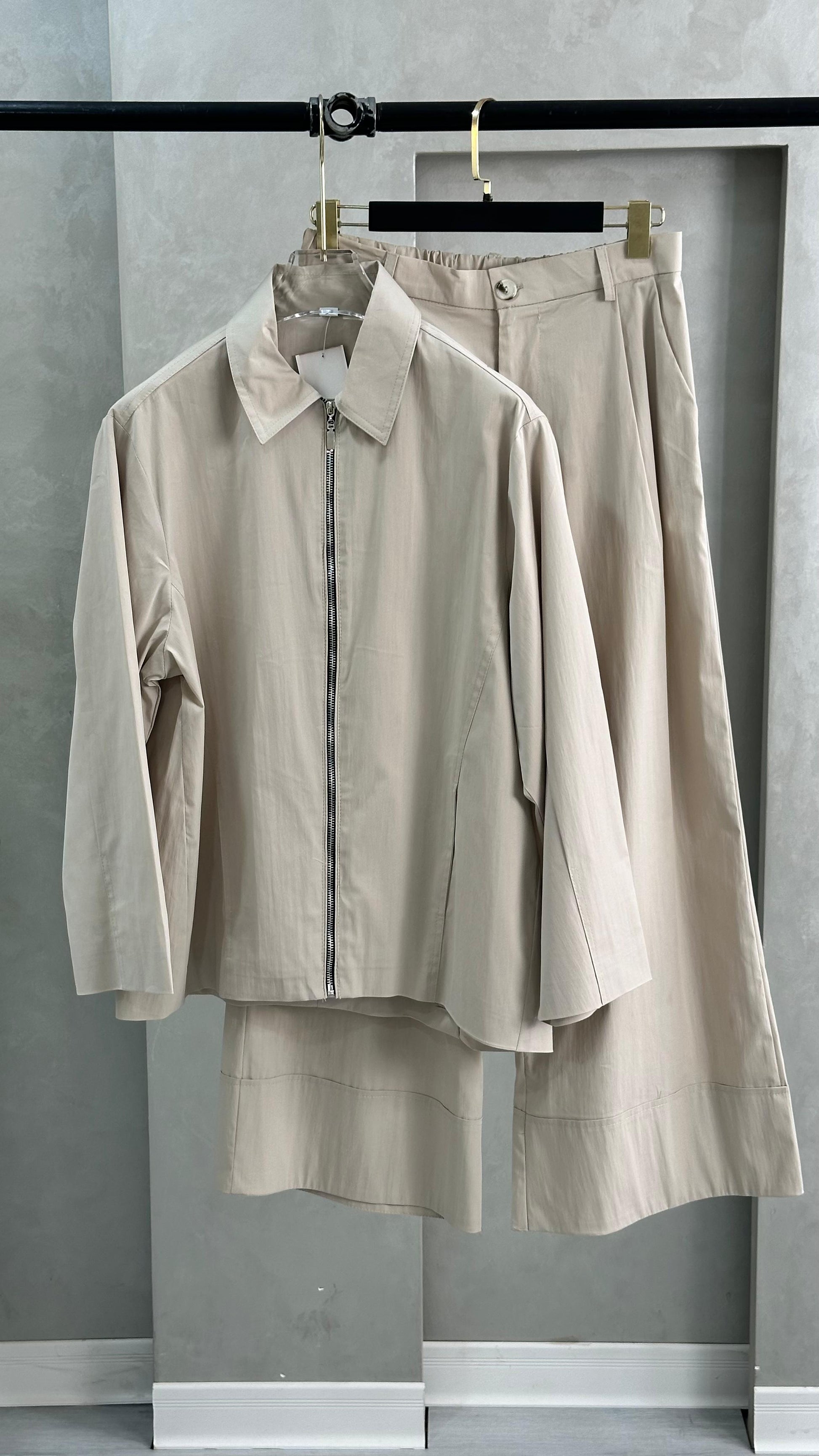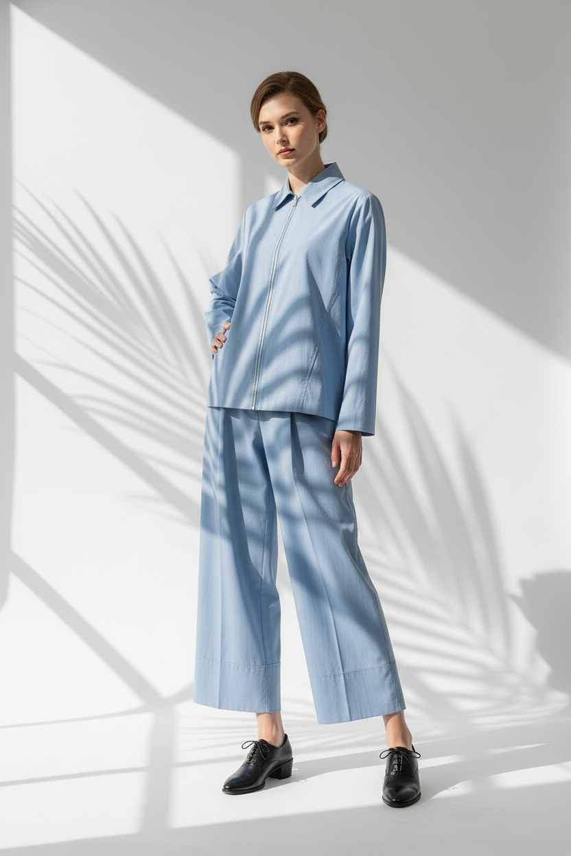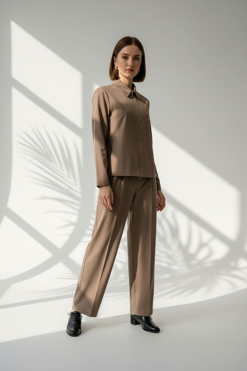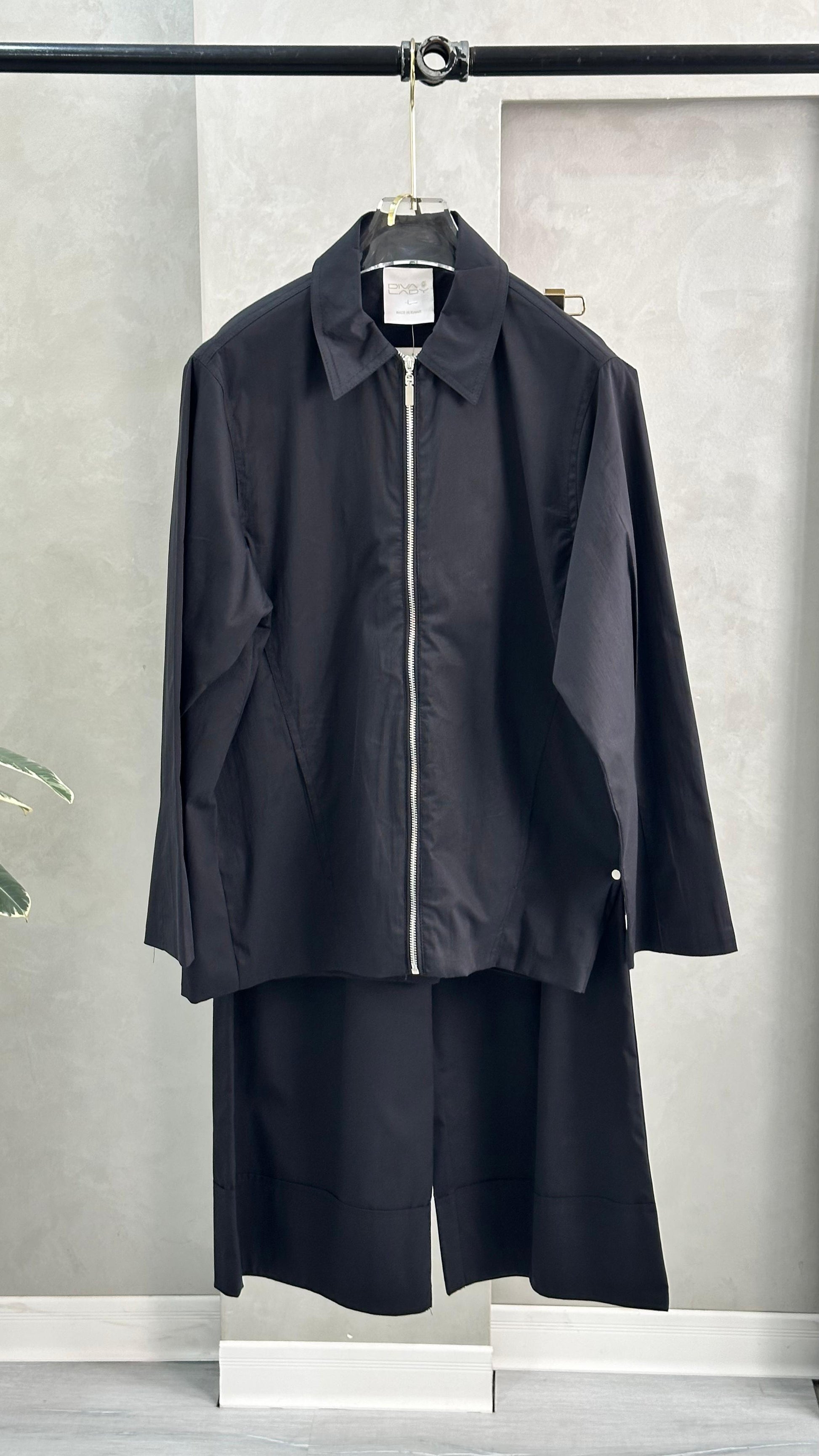 طقم أنيق مكوّن من قطعة علوية بأكمام طويلة وسحاب أمامي، مع بنطال واسع الساقين من نفس القماش، ما يمنح المظهر تناغمًا وانسيابية. القماش ناعمًا ومريحًا، مناسبًا للأجواء اليومية أو المناسبات شبه الرسمية..