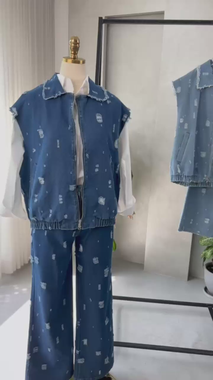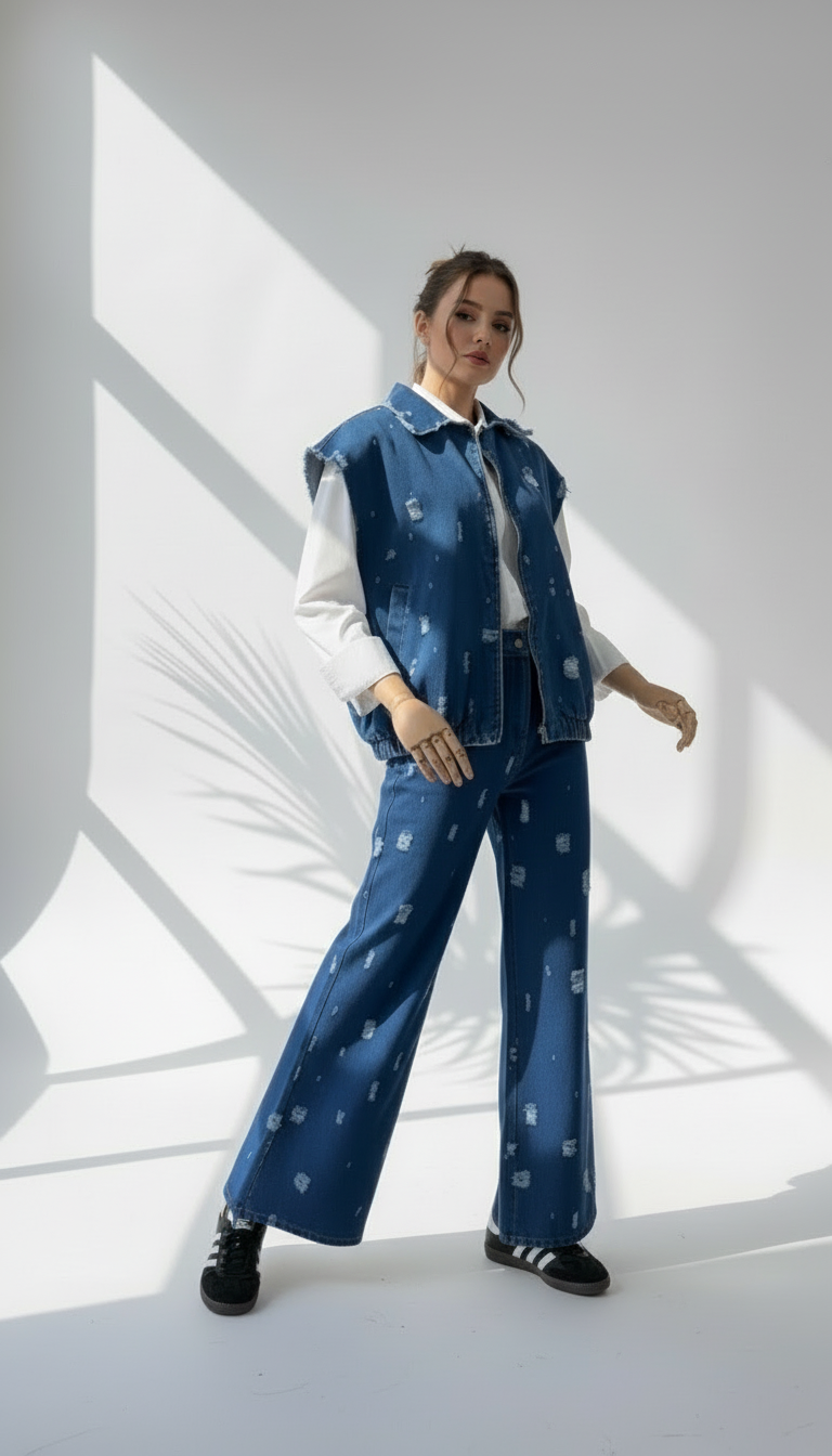 - **سترة دنيم بدون أكمام**، تُرتدى فوق القميص، وتشارك نفس الخامة والتفاصيل الباهتة، ما يضفي طابعاً عصرياً ومتناسقاً.