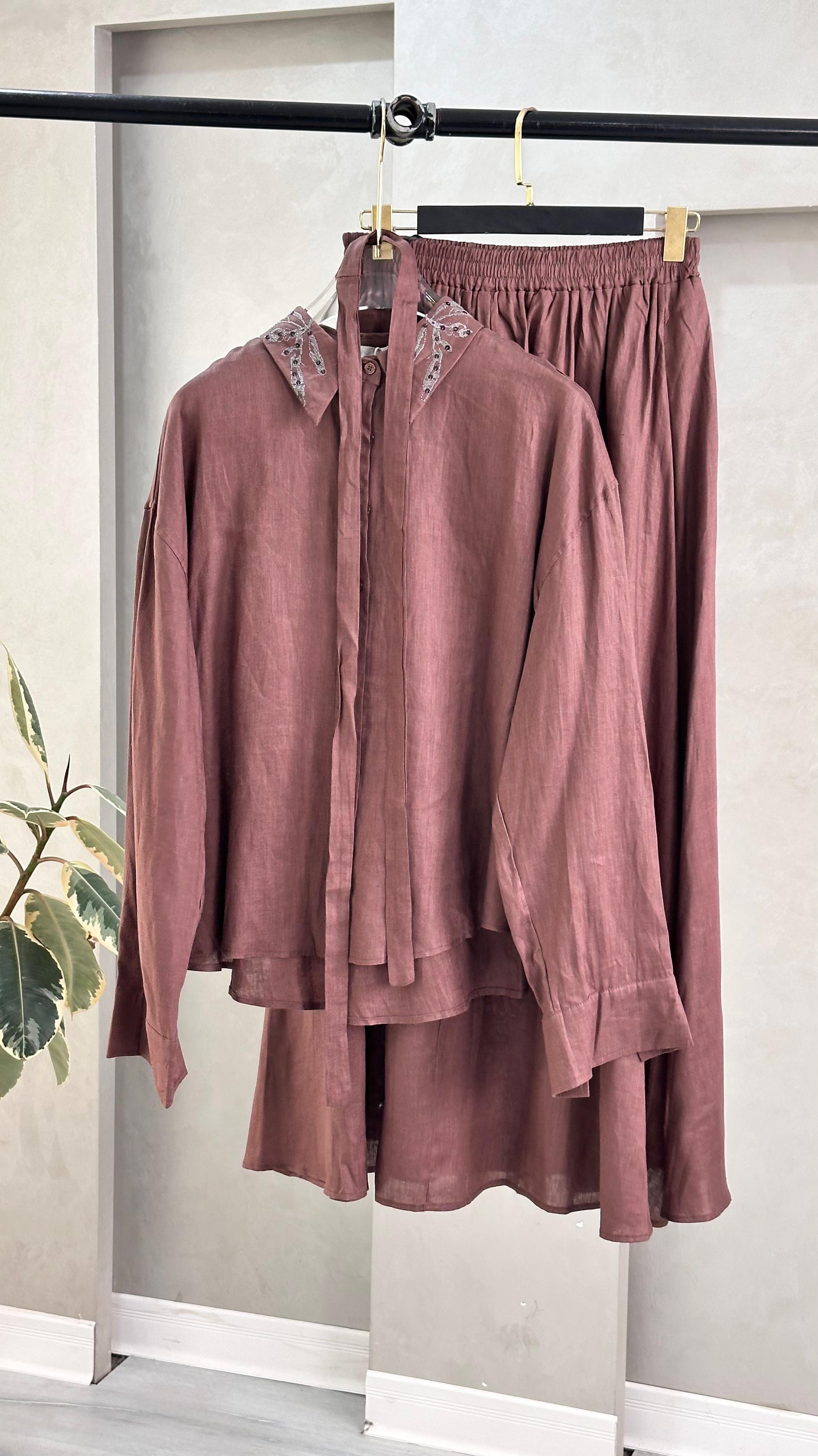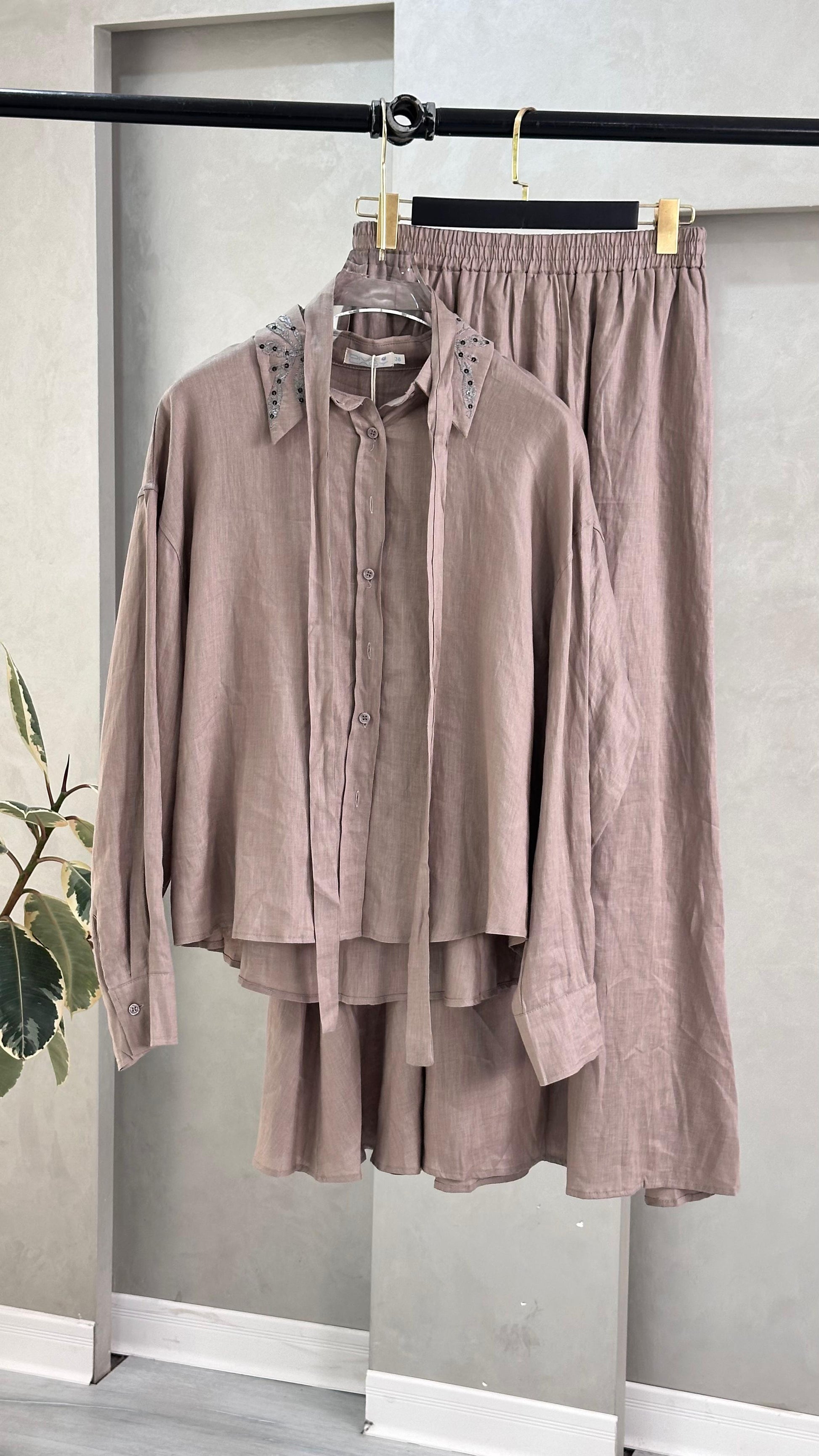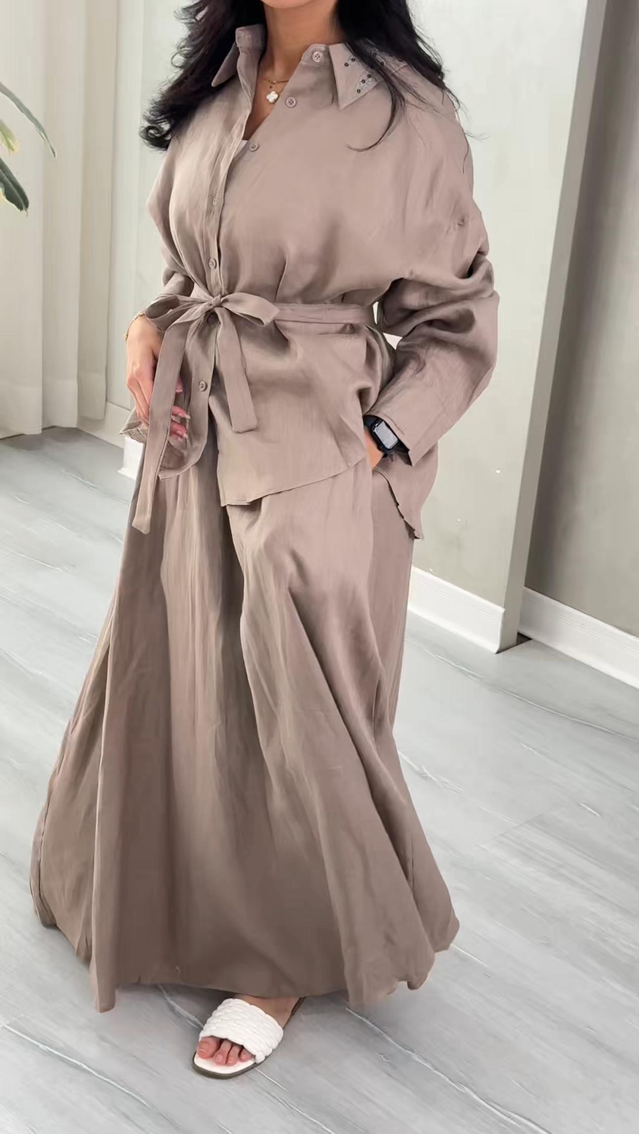 طقم راقٍ ومحتشم يجسد الأناقة الكاملة بلمسة من الرقي الحديث. صمم هذا الزي ليمنحكِ مظهراً متكاملاً وجاهزاً، وهو الخيار الأمثل لإطلالات العمل أو المناسبات النهارية التي تتطلب مظهراً مصقولاً ومريحاً. قطعة عصرية تضمن لكِ أناقة لا مثيل لها.