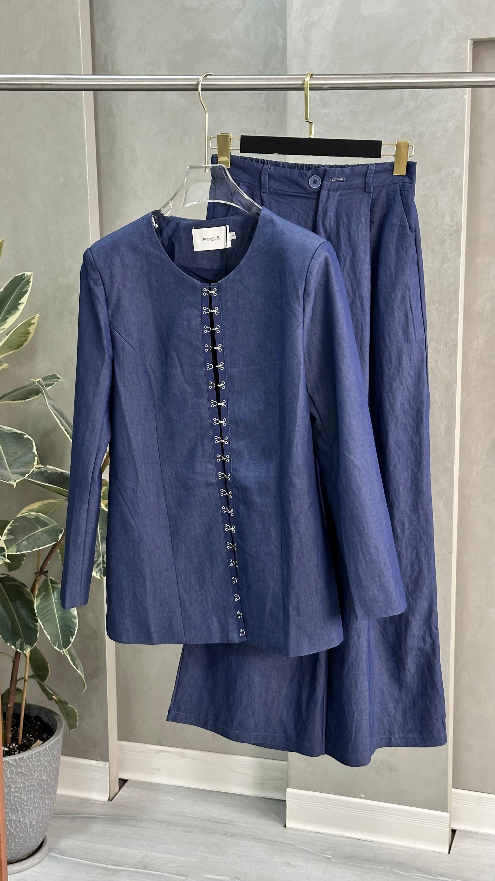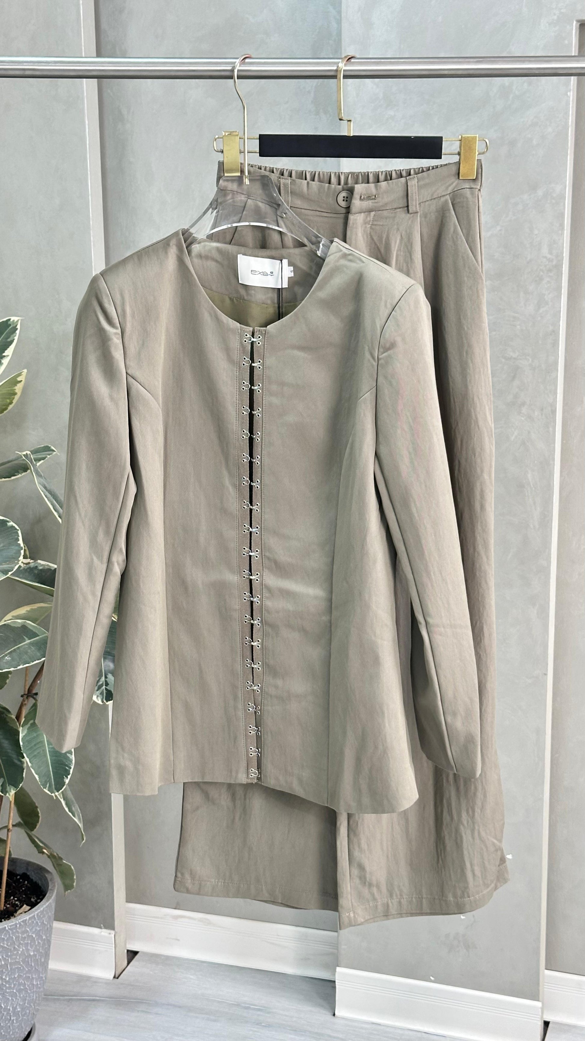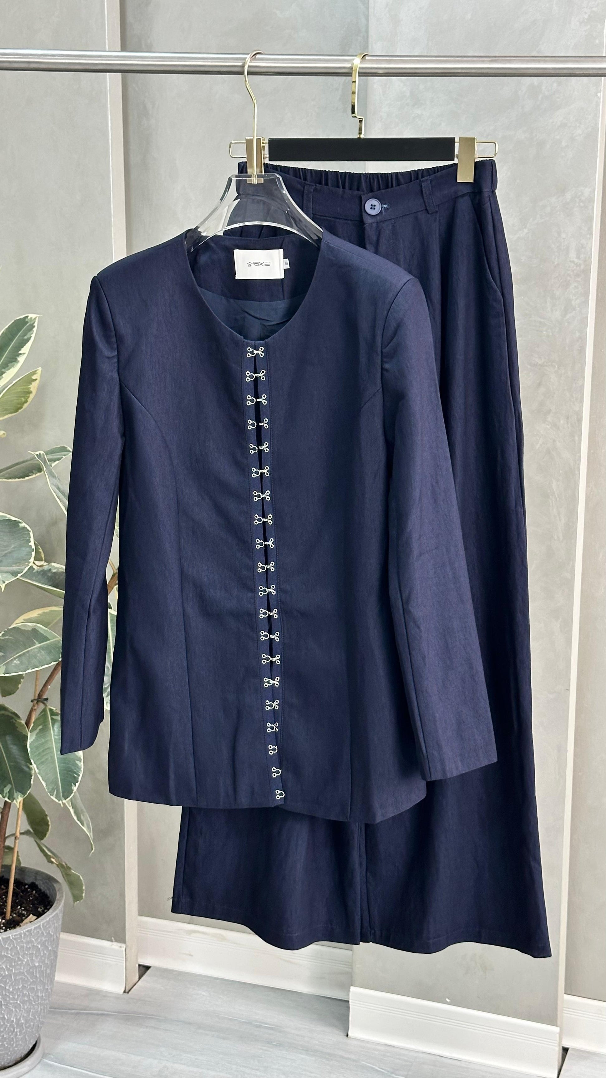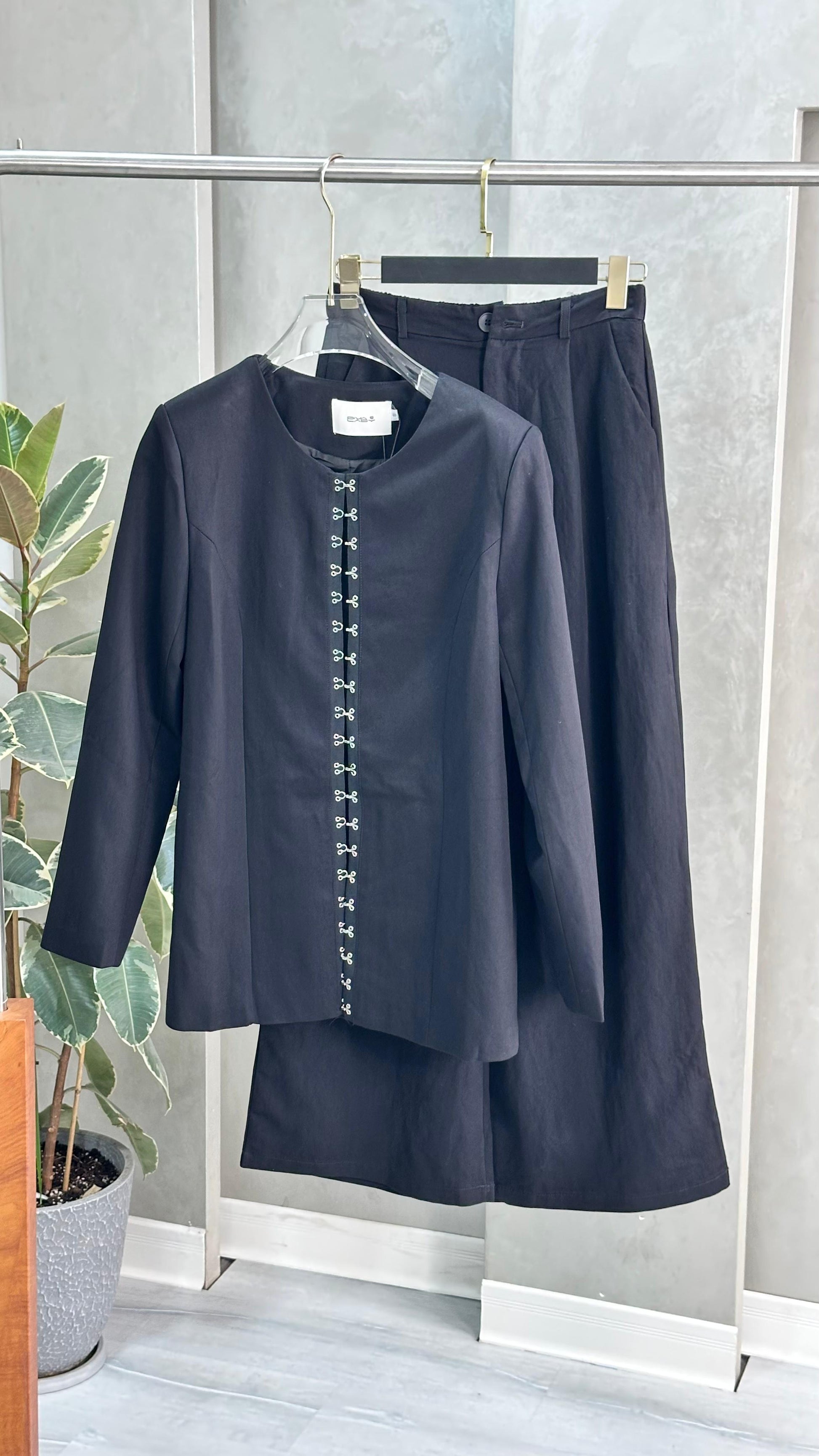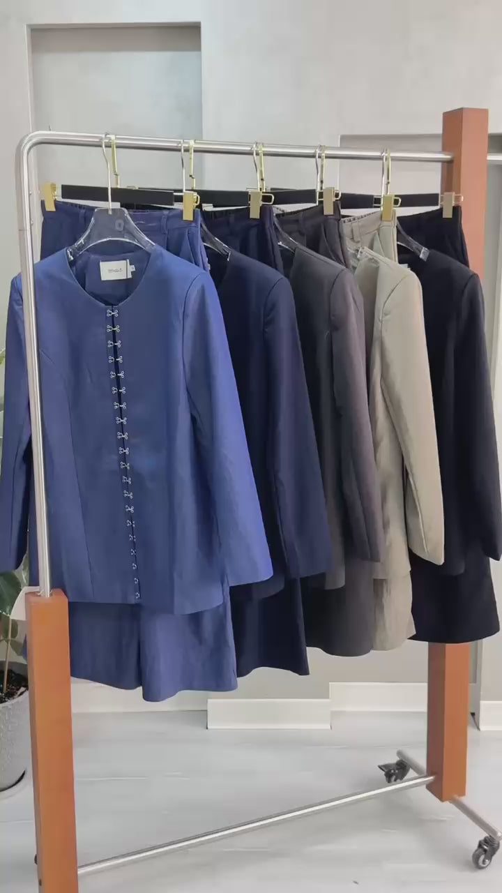 • يظهر على جانب السترة صف من التفاصيل الزخرفية الصغيرة المتكررة على شكل حلقات أو مشابك مرتّبة بشكل عمودي، مما يضيف لمسة مميزة للتصميم.