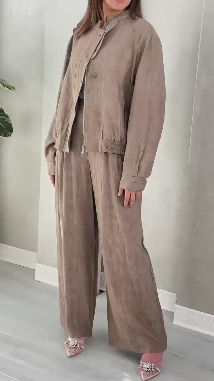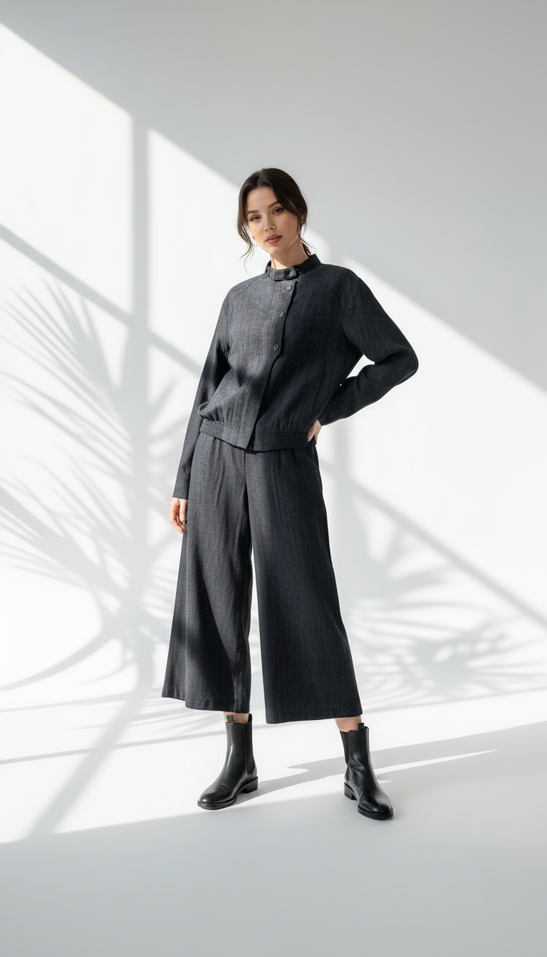 • بنطال واسع الساقين بنفس خامة البلوزة، بقصّة منسدلة ومريحة، ويصل طوله إلى أسفل الكاحل.