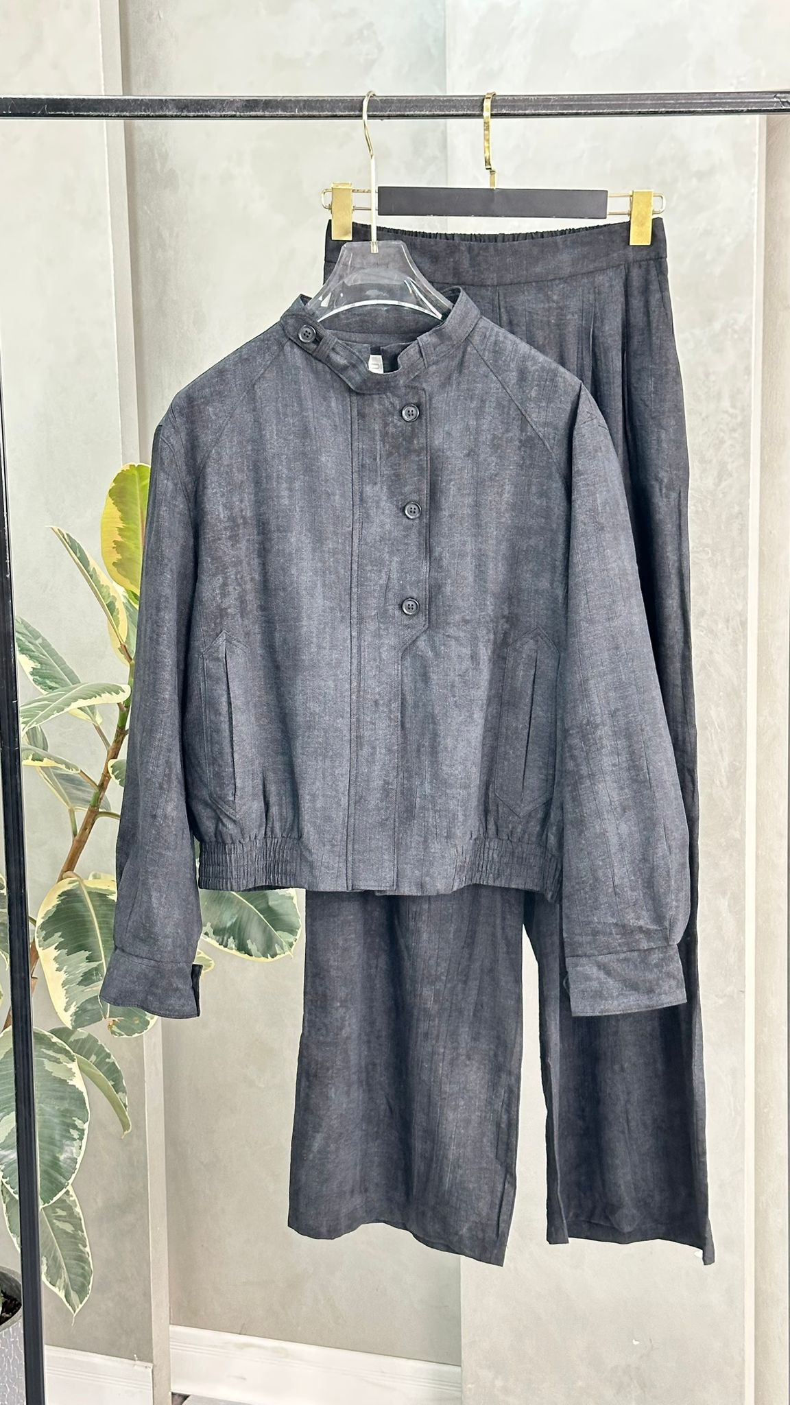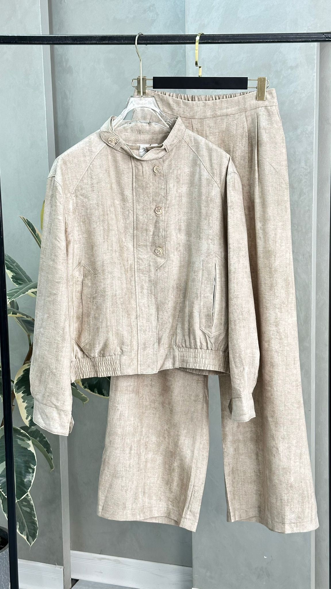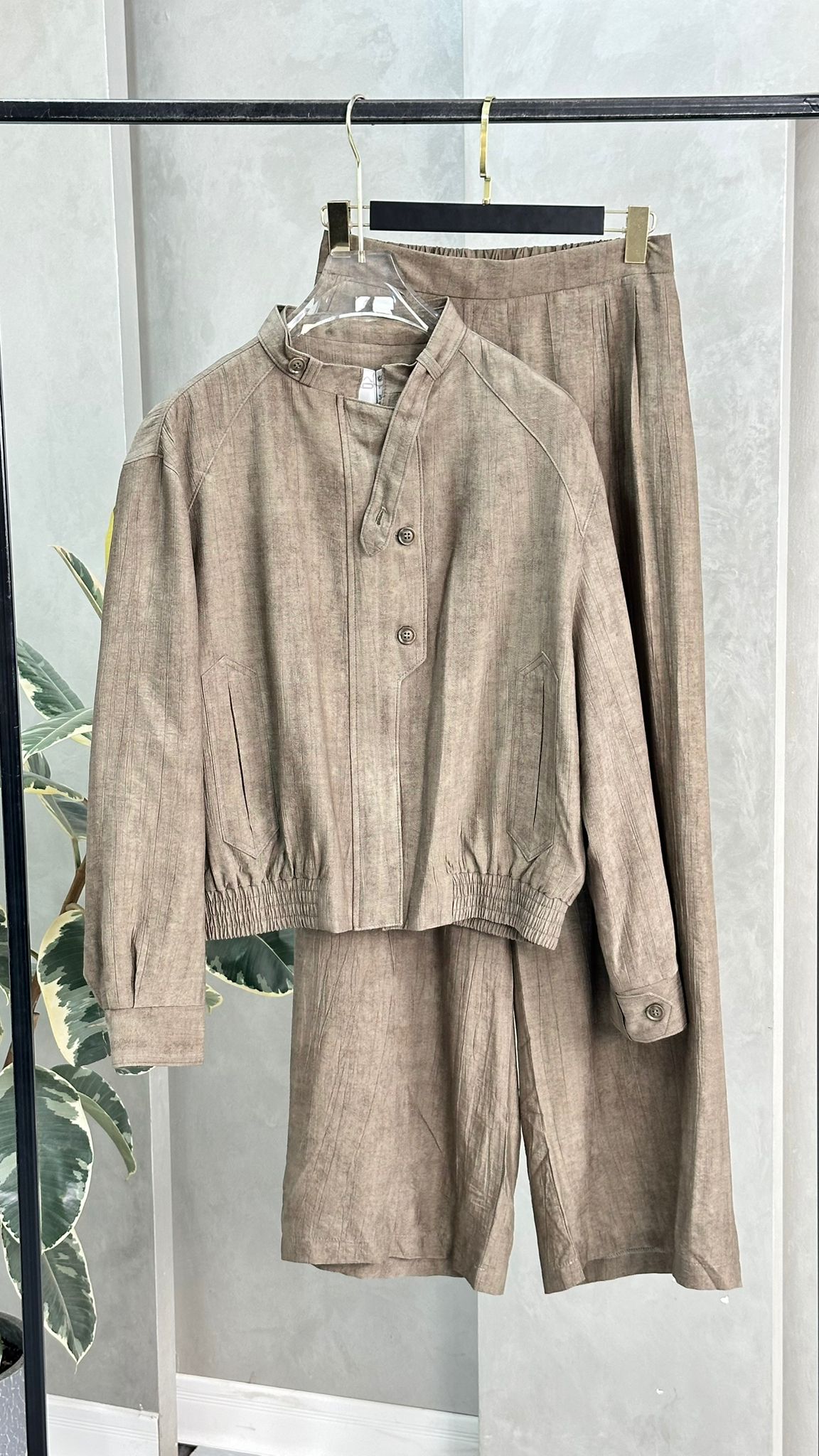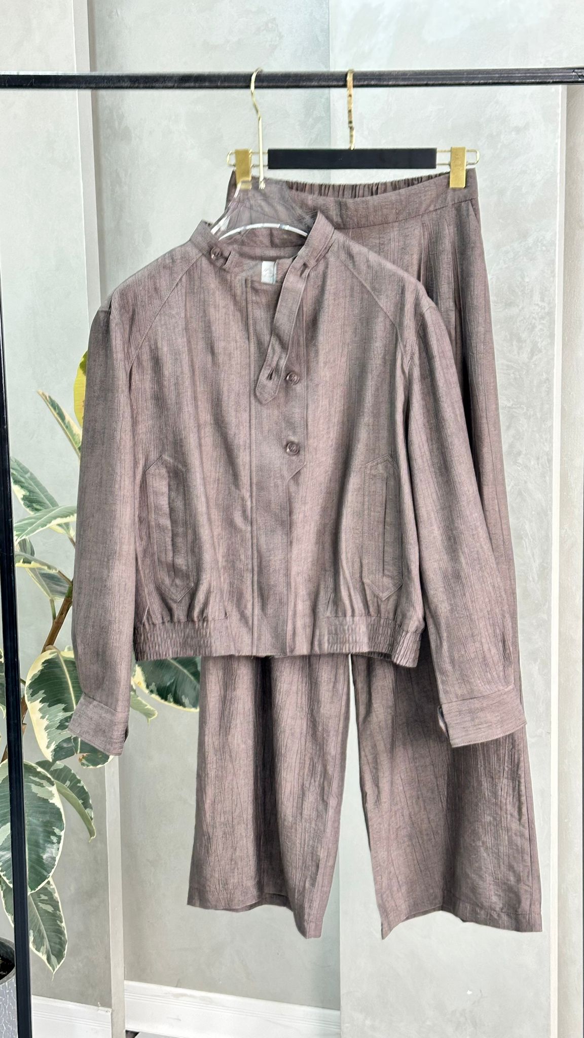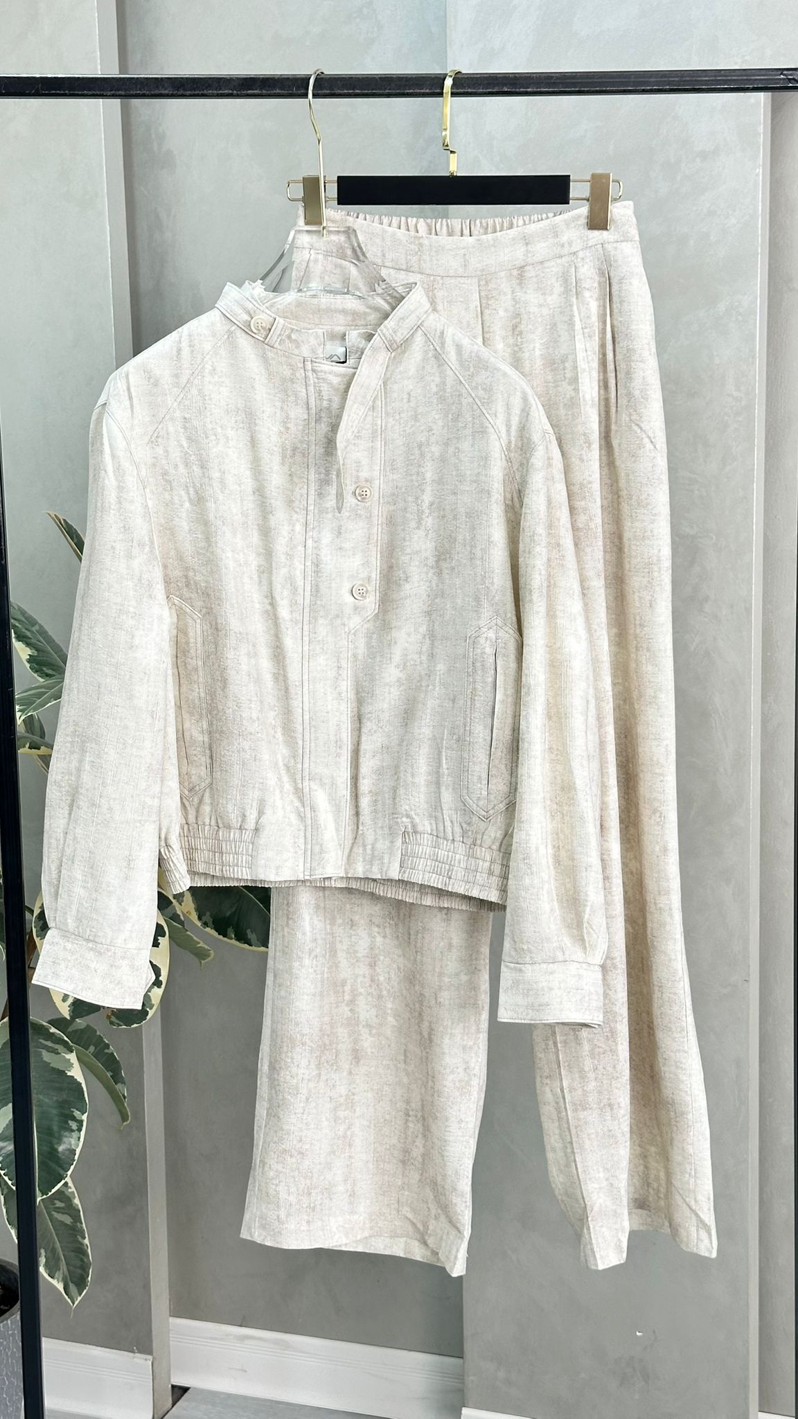 الخامة متماسكة وناعمة، والطقم بشكل عام يمنح إحساسًا بالراحة مع لمسة أناقة بسيطة. الإضاءة الجانبية تُلقي ظلال النباتات على الجدار والأرض، مما يضيف طابعًا فنيًا للصورة.