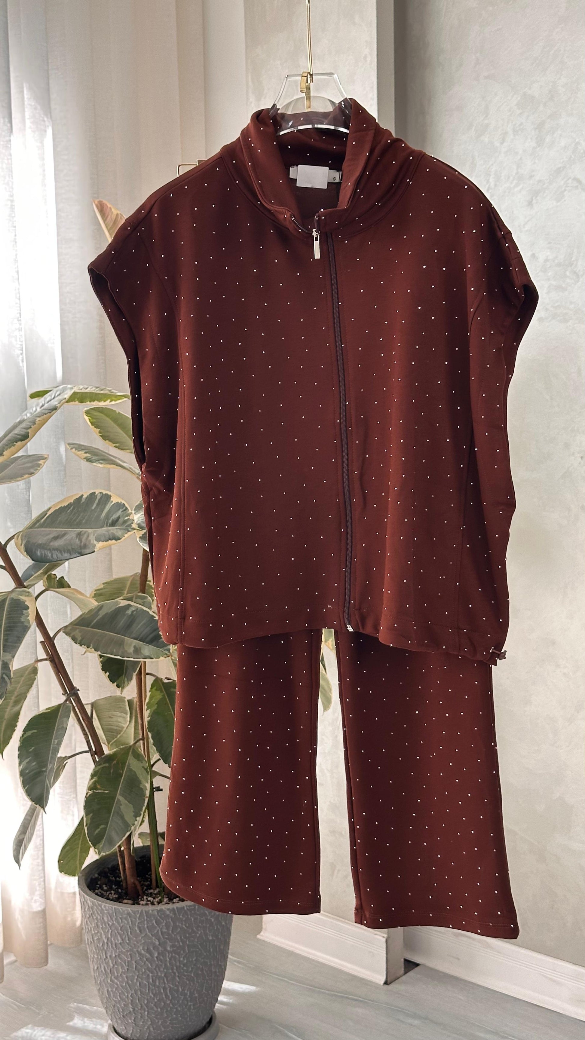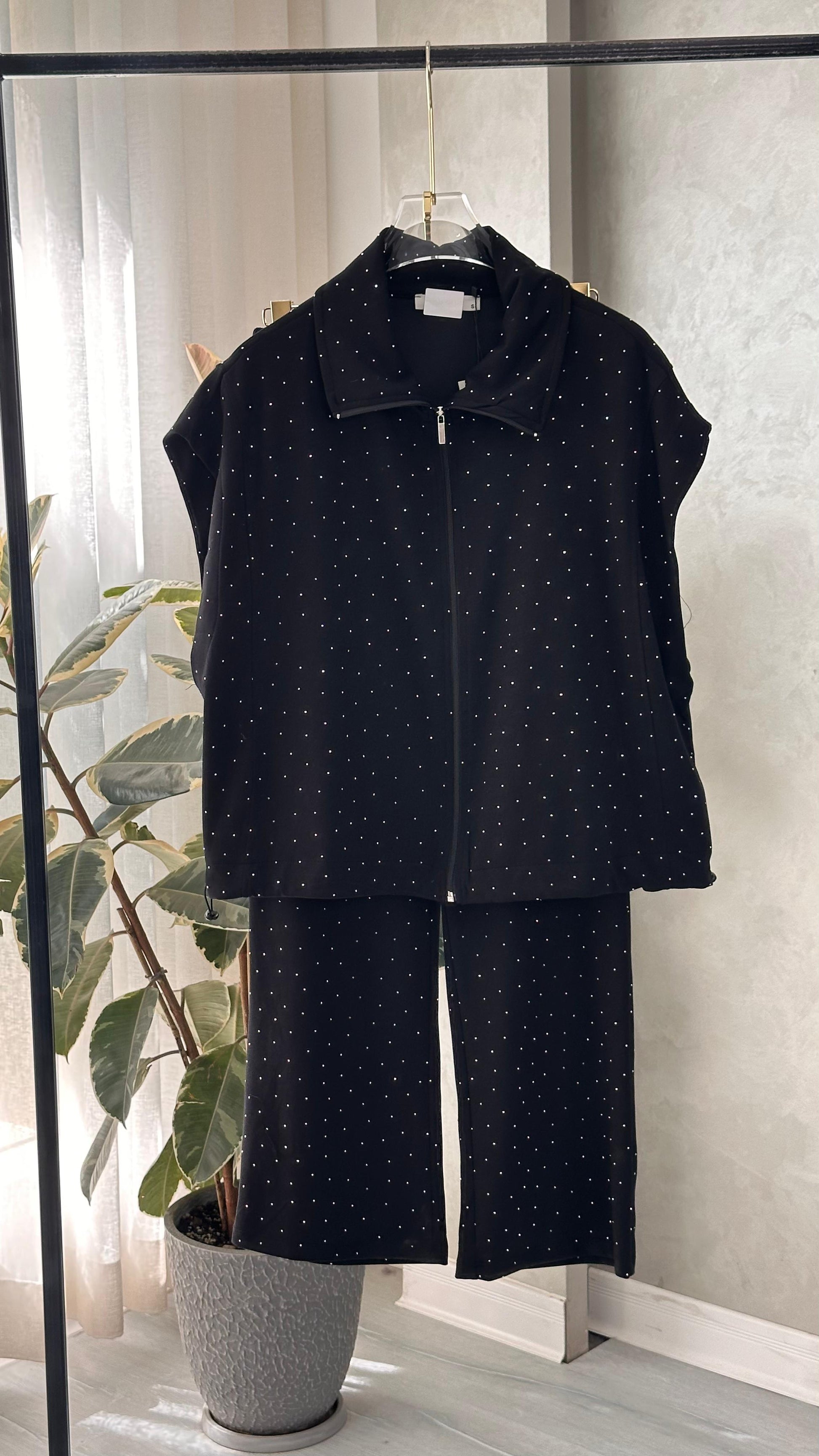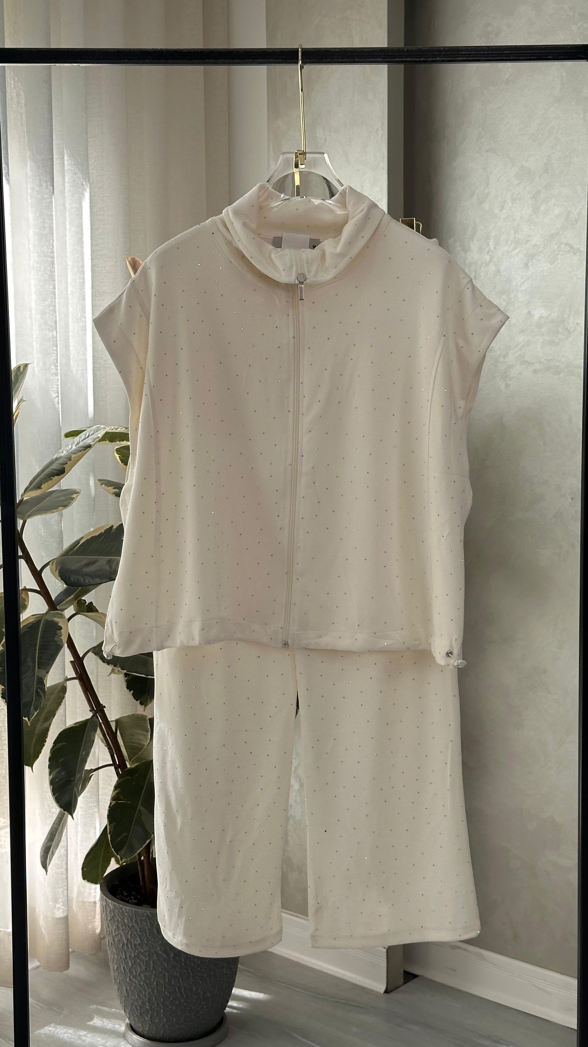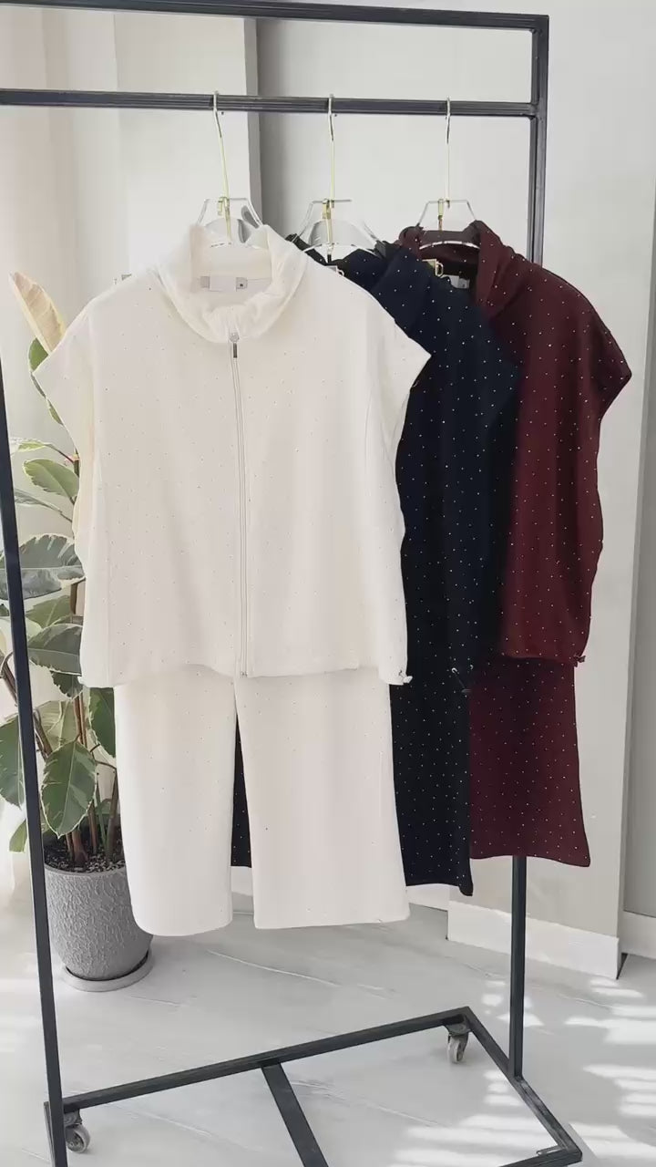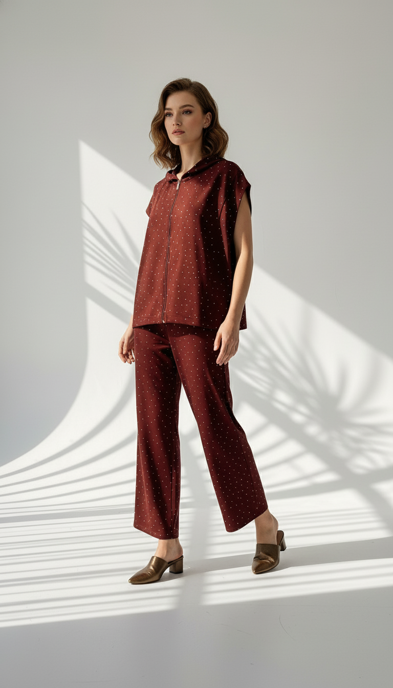 الطقم يتكوّن من بلوزة بلا أكمام وبنطال متناسقين، كلاهما بتصميم ناعم ومُزيَّن بنقشات صغيرة متكررة تضيف لمسة أنثوية بسيطة.