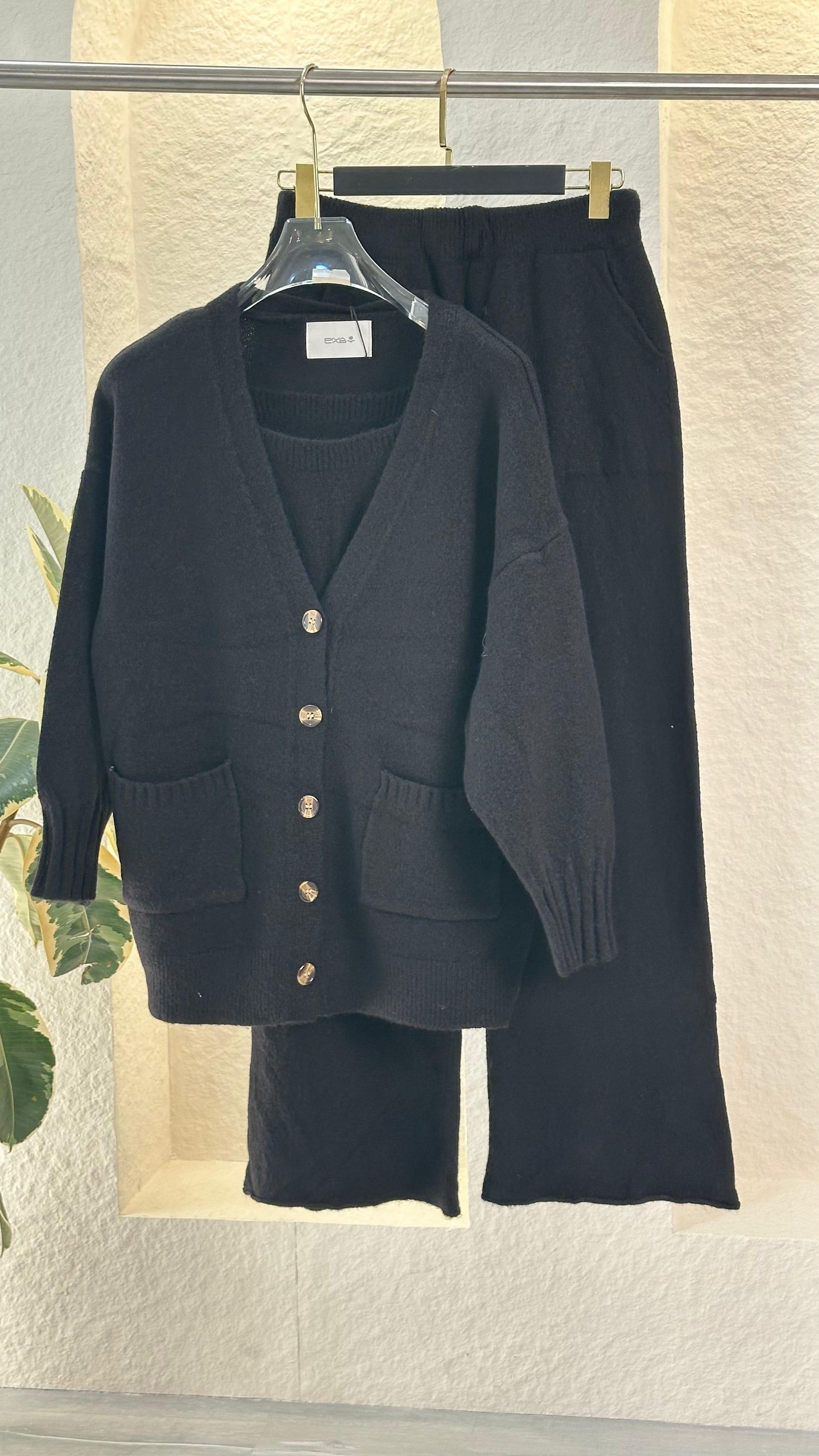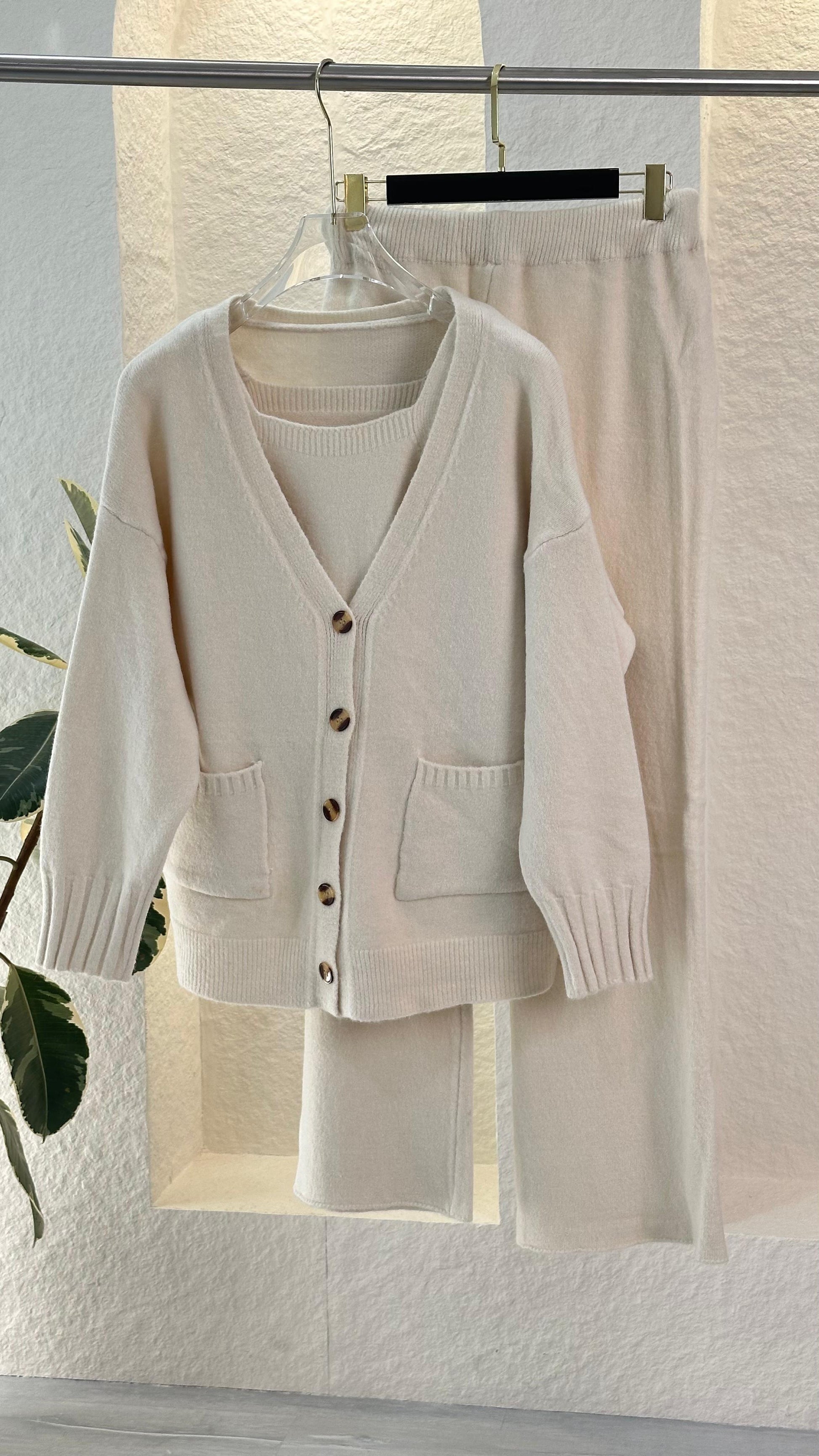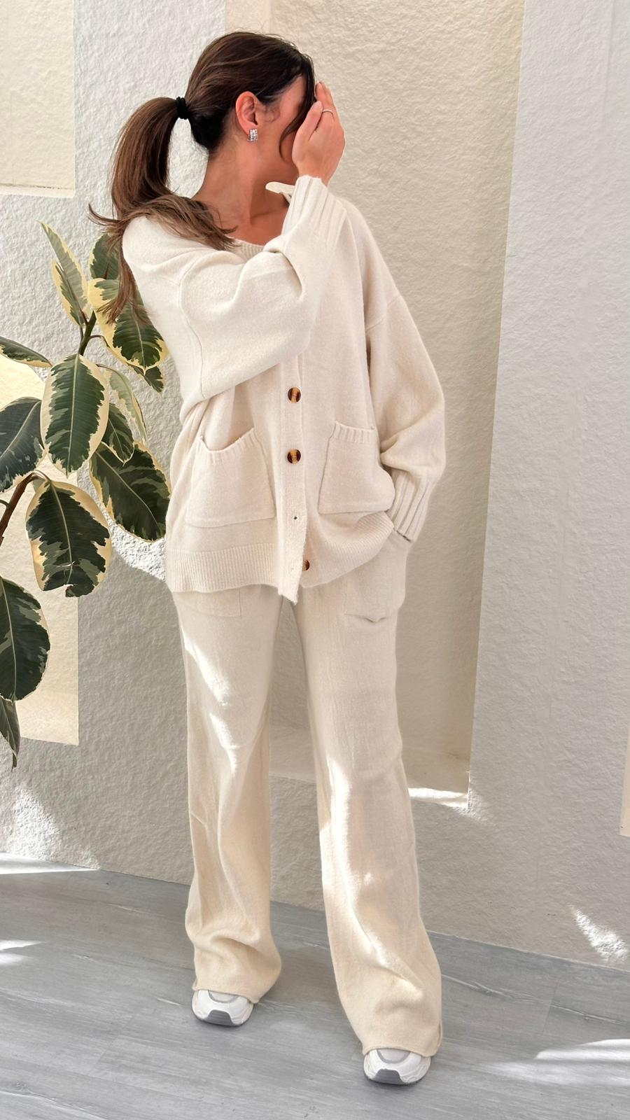 هذا الطقم المحبوك المريح المكون من قطعتين هو المزيج المثالي بين الراحة والأناقة البسيطة. يتميز بكارديجان مريح بأزرار أمامية وجيوب عملية، ويمكن تنسيقه مع بنطال ناعم واسع الساقين لإطلالة متناسقة ومريحة. نسيجه المحبوك المسامي وتصميمه البسيط يجعله مثاليًا للاسترخاء في المنزل أو الخروج بأناقة غير رسمية.
