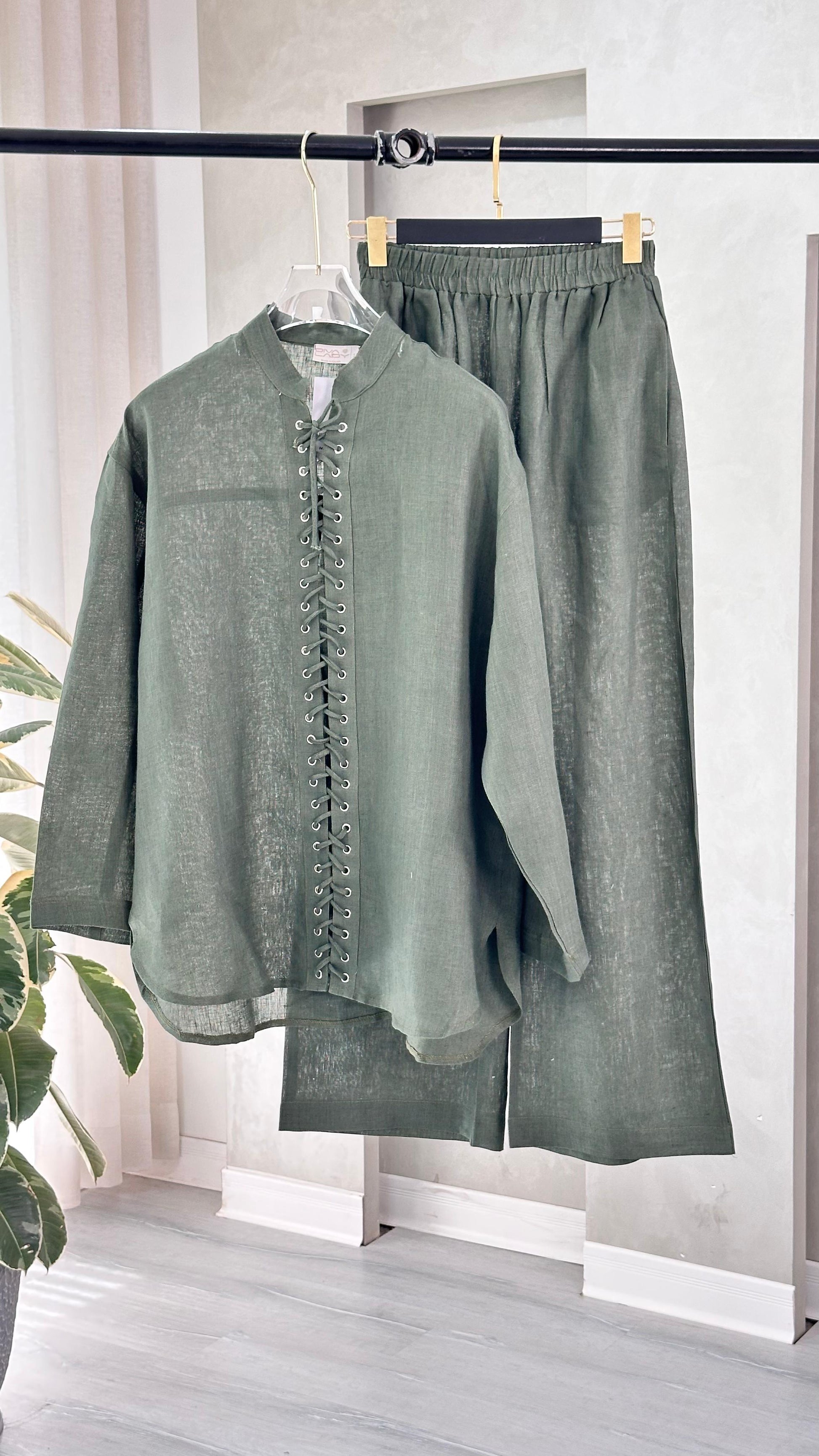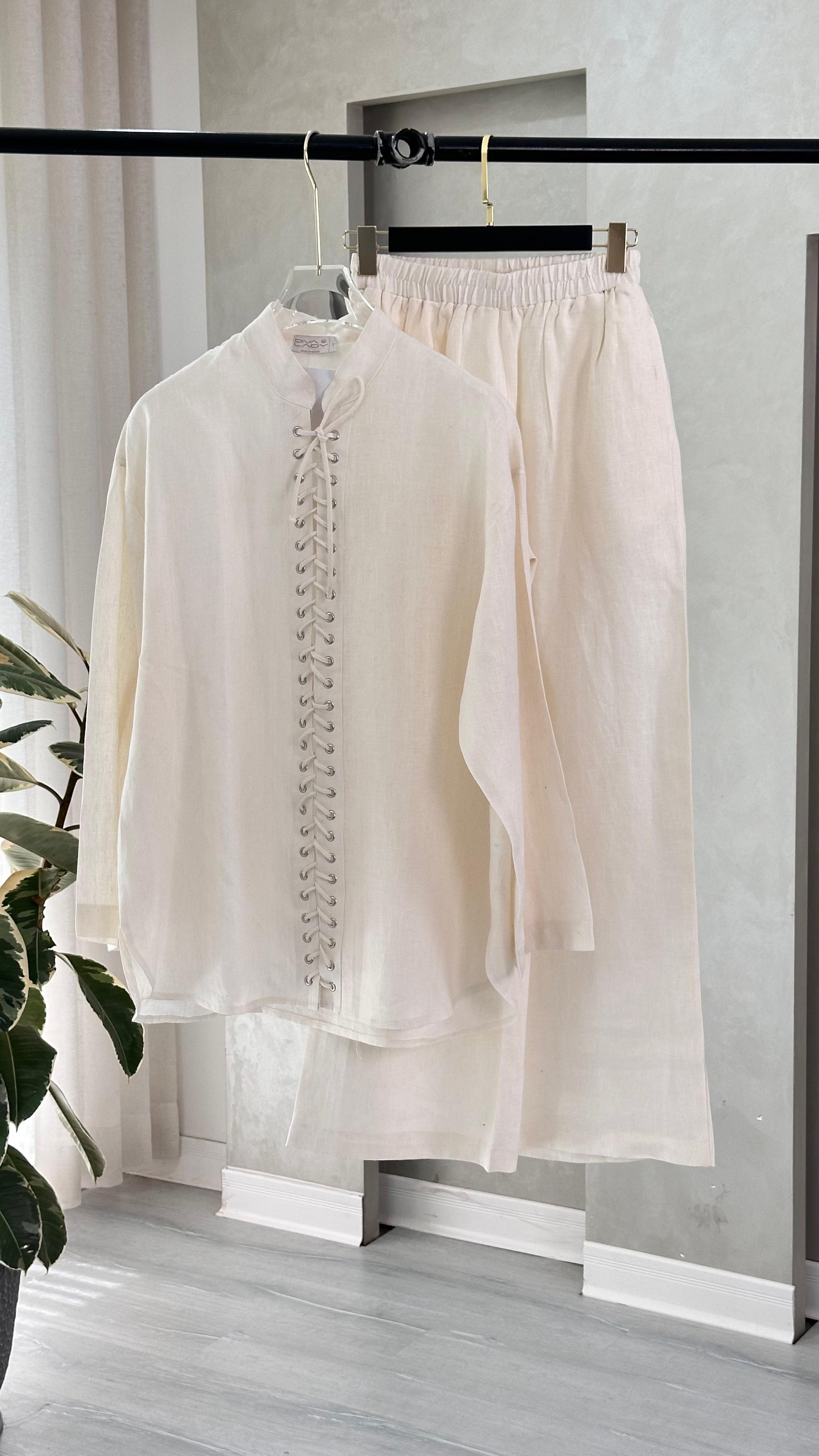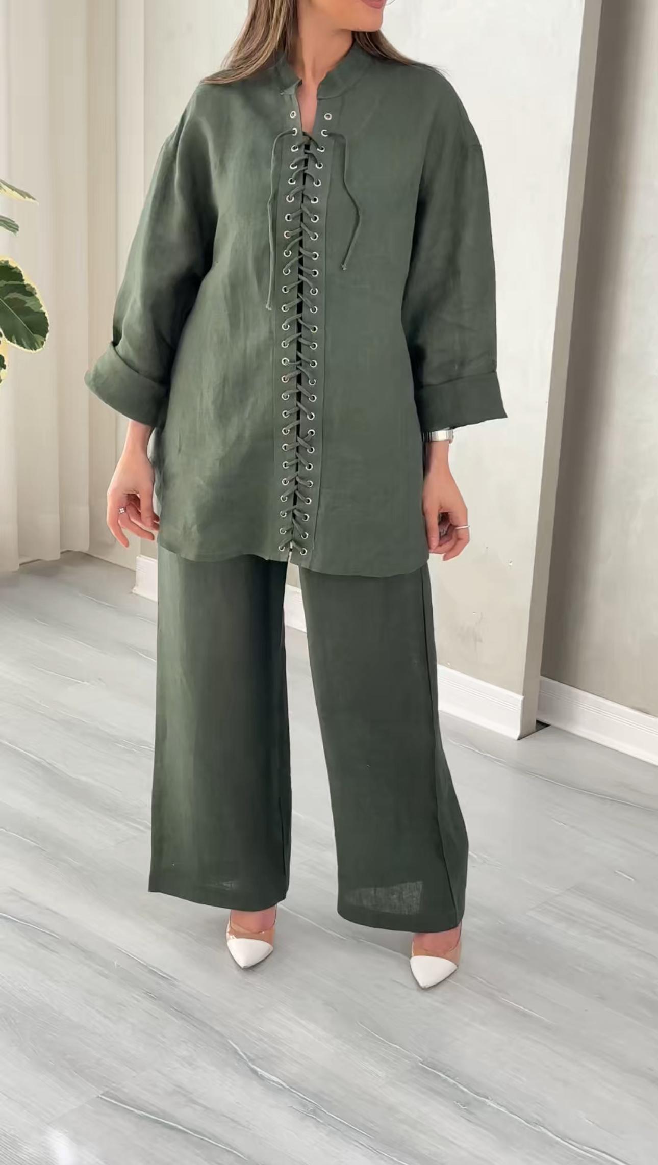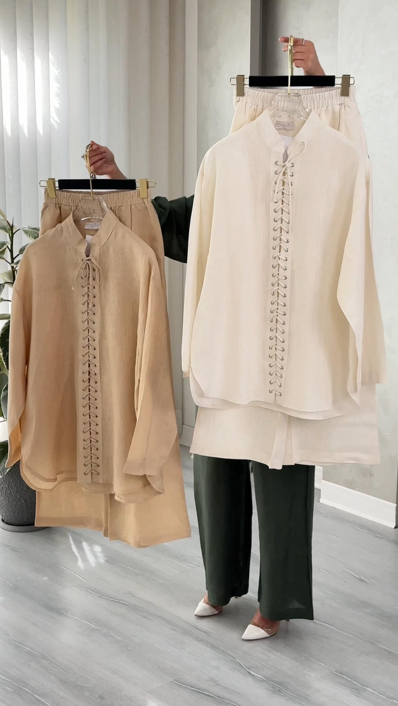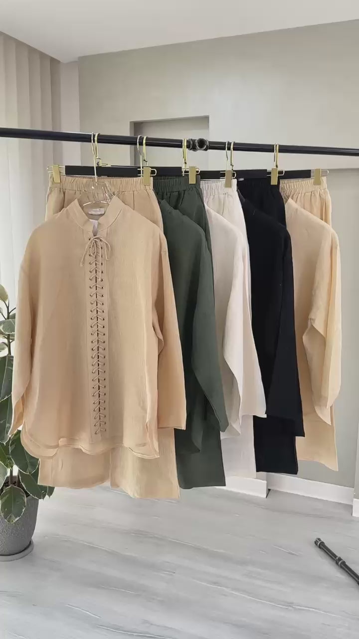 التصميم يتألف من قميص وبنطال بقصة واسعة ومريحة. يتميز القميص بتفصيل أمامي فريد عبارة عن زخرفة أنيقة من الكشكشة أو الخيوط المنسوجة بشكل عمودي عند المنتصف، مع ياقة مدورة مفتوحة قليلاً. الأكمام طويلة ويمكن طيها. الخامة مصنوعة بالكامل من خامة "اللين" (الكتان) الصيفي الممتاز بنسبة 100%، مما يضمن خفة الوزن والتهوية العالية. القصة هي قصة فضفاضة وعملية، وتُعد إضافة ضرورية إلى خزانة ملابسك الأساسية تعكس اختياراتك الراقية والفريدة، ومناسبة للإطلالات الكاجوال والأنيقة.