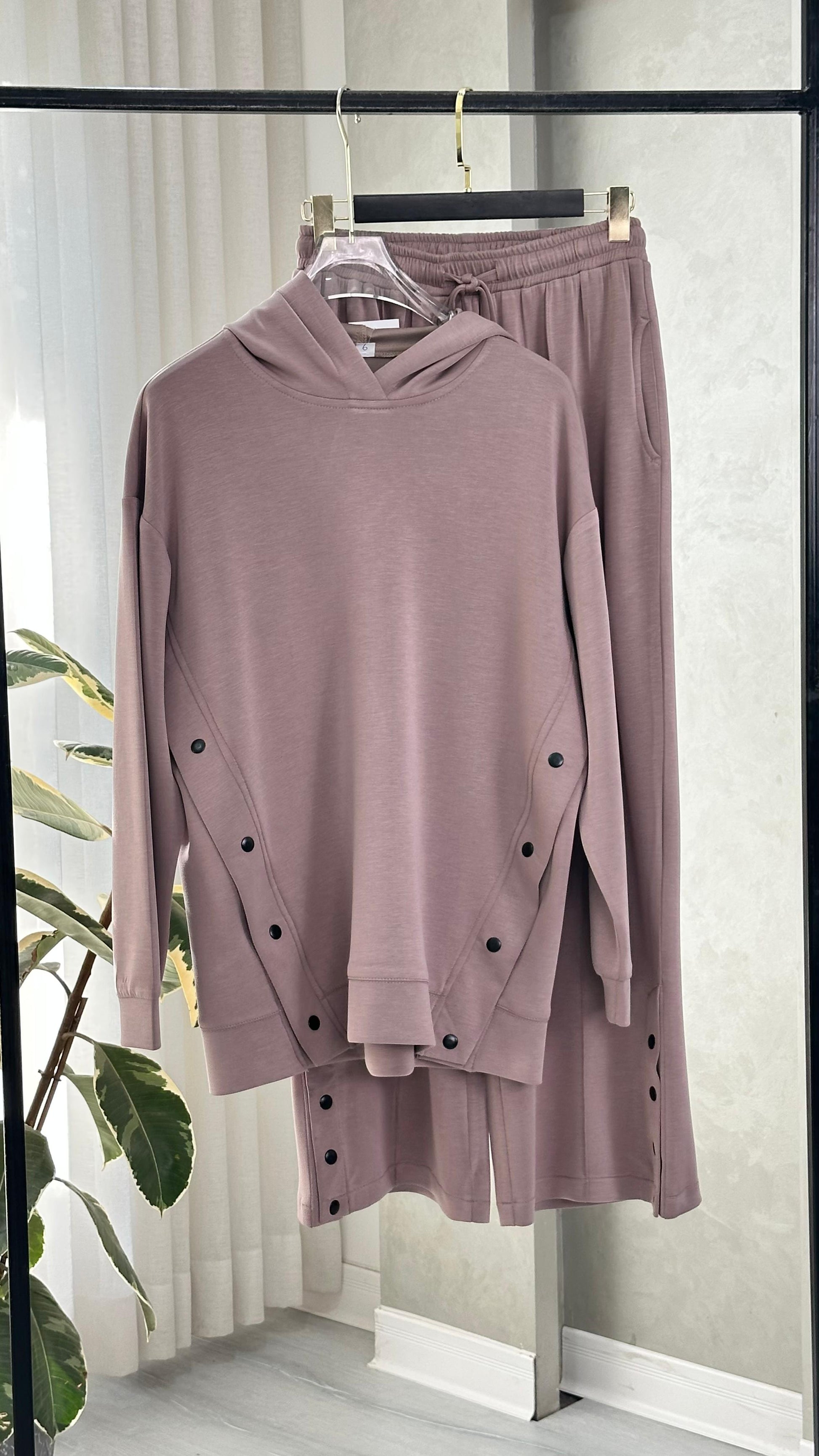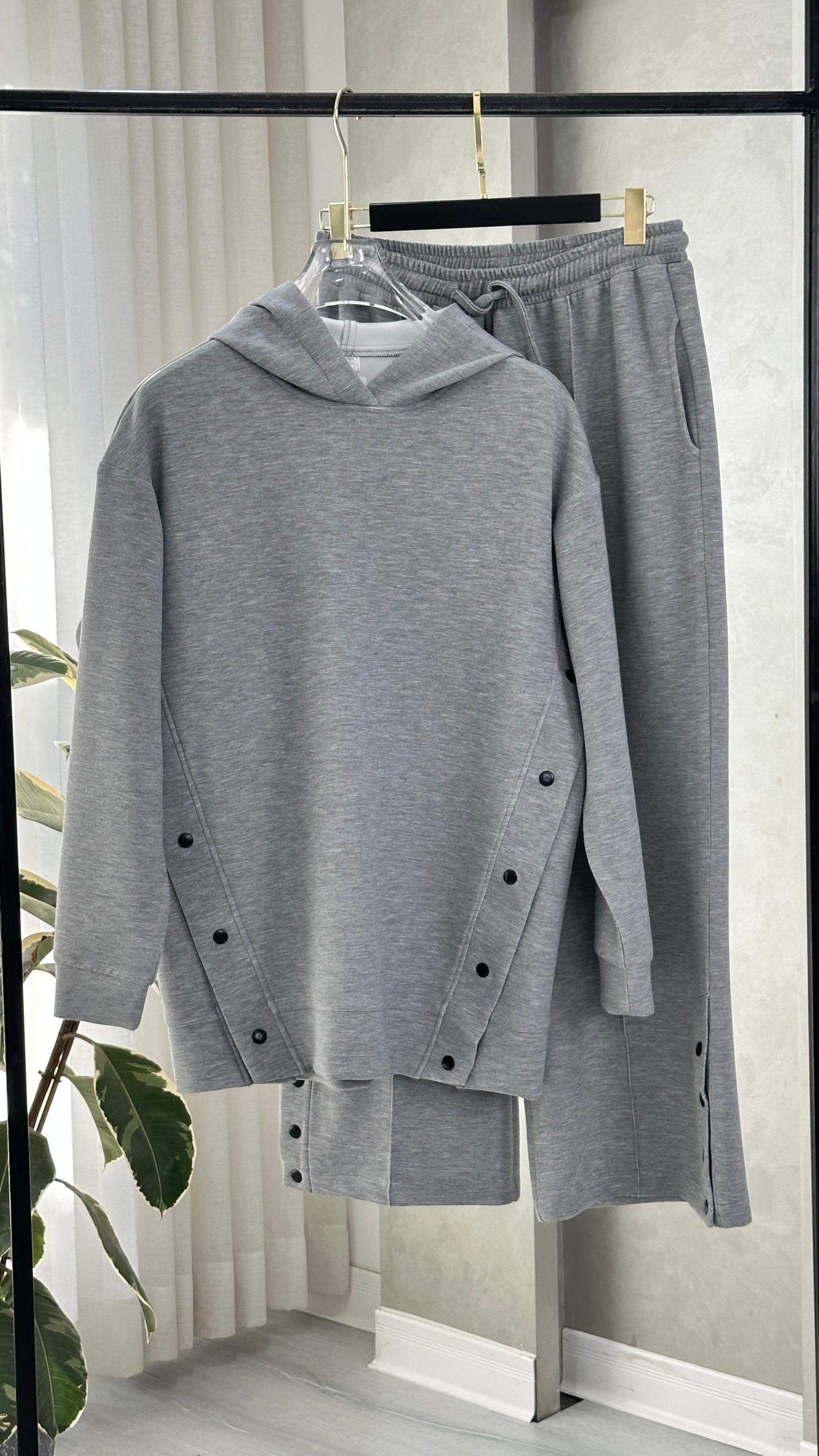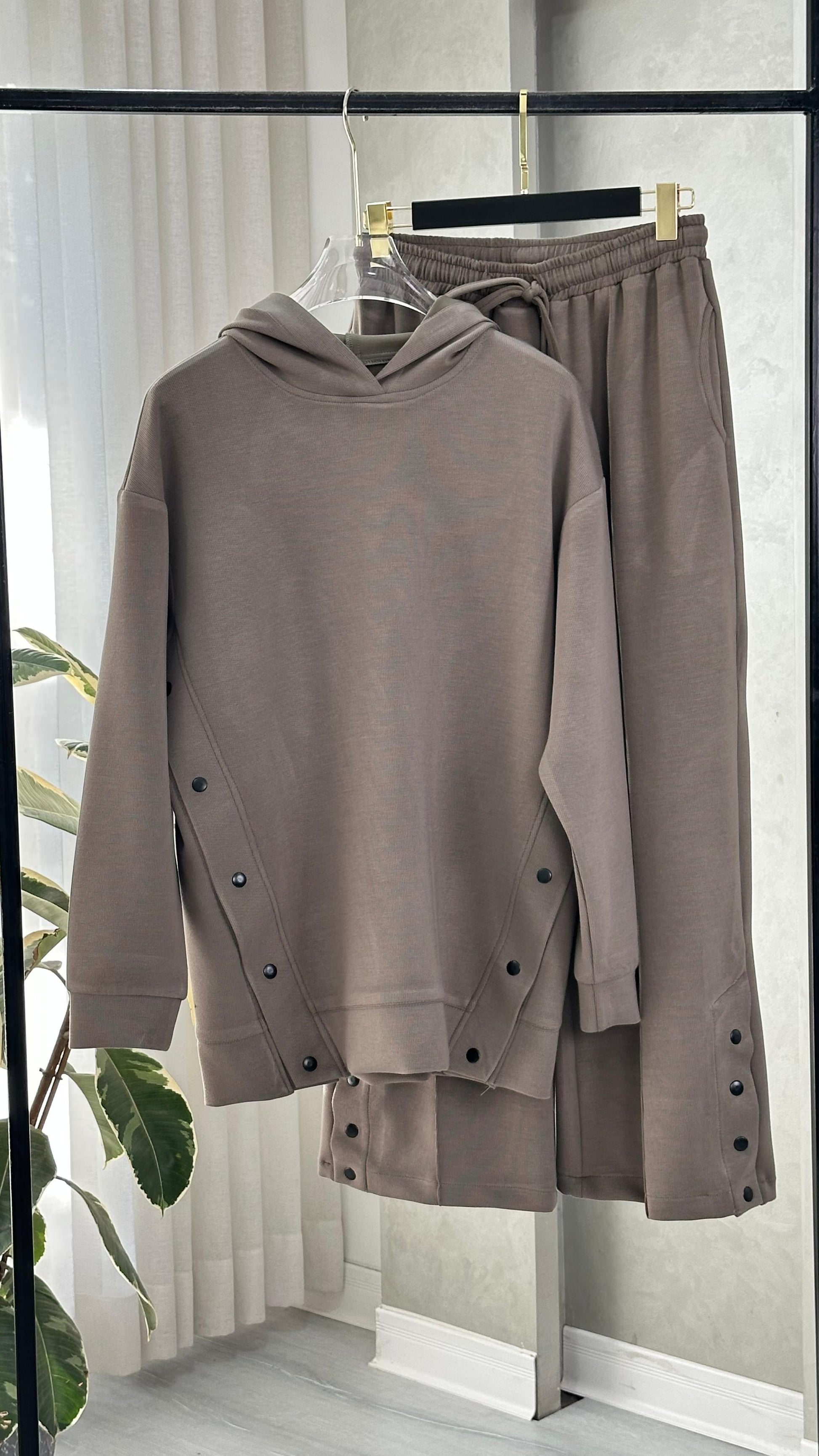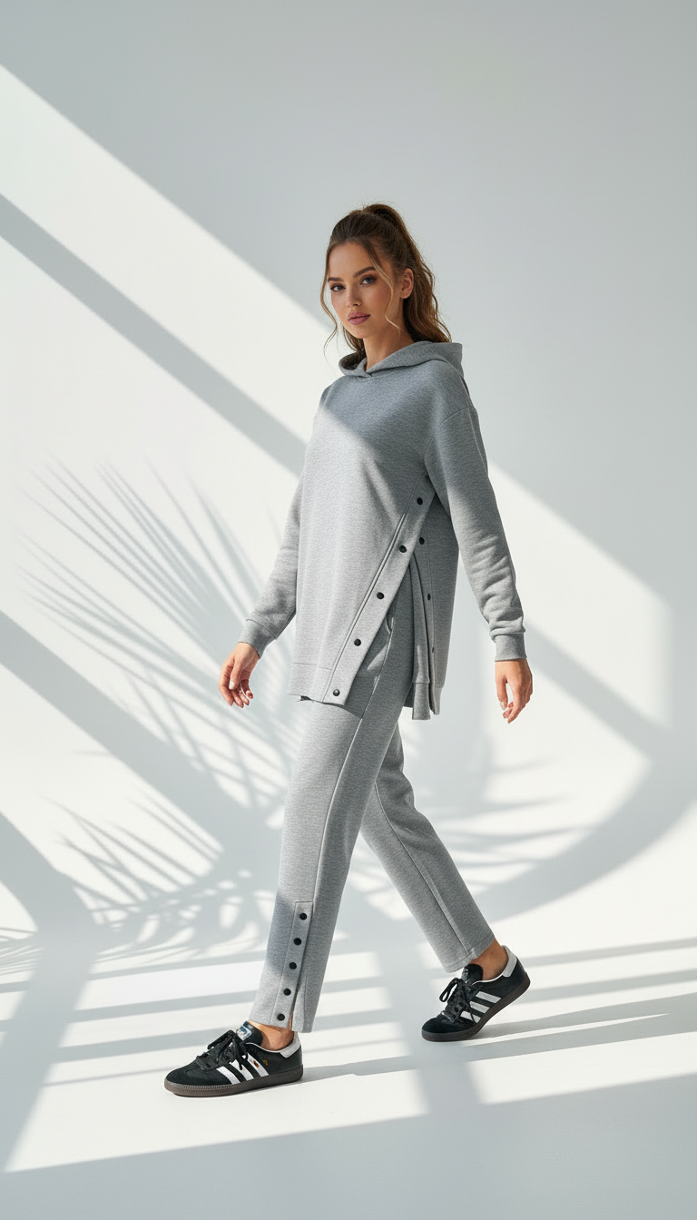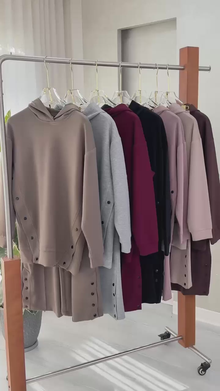 • على جانبي السويت شيرت يوجد صف أزرار ممتد من أسفل الإبط حتى أسفل القصة، يمنح شكلاً عصريًا ويمكن فتحه للتحكم بالوسع أو لإظهار طبقة أخرى.