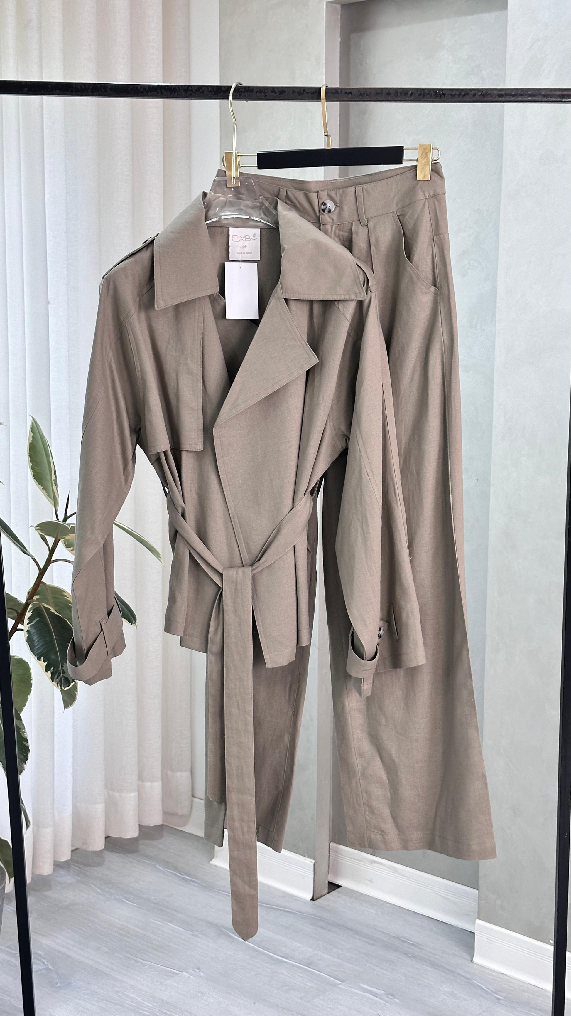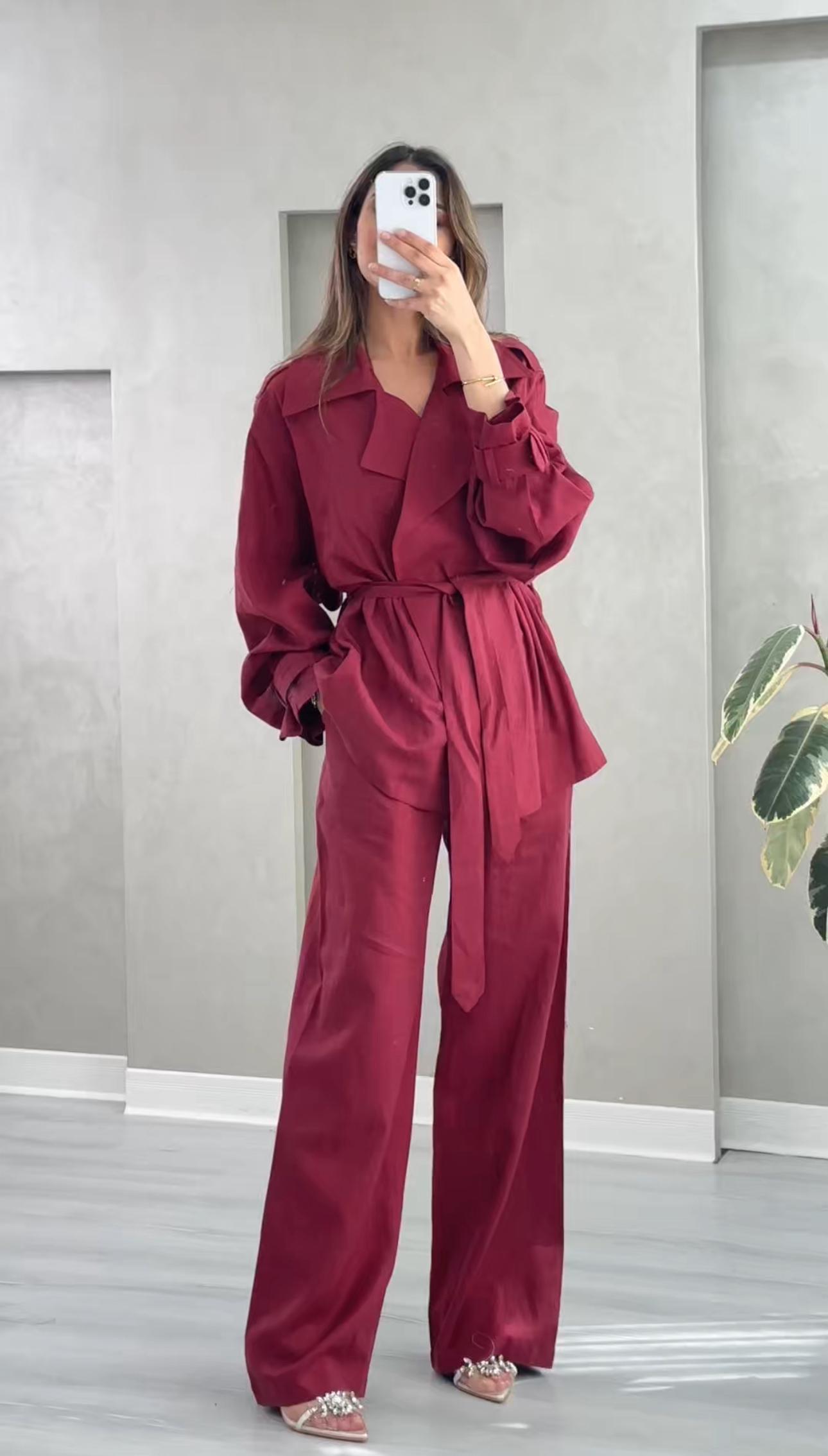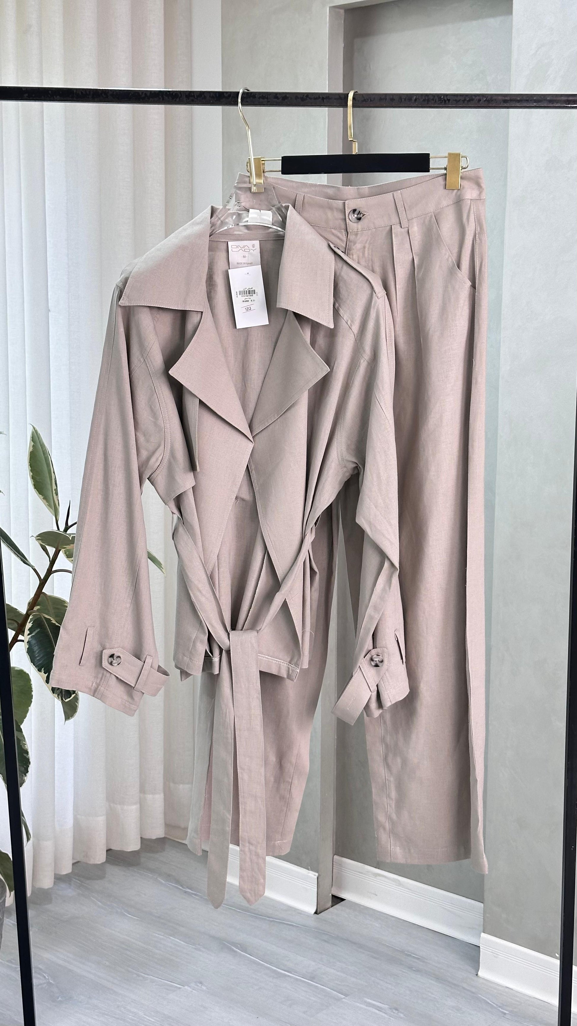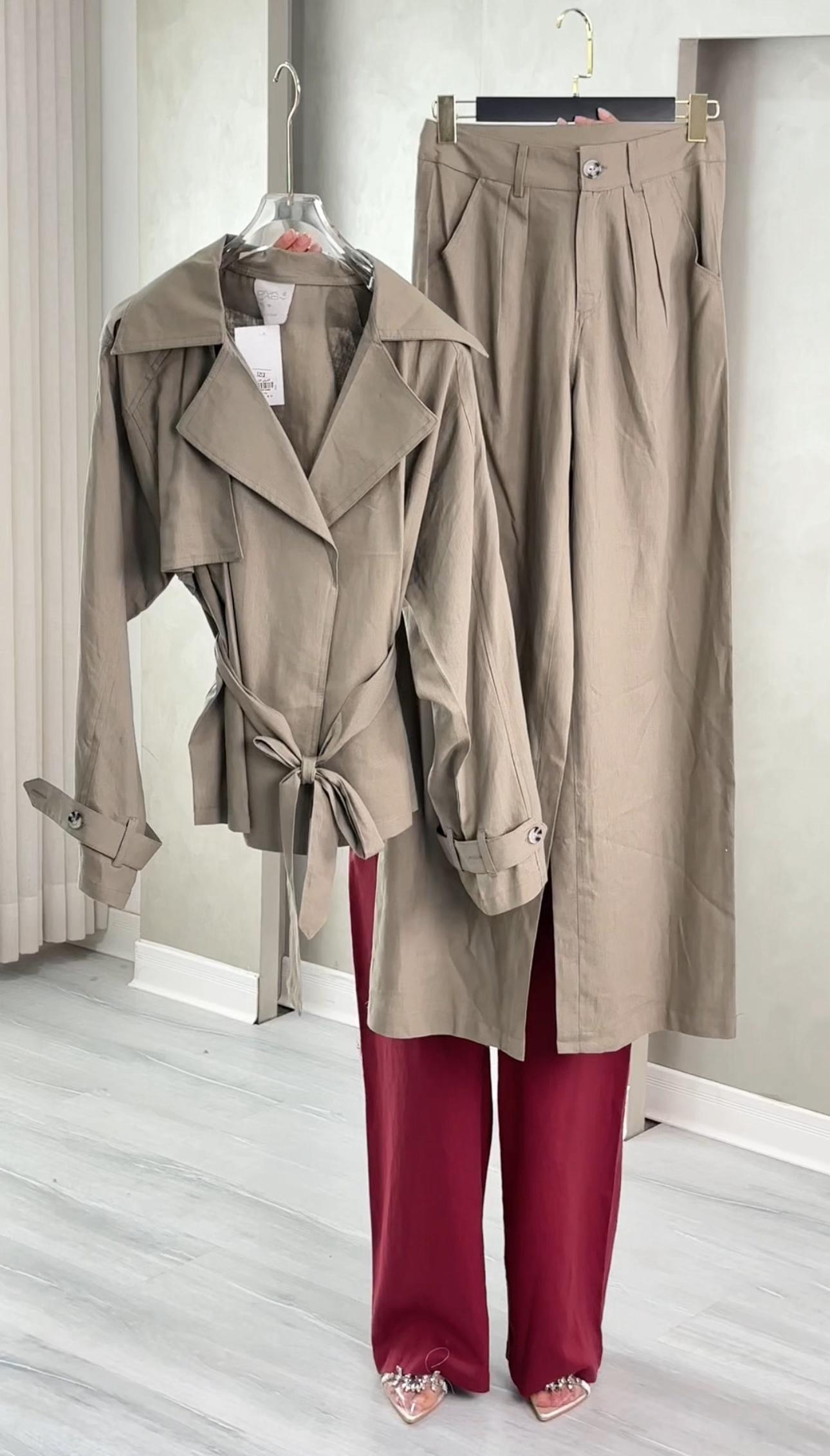 طقم نسائي أنيق يناسب الإطلالات الرسمية والكاجوال الراقية، يتكون من معطف طويل بتصميم كلاسيكي مع ياقة عريضة وحزام خصر يضفي لمسة أنثوية جذابة، بالإضافة إلى بنطال واسع بخصر مرتفع يمنحك مظهرًا عصريًا وانسيابيًا. خامة خفيفة ومريحة، مثالي للموسم الانتقالي والمناسبات العملية.