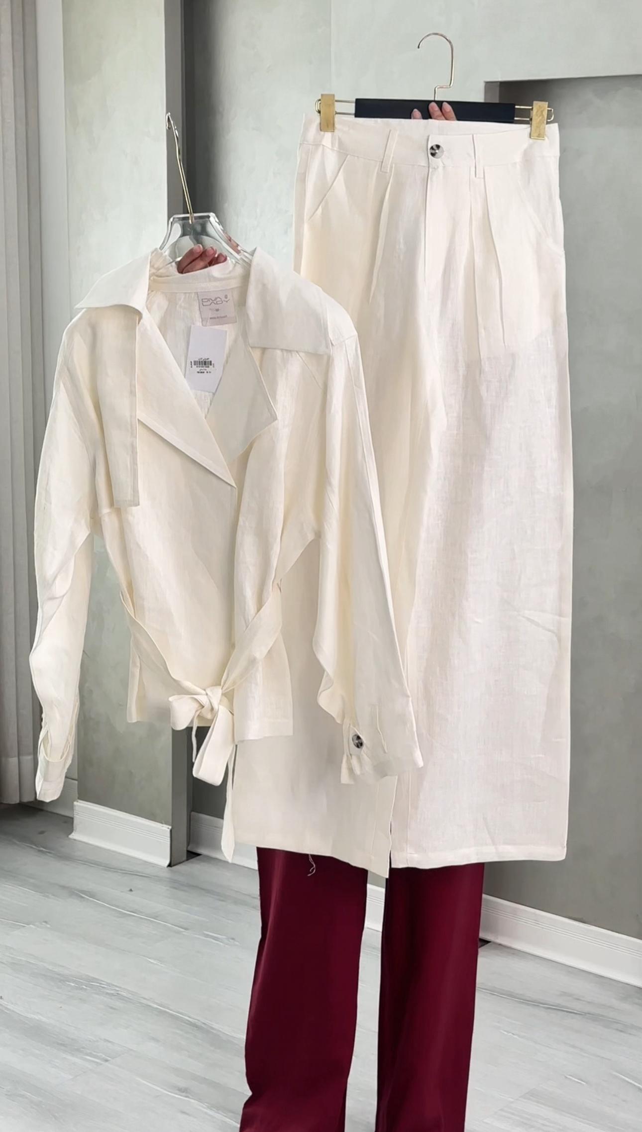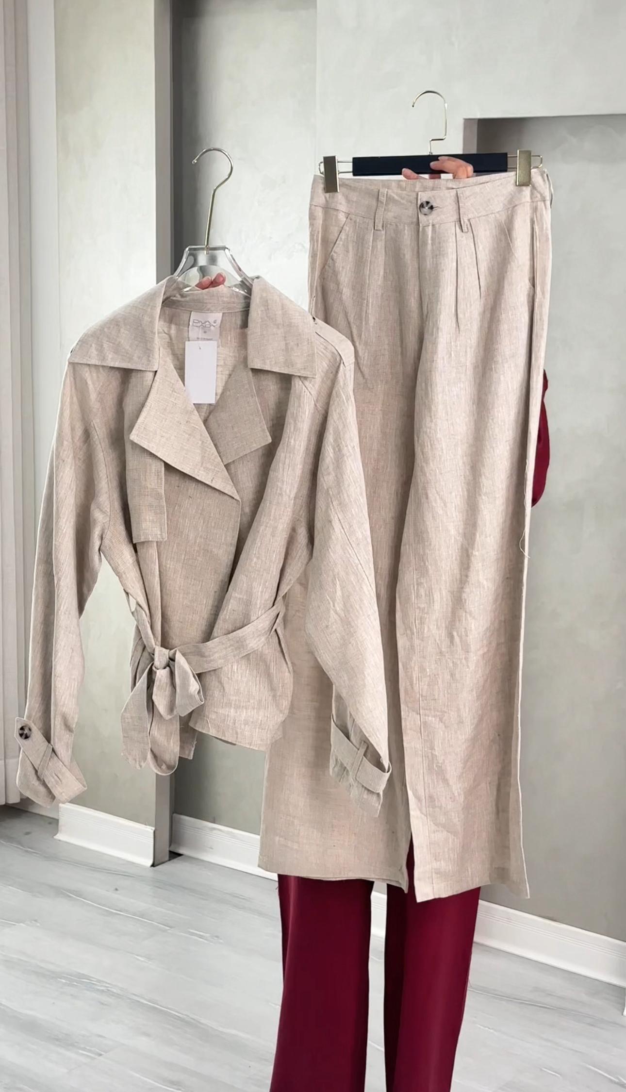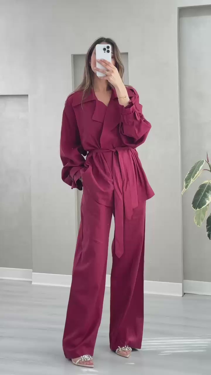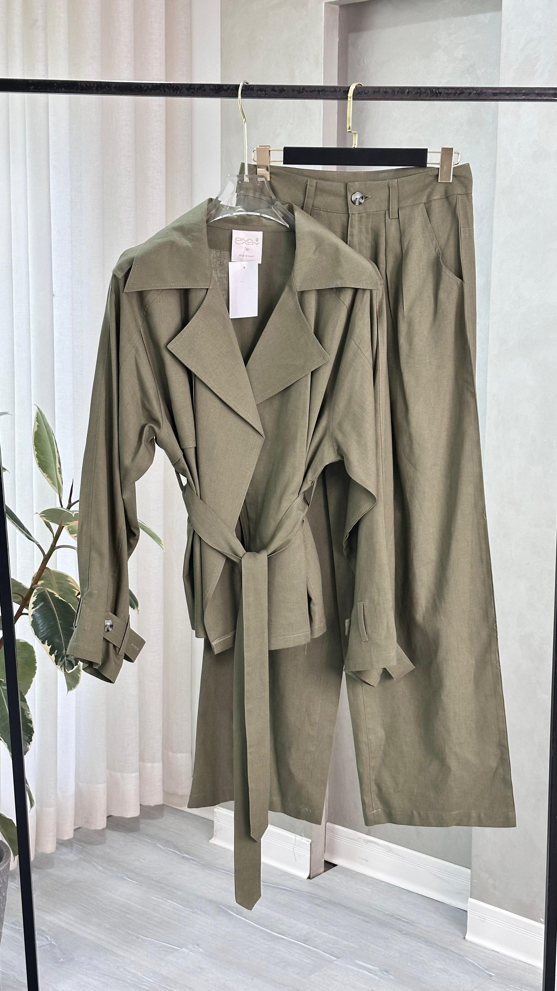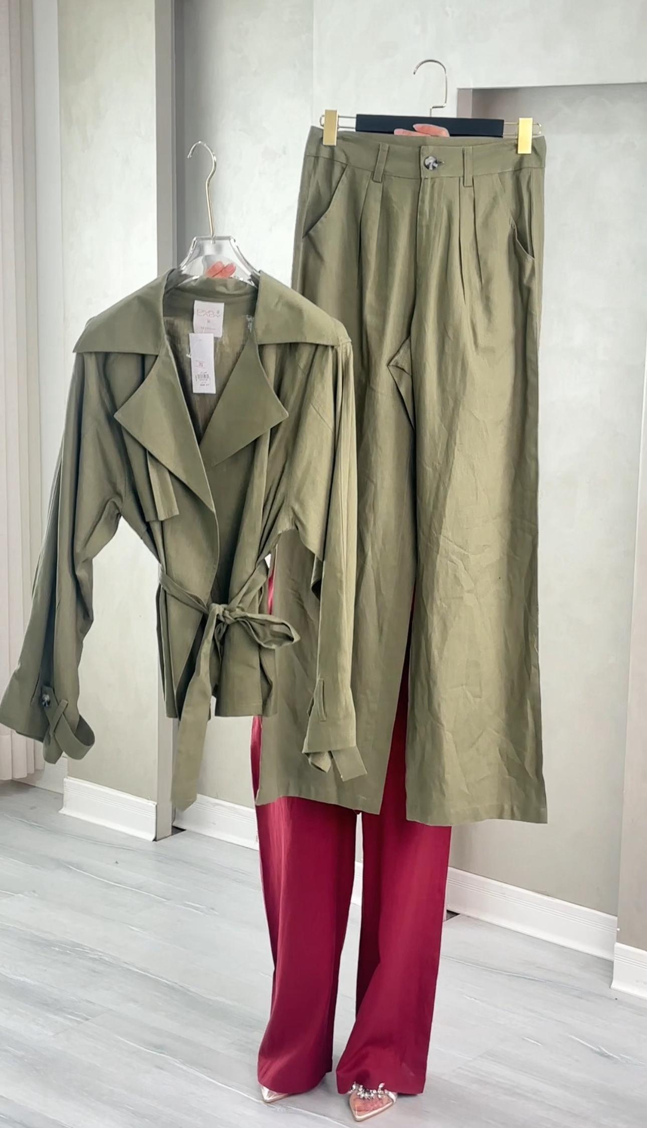 طقم نسائي أنيق يناسب الإطلالات الرسمية والكاجوال الراقية، يتكون من معطف طويل بتصميم كلاسيكي مع ياقة عريضة وحزام خصر يضفي لمسة أنثوية جذابة، بالإضافة إلى بنطال واسع بخصر مرتفع يمنحك مظهرًا عصريًا وانسيابيًا. خامة خفيفة ومريحة، مثالي للموسم الانتقالي والمناسبات العملية.
