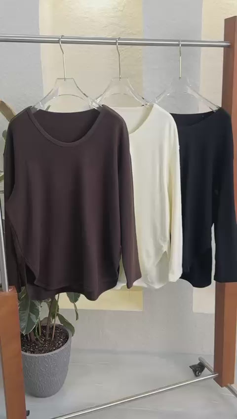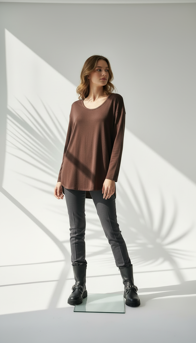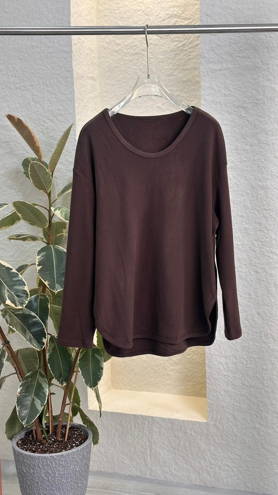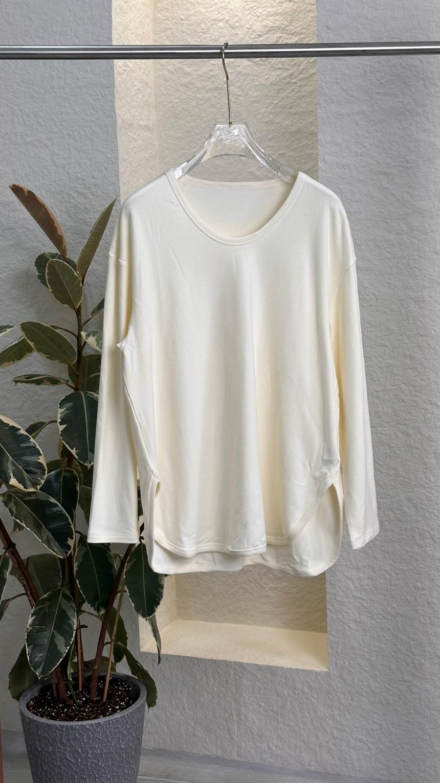 بلوزة بأكمام طويلة بتصميم بسيط، مصممة لراحة لا مثيل لها وتعدد استخدامات عصري. مصنوعة من قماش ناعم وخفيف الوزن، تتميز بتصميم مريح مع ثنيات رقيقة وياقة مستديرة. تضيف الحافة غير المتماثلة لمسة من الأناقة العملية، مما يجعلها مثالية للارتداء مع طبقات أو بشكل مستقل في أي موسم.