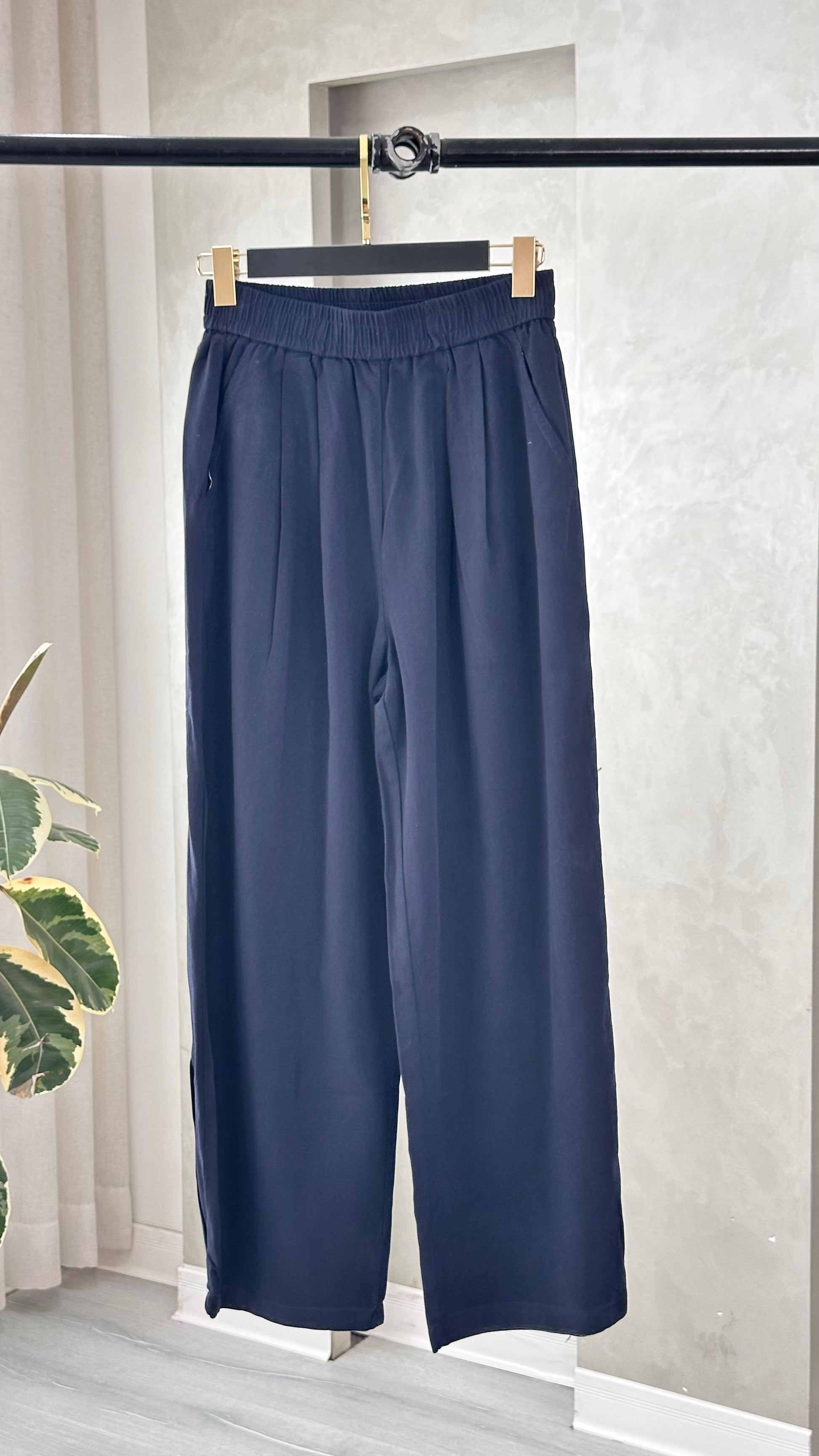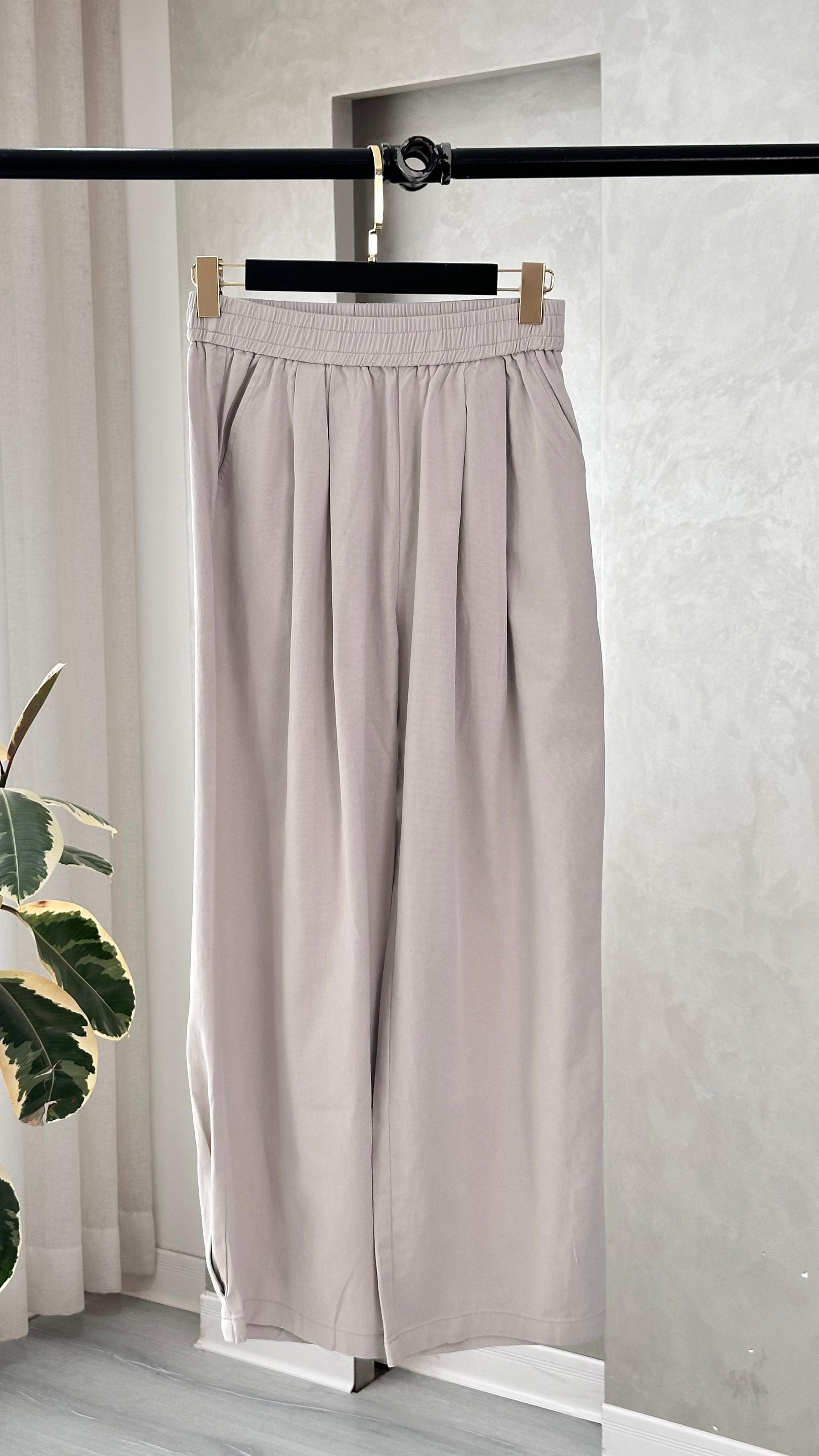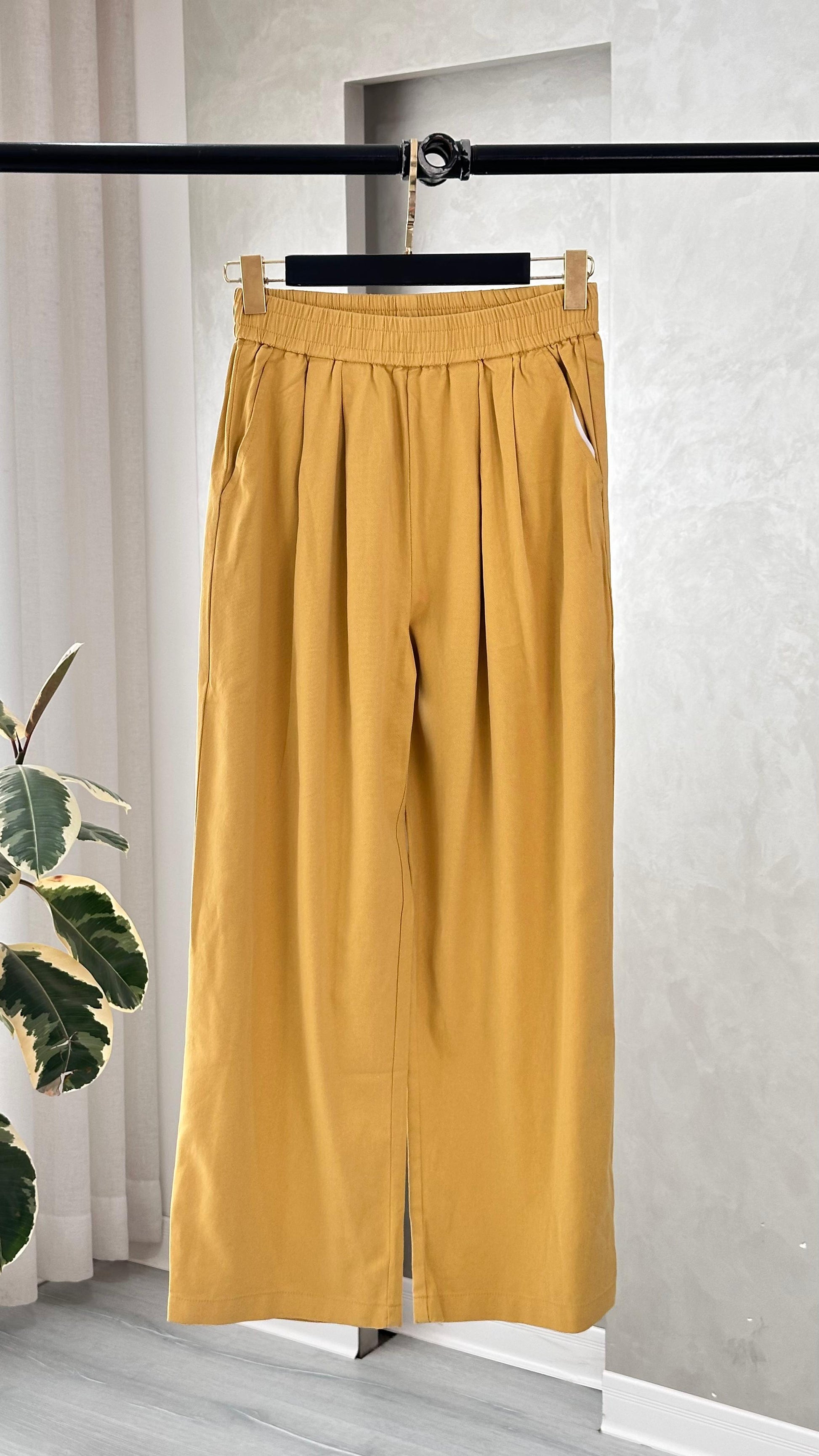 البنطال واسع الأرجل، مصنوع من خامة خفيفة ذات ملمس ناعم، ويتميّز بخصر مطاطي مع طيات مجمّعة في الجزء العلوي تمنح مظهرًا مريحًا وفضفاضًا. في أسفل كل ساق توجد فتحة صغيرة في المنتصف تضيف تفصيلًا بسيطًا إلى التصميم. القصّة توحي بالبساطة والعملية، وتناسب الإطلالات اليومية أو التنسيقات الهادئة.