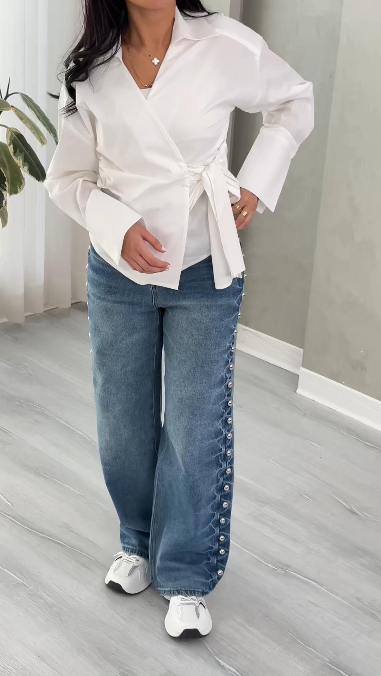 البنطال مصنوع من قماش الجينز، بقصة واسعة تنسدل بانسيابية من الخصر حتى الأرض. يتميز بتفصيل فريد على جانبي الساقين: صف من الأزرار المعدنية يمتد من أعلى الفخذ حتى الأسفل، مما يضفي لمسة عصرية ولافتة. لا تظهر عليه تطريزات أو زخارف إضافية، ويبدو مصممًا بأسلوب بسيط يركّز على التفاصيل الجانبية كعنصر جمالي أساسي. القماش سميك نسبياً، مما يمنح البنطال بنية واضحة ومظهرًا متماسكًا.