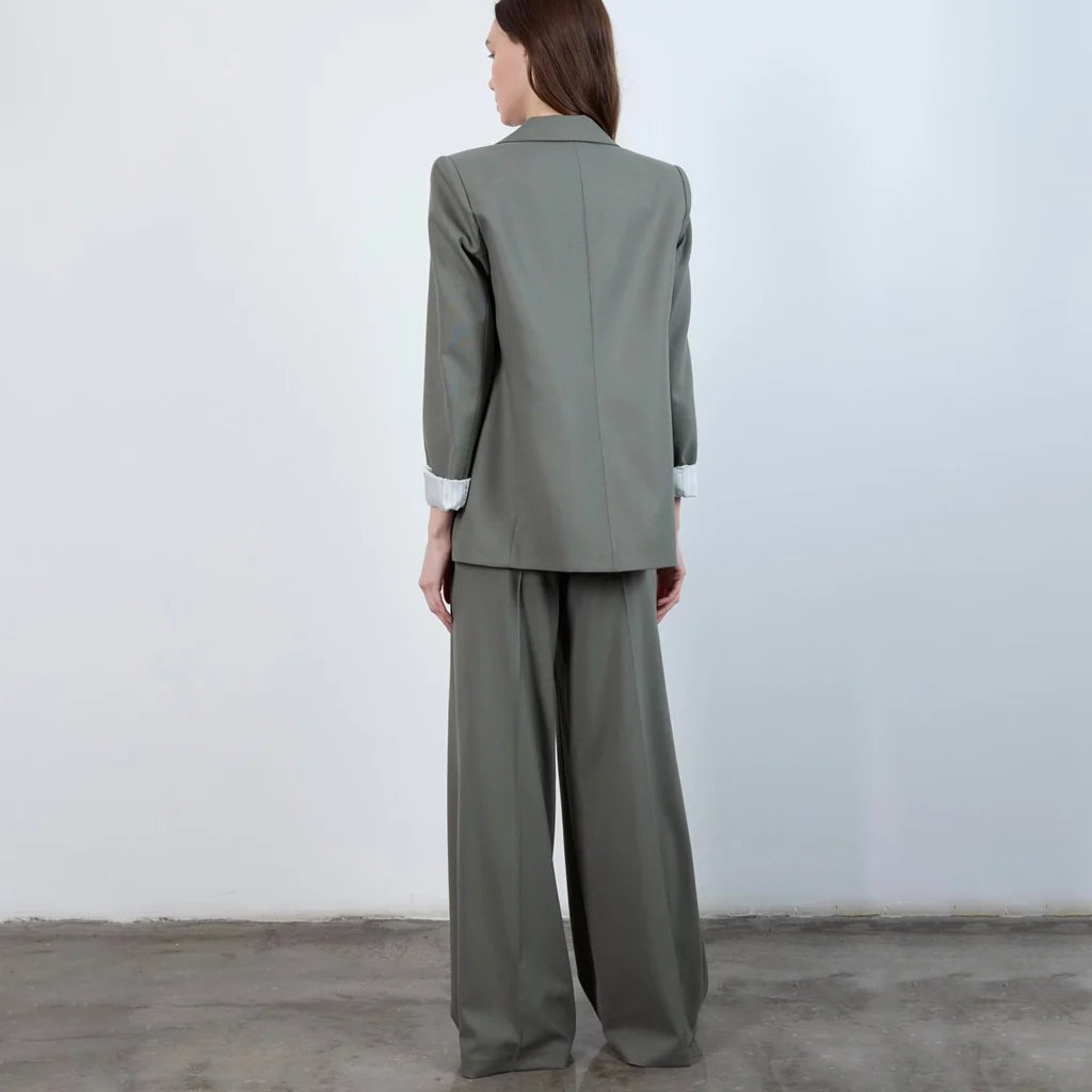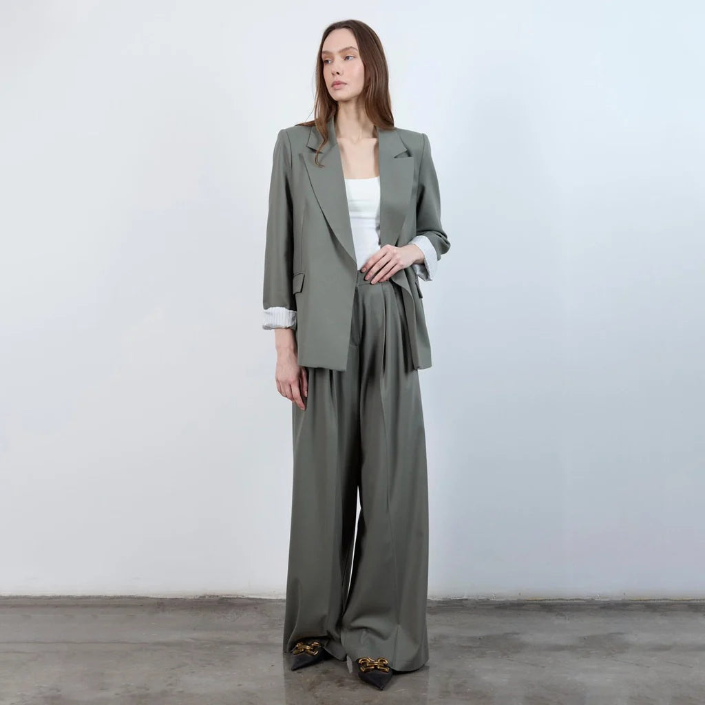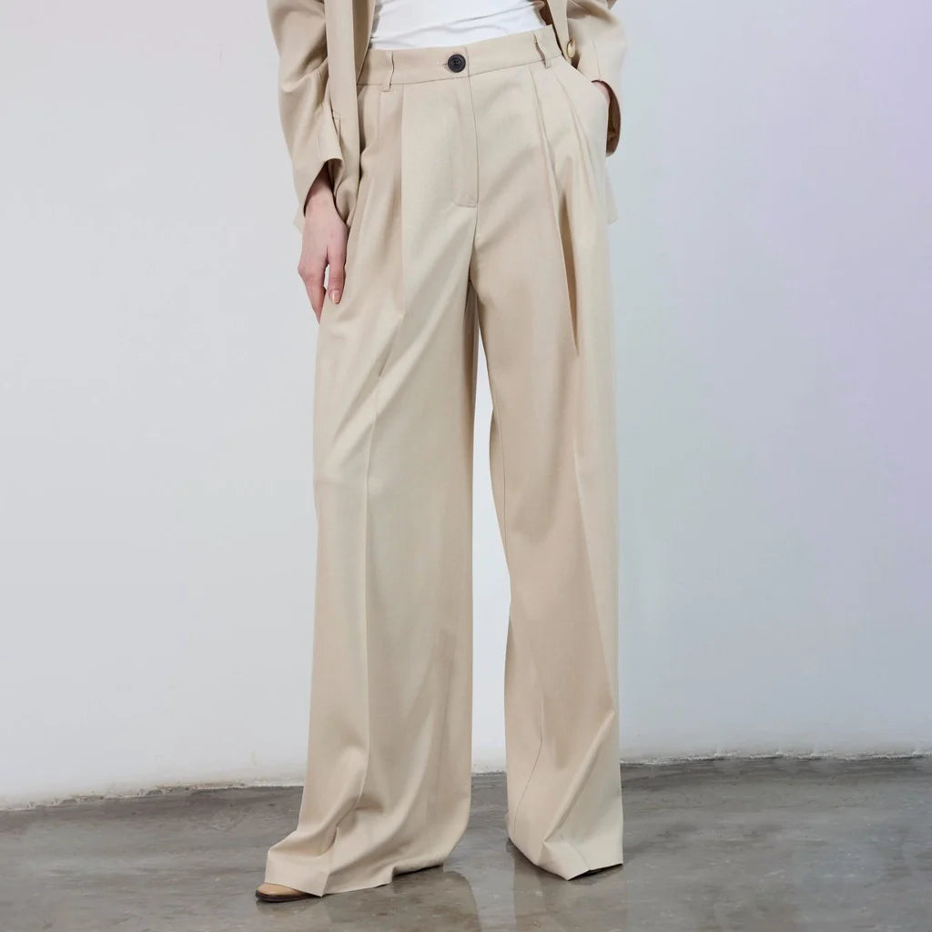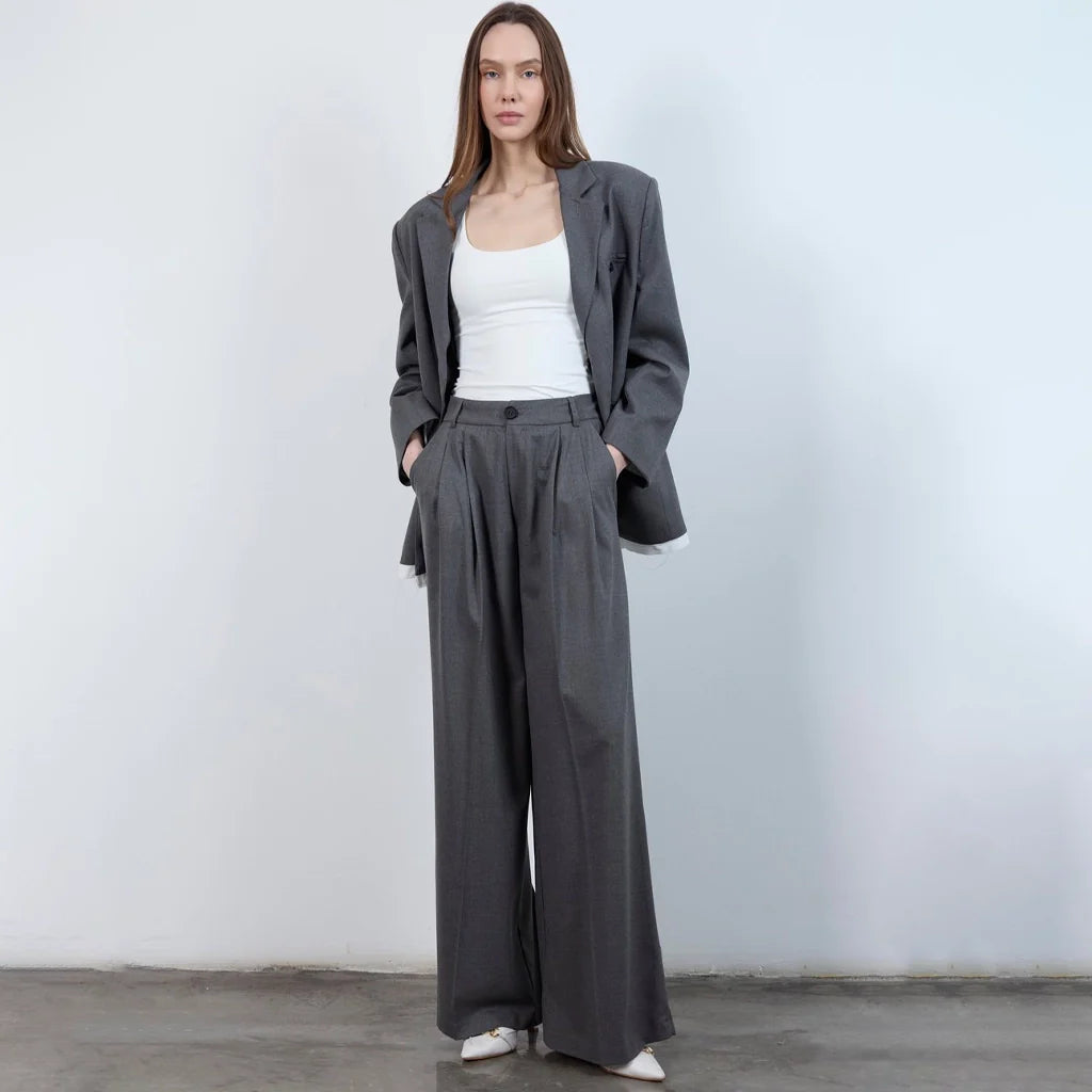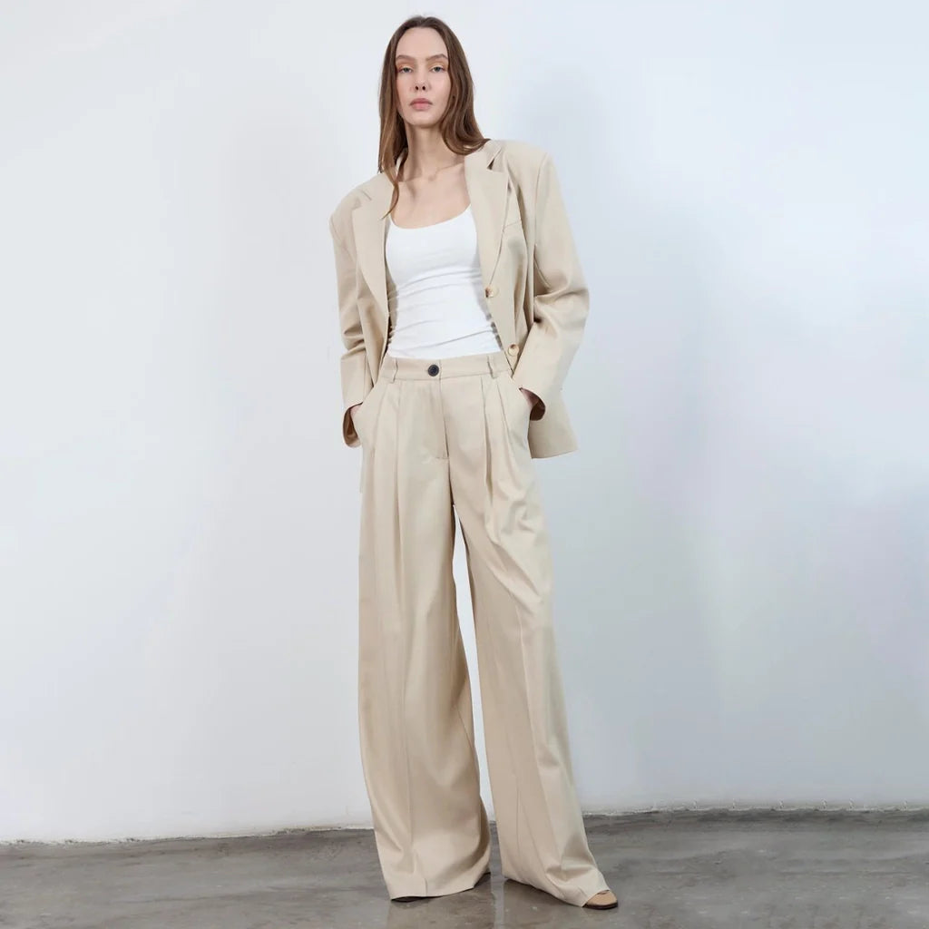 - **القطعة السفلية**: بنطال واسع الأرجل بخصر مرتفع، مزود بثنيات أمامية تضيف حجماً وانسيابية إلى التصميم. القصة تعكس طابعاً عصرياً أنيقاً، وتمنح مظهراً متناسقاً عند ارتداء البلوزة بداخله.