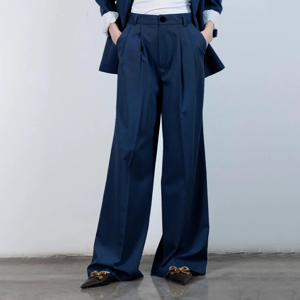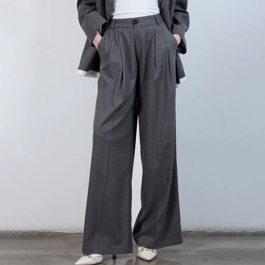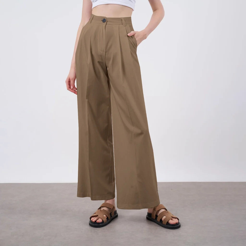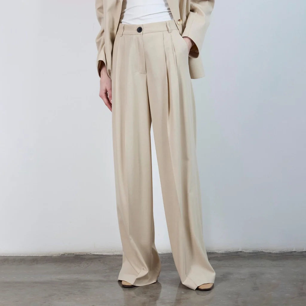 - **القطعة السفلية**: بنطال واسع الأرجل بخصر مرتفع، مزود بثنيات أمامية تضيف حجماً وانسيابية إلى التصميم. القصة تعكس طابعاً عصرياً أنيقاً، وتمنح مظهراً متناسقاً عند ارتداء البلوزة بداخله.