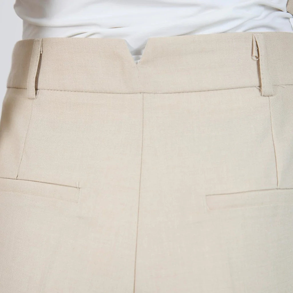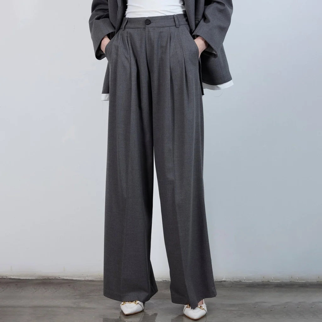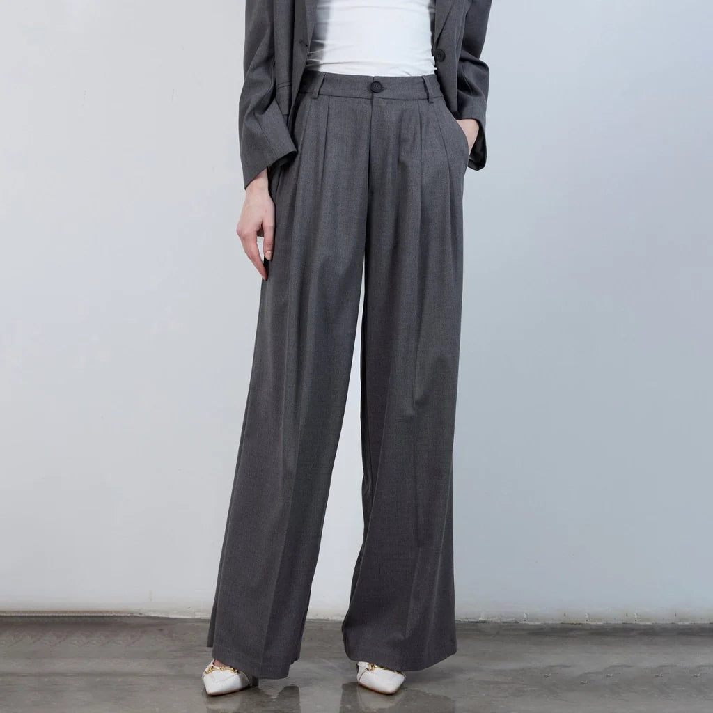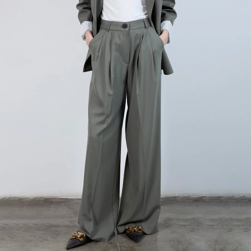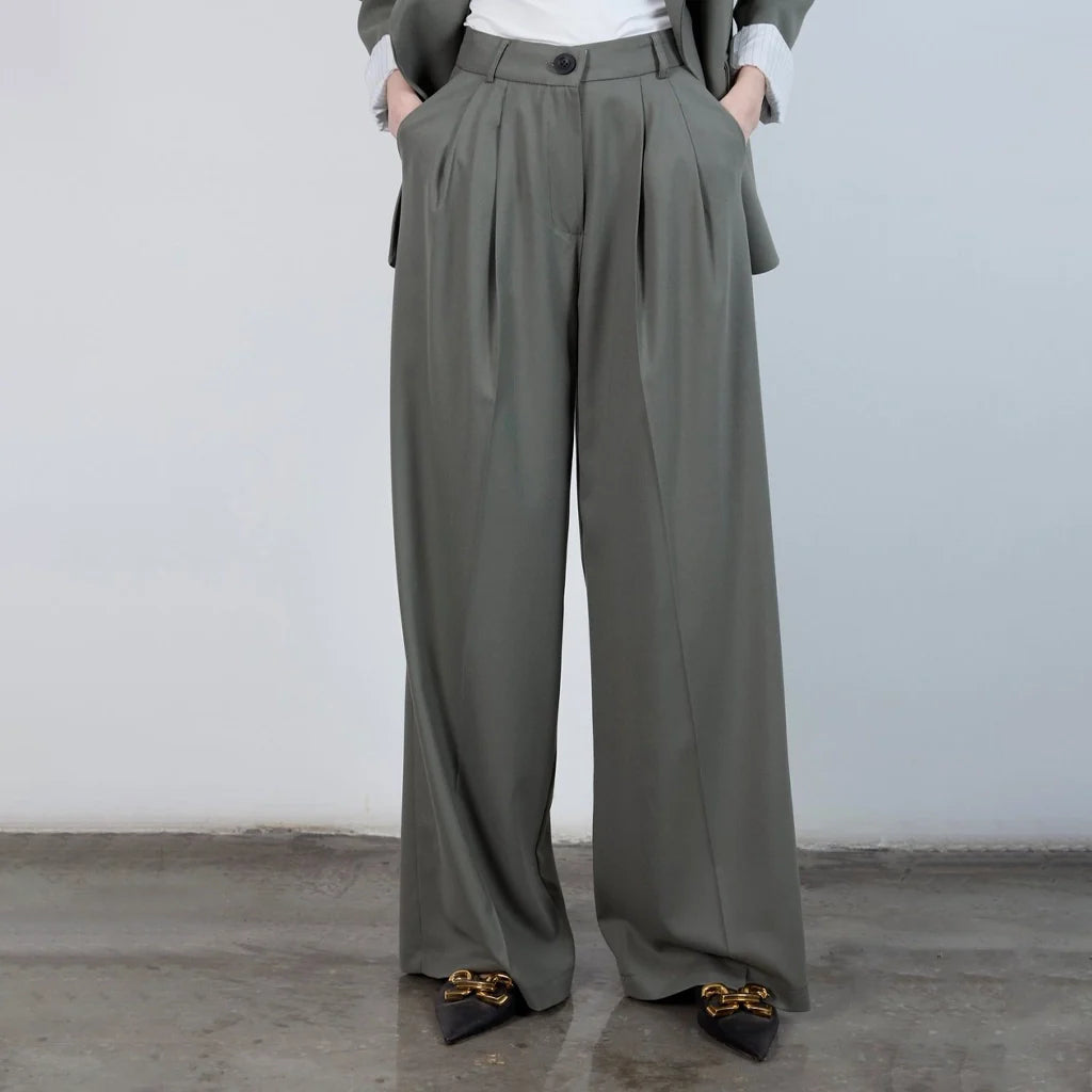 - **القطعة السفلية**: بنطال واسع الأرجل بخصر مرتفع، مزود بثنيات أمامية تضيف حجماً وانسيابية إلى التصميم. القصة تعكس طابعاً عصرياً أنيقاً، وتمنح مظهراً متناسقاً عند ارتداء البلوزة بداخله.
