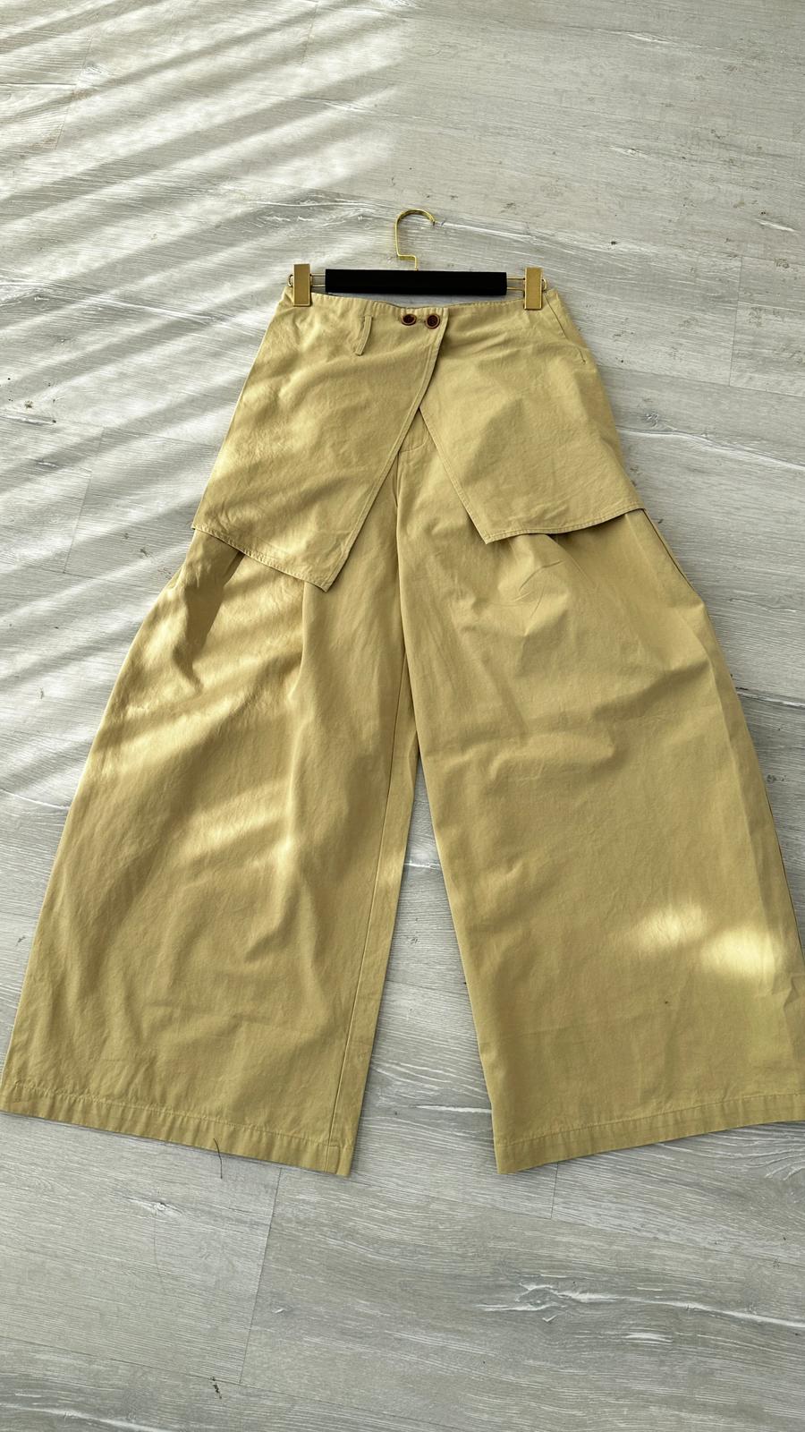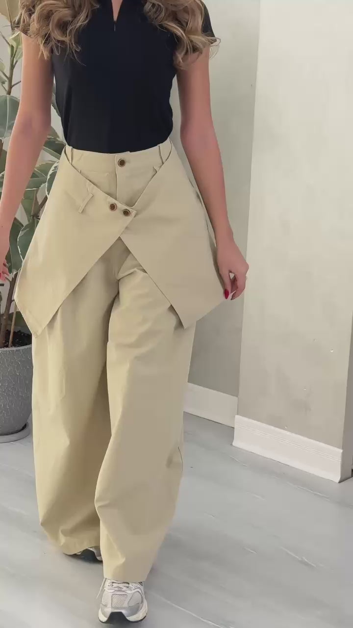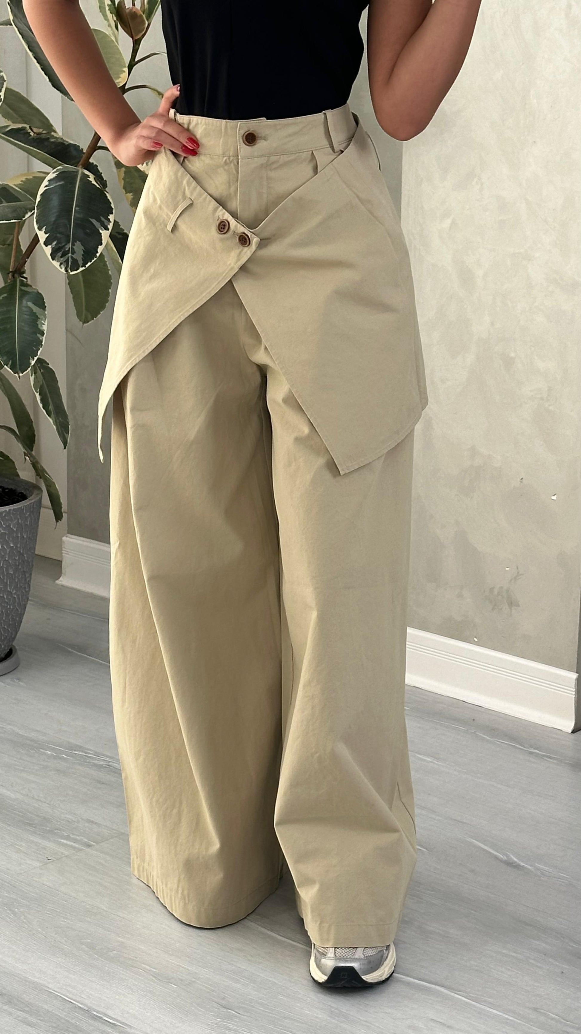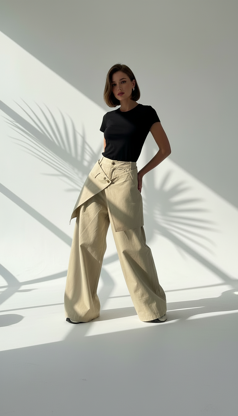 • البنطال واسع بقصّة مستقيمة تمتد من الخصر حتى الأسفل بشكل انسيابي.