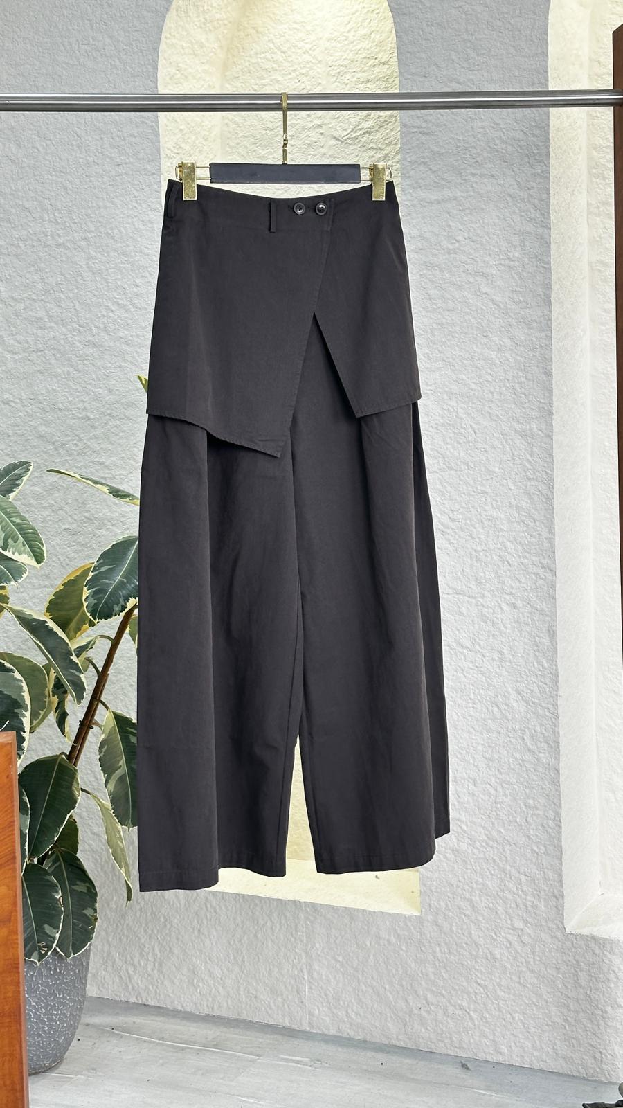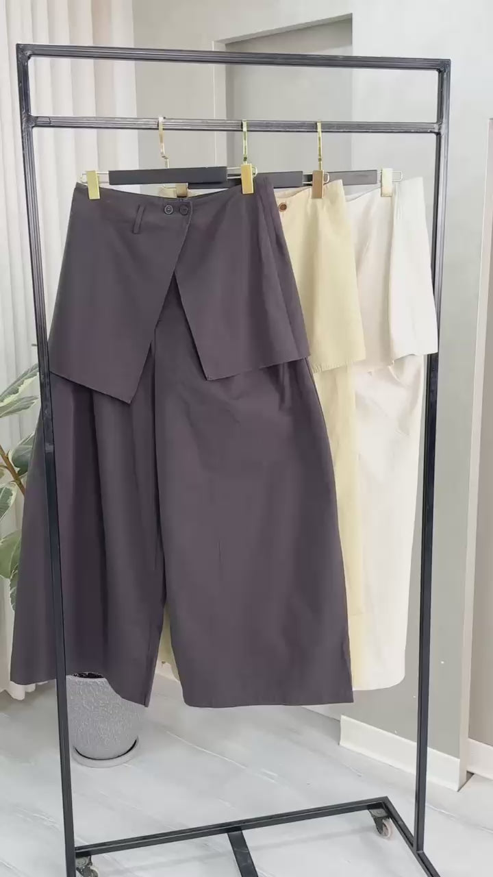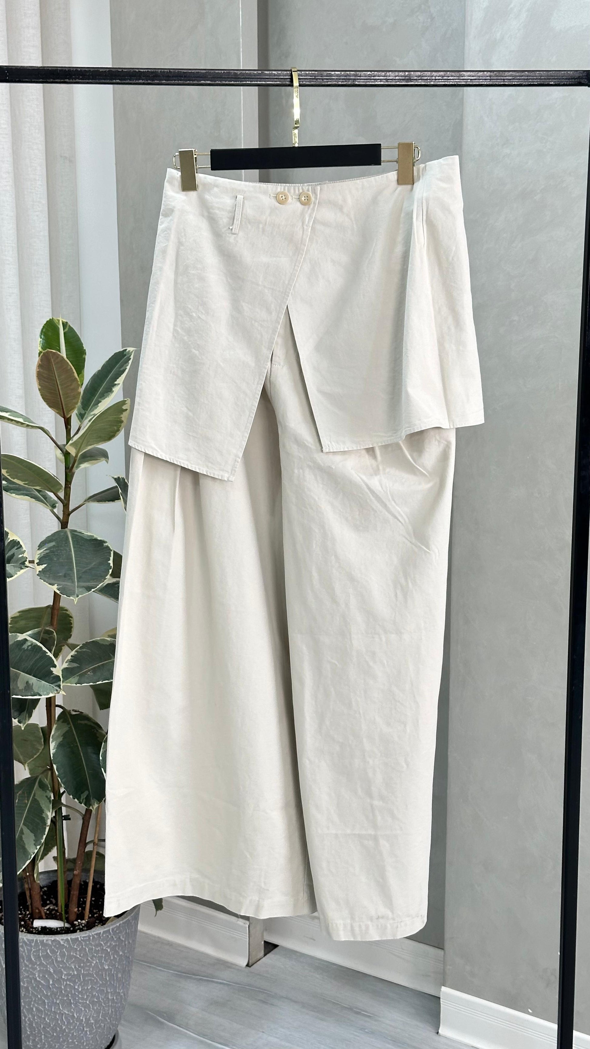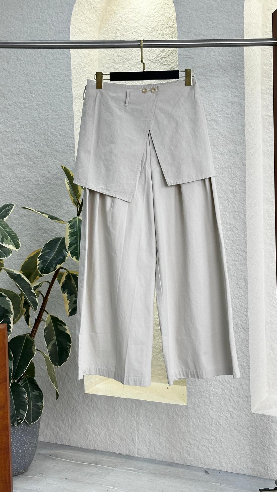 • الإطلالة تُظهر البنطال مع توب بلا أكمام، مما يبرز بساطته وأناقة خطه.