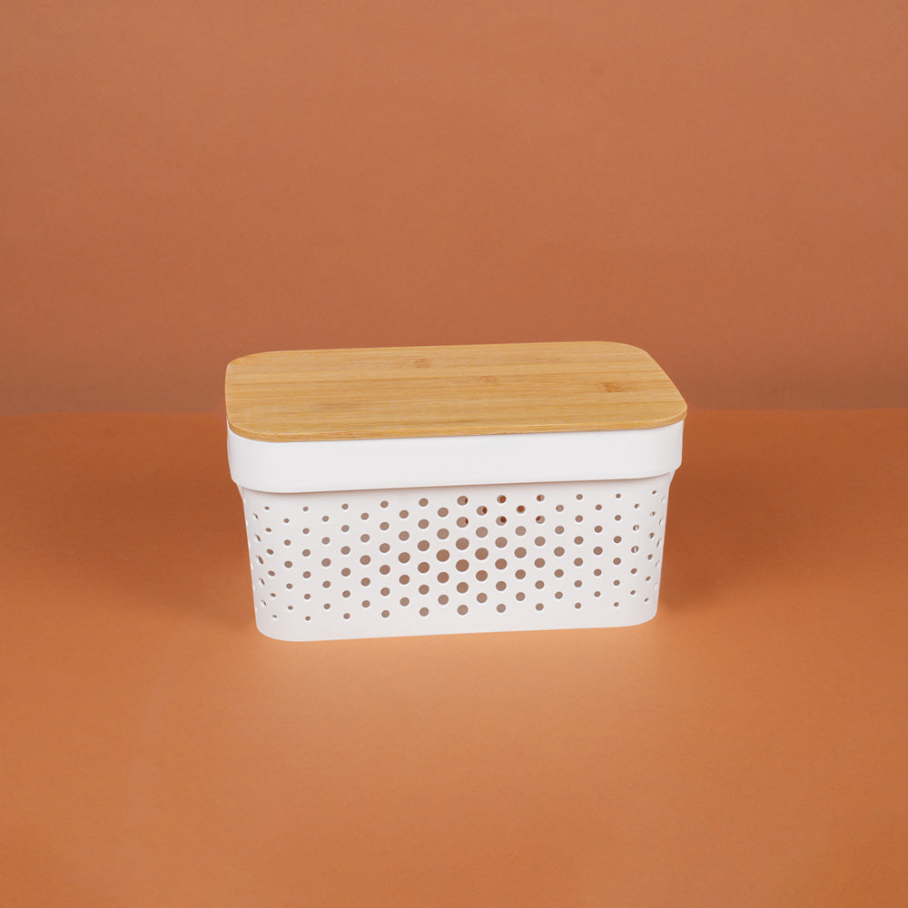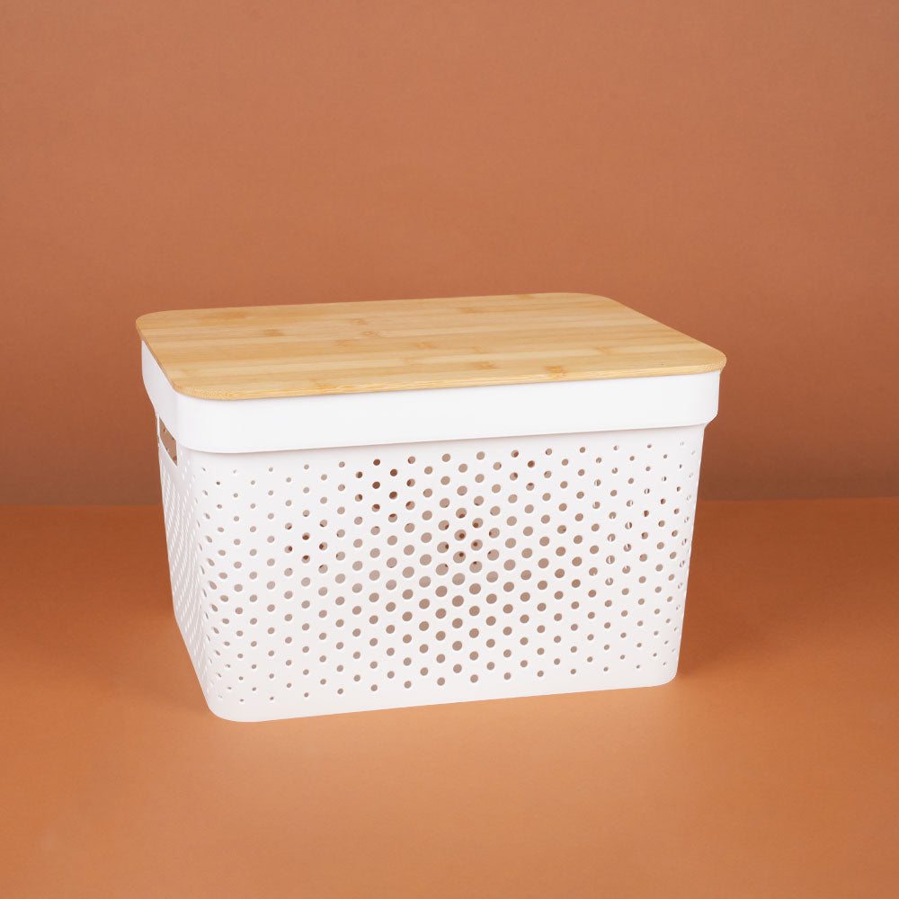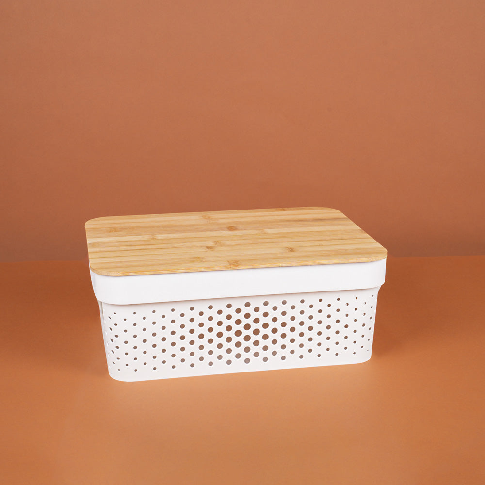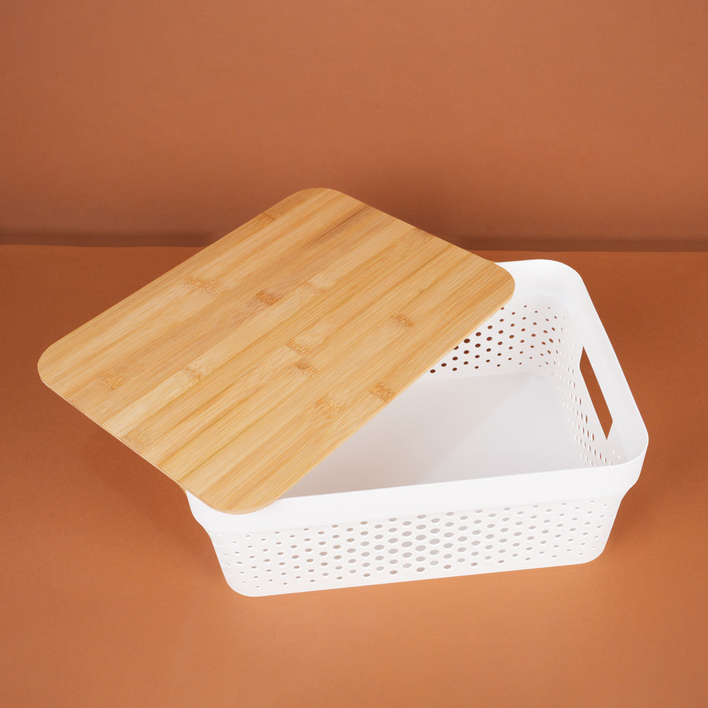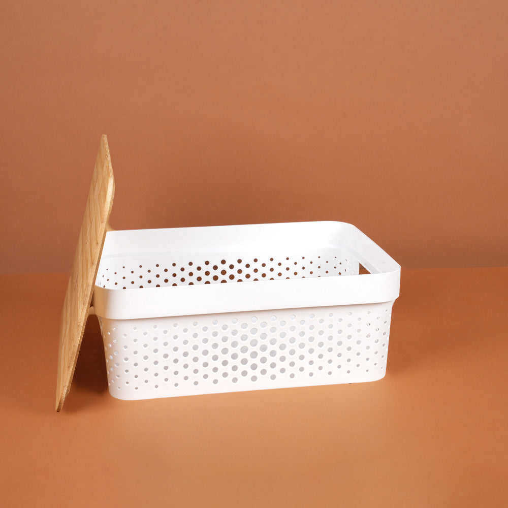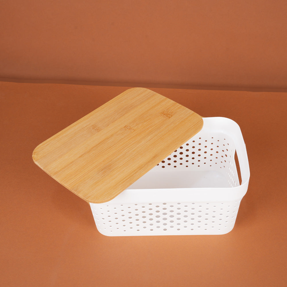 صندوق تخزين بلاستيكي بغطاء خشبي