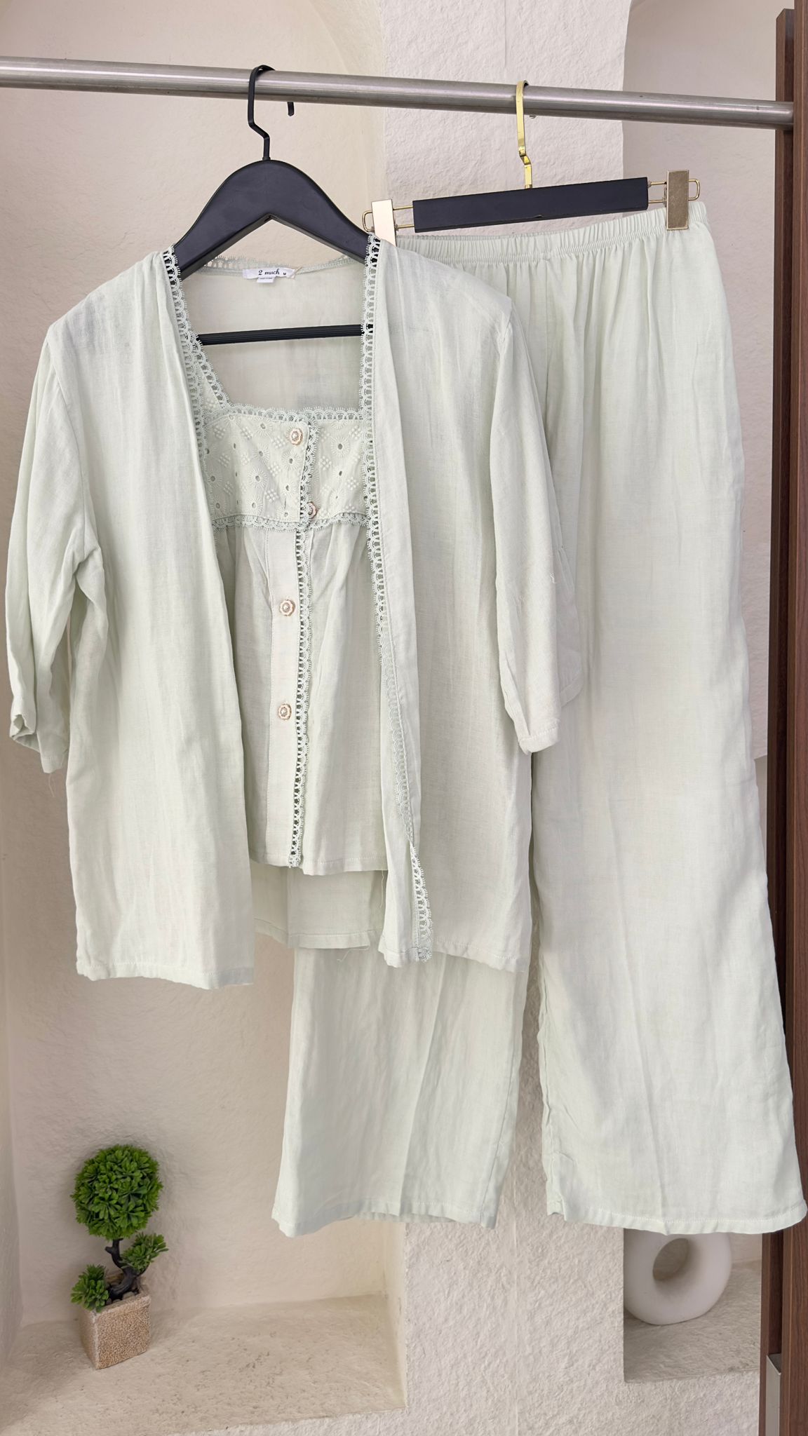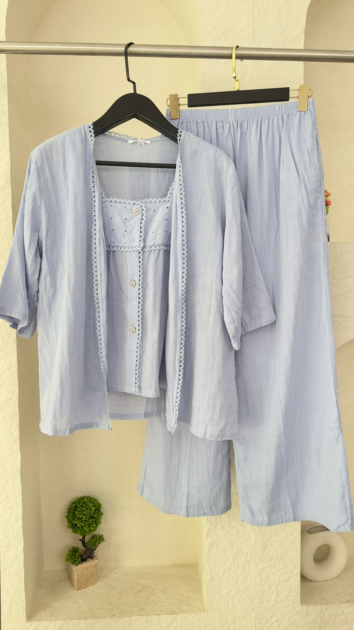 الطقم مكون من ثلاث قطع مريحة وفضفاضة المظهر: