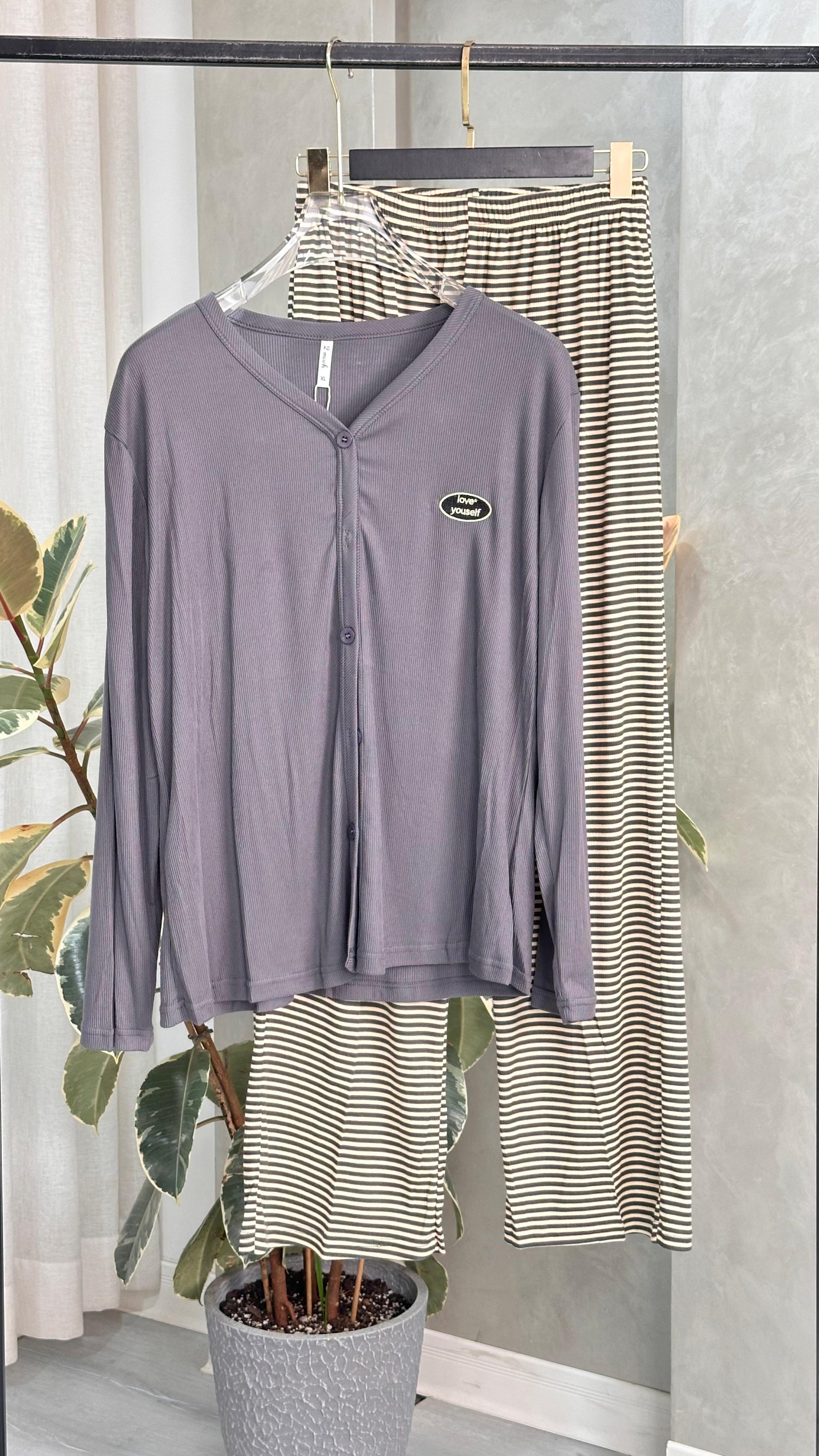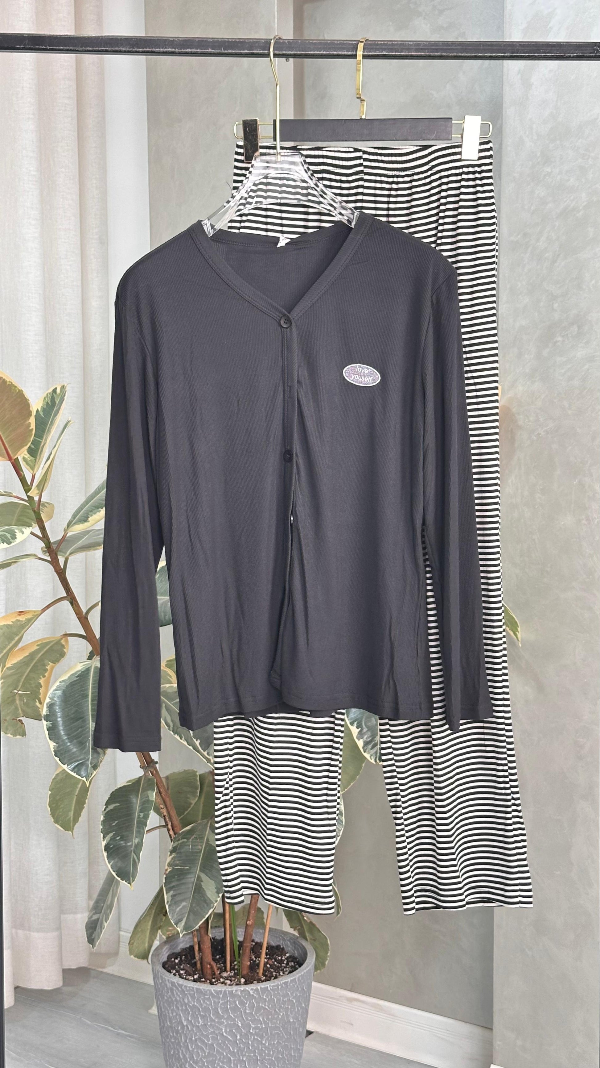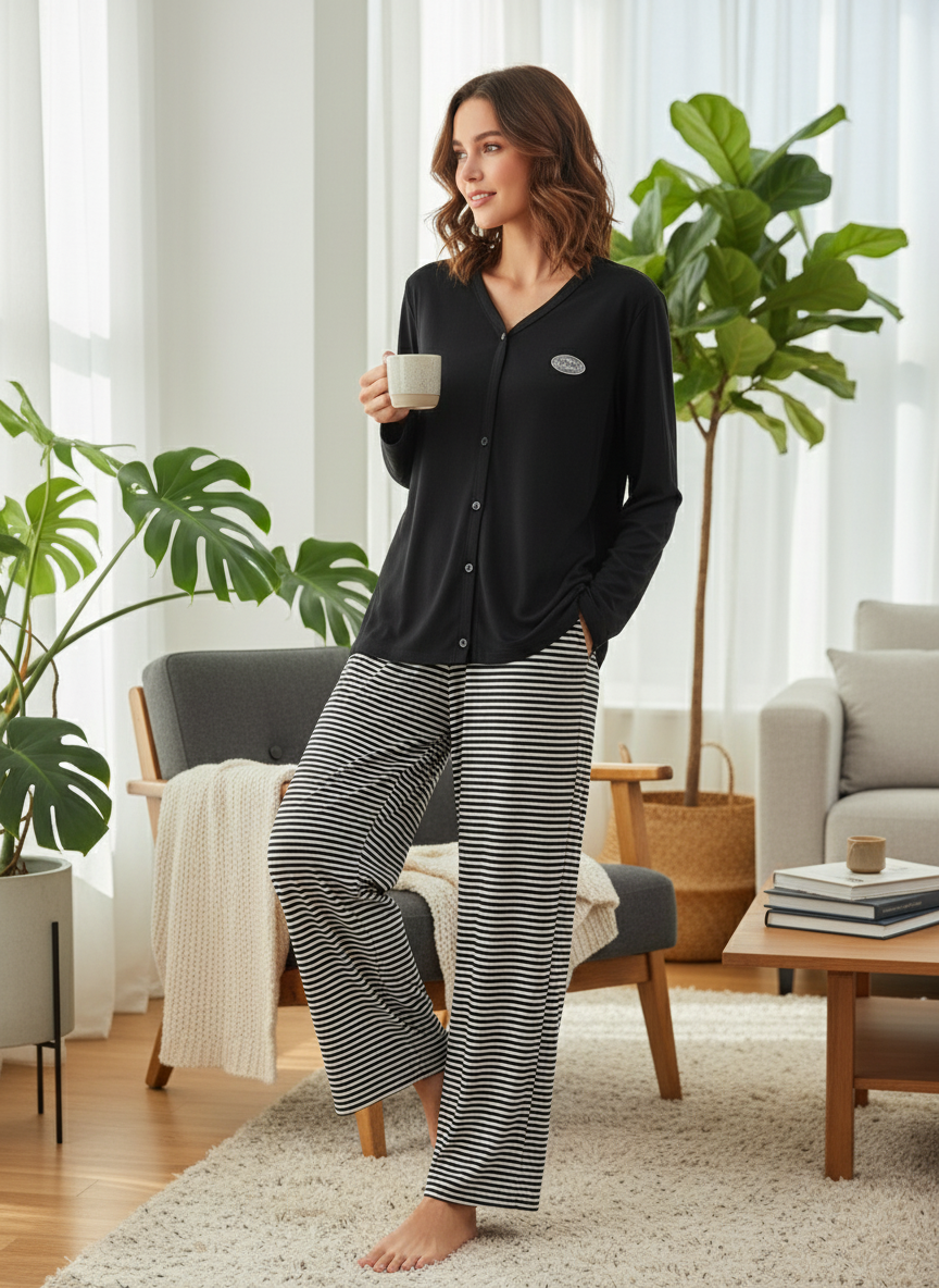 بيجامة نسائي بنطال عريض وكم طويل